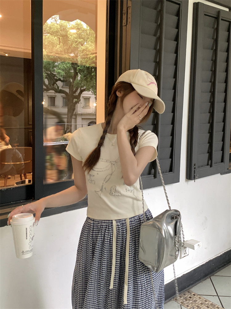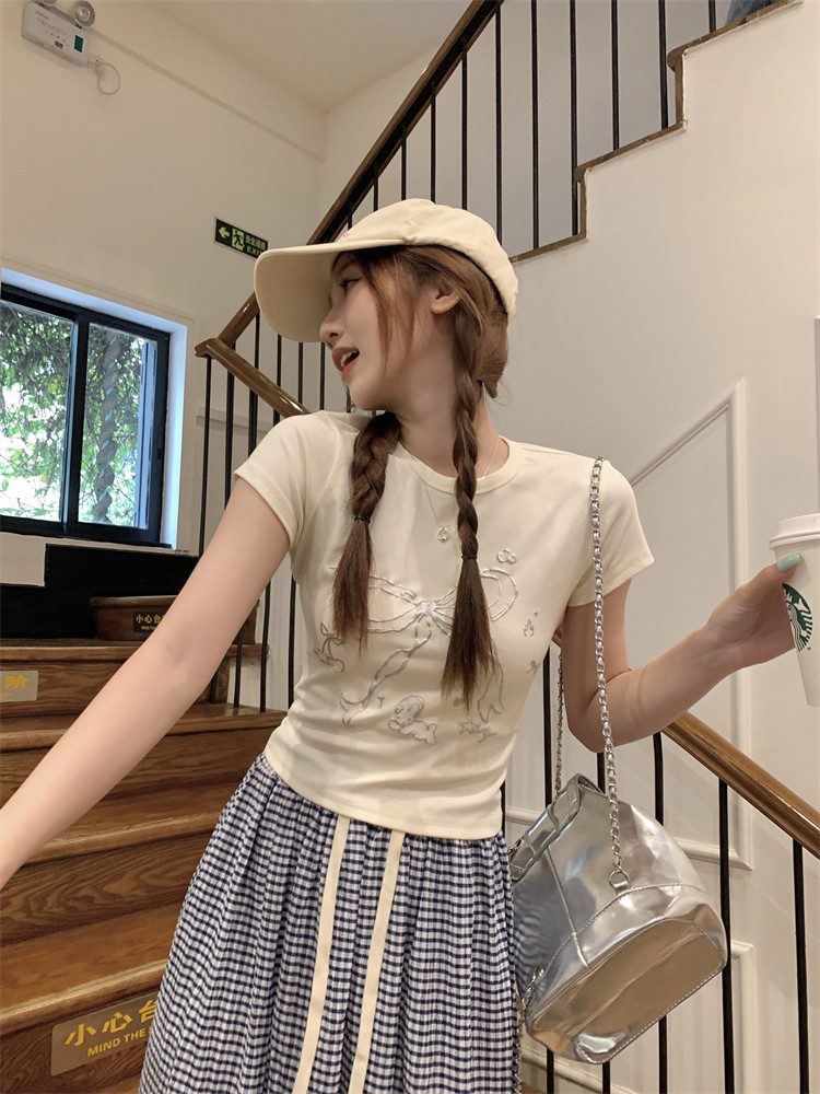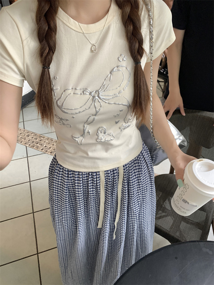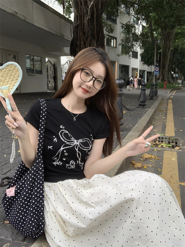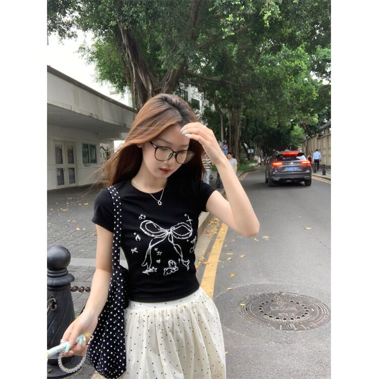 Летняя короткая футболка с коротким рукавом с бантиком с круглым воротником, подходит для подростков, по фигуре, облегающий крой