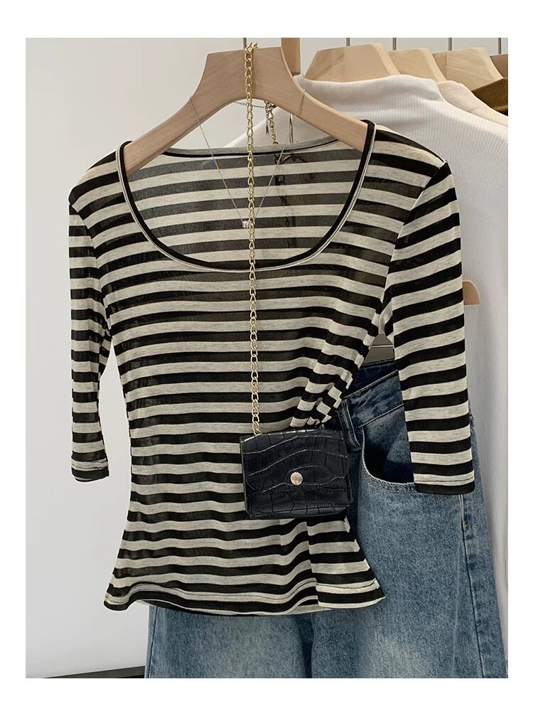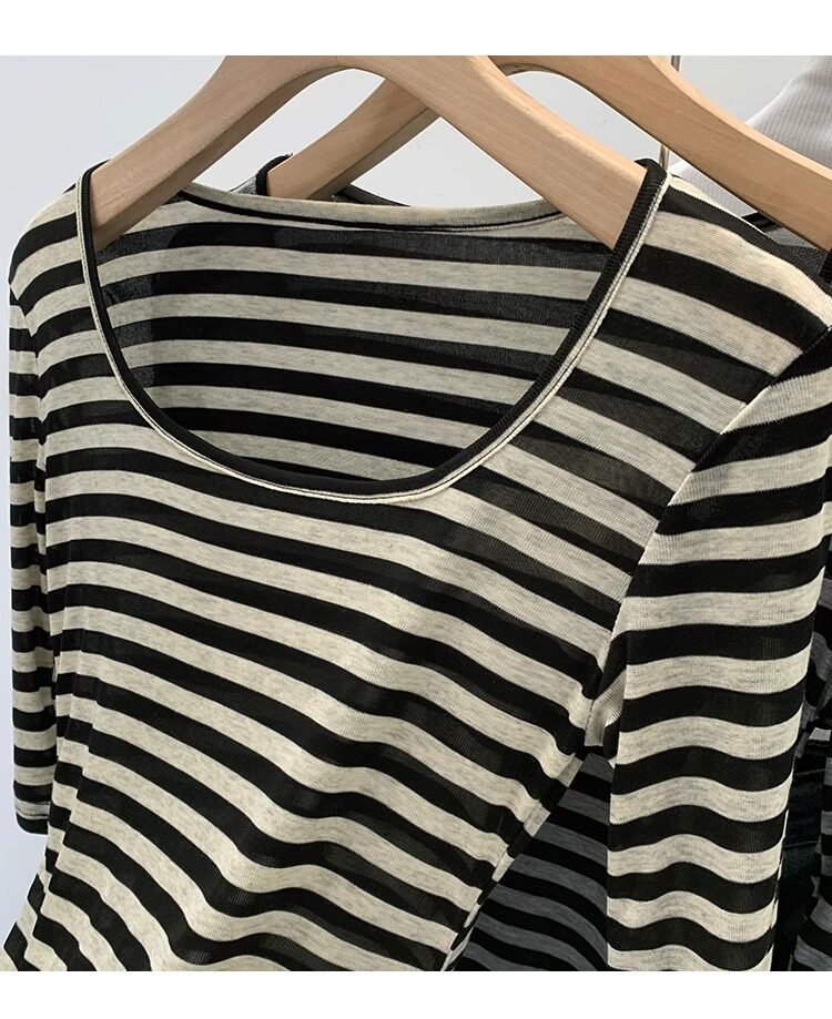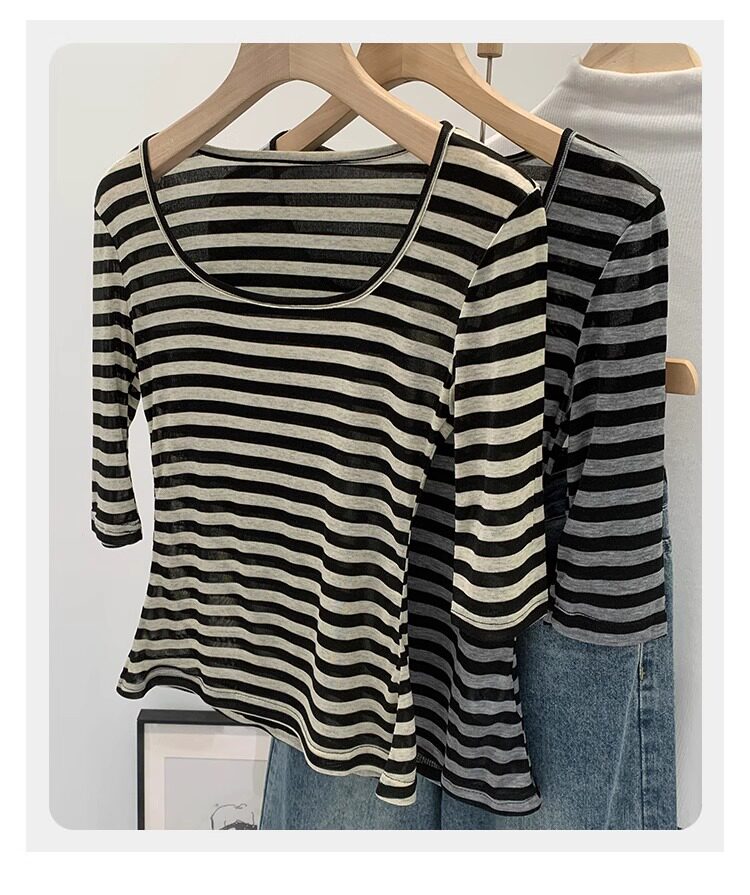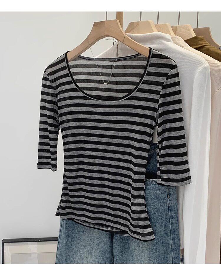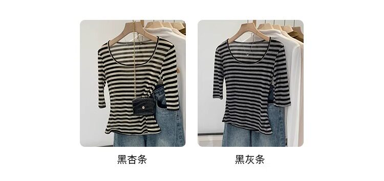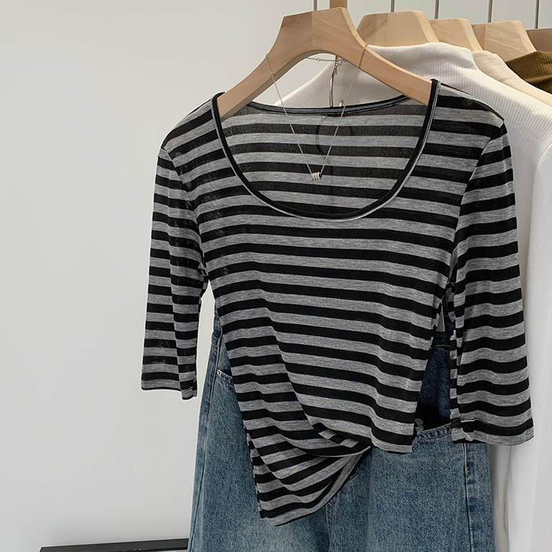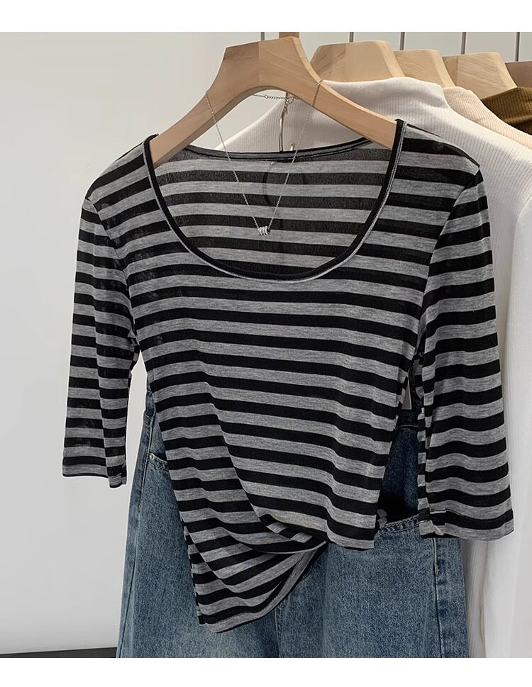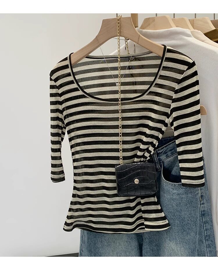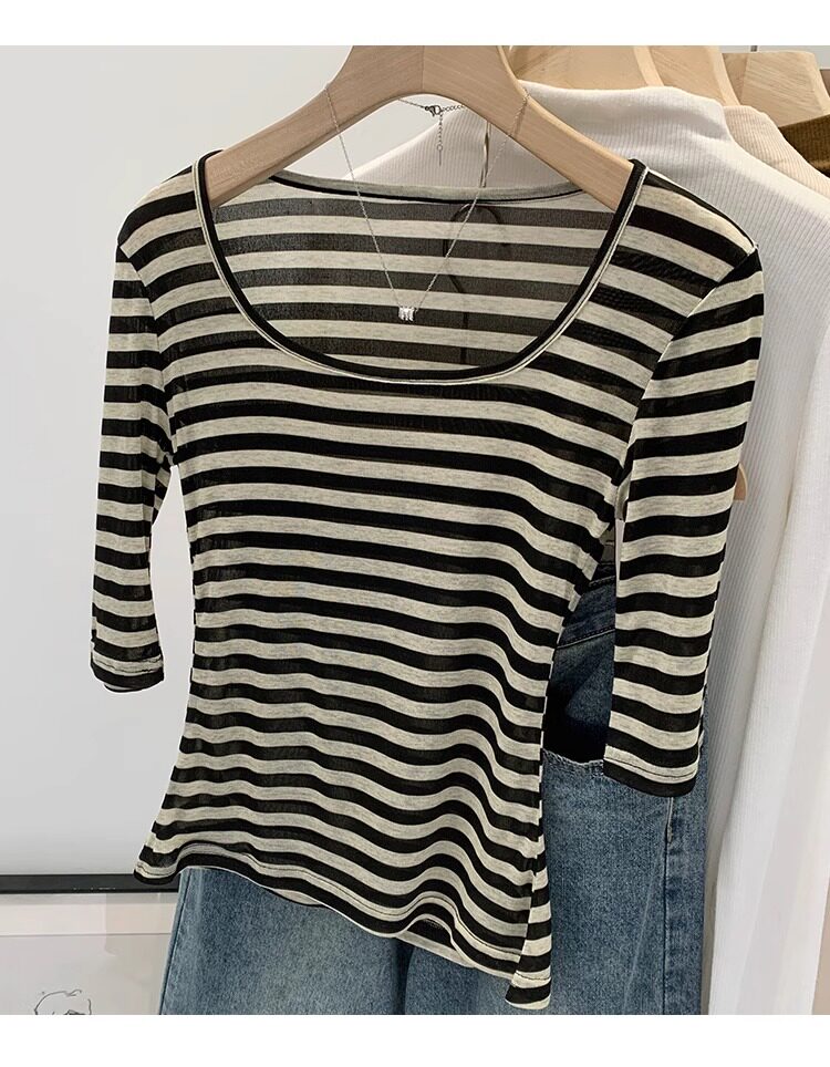 Женская футболка в полоску контрастного цвета с большим вырезом Sweet and Spicy, женская футболка из тенселя со средним рукавом, лето 2026, красивый облегающий маленький топ с протекающей ключицей