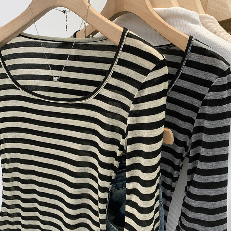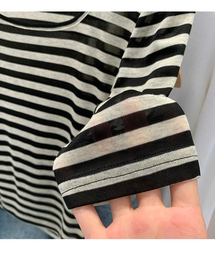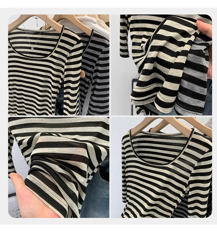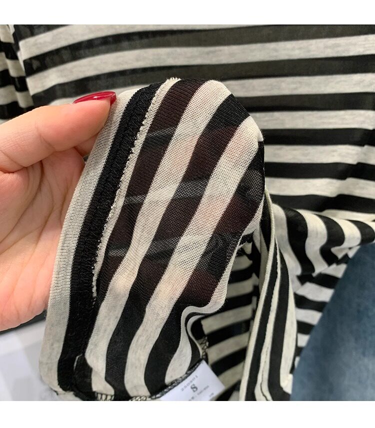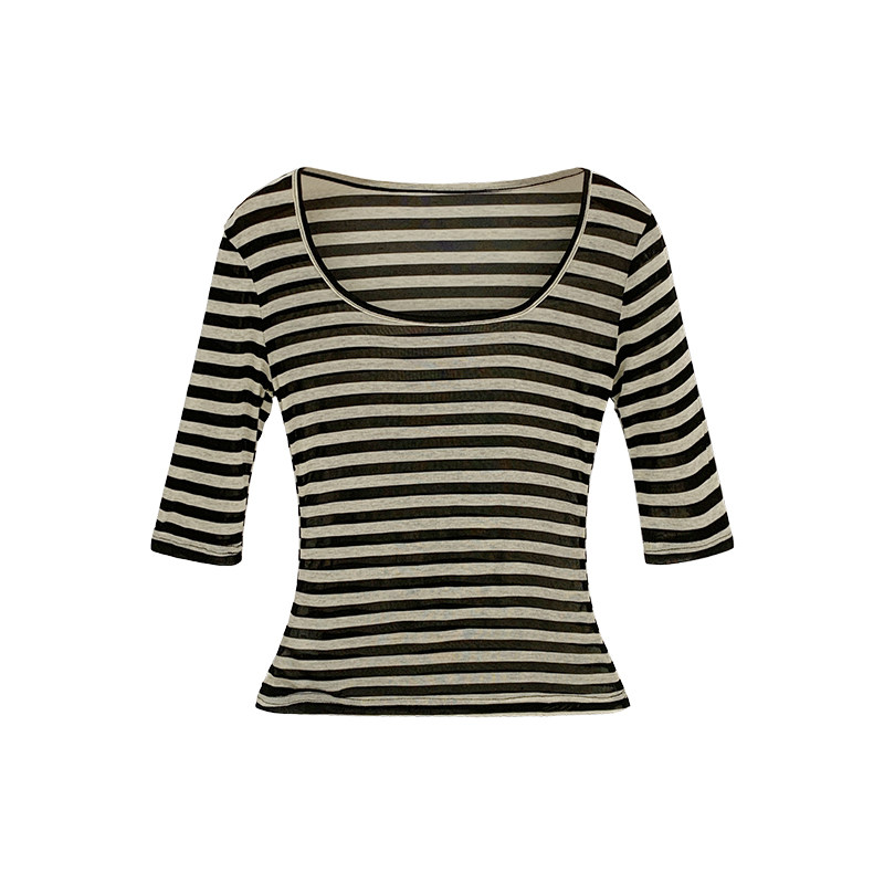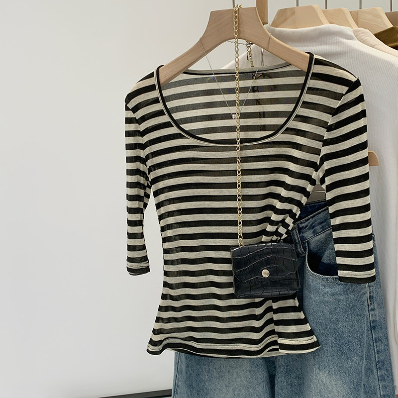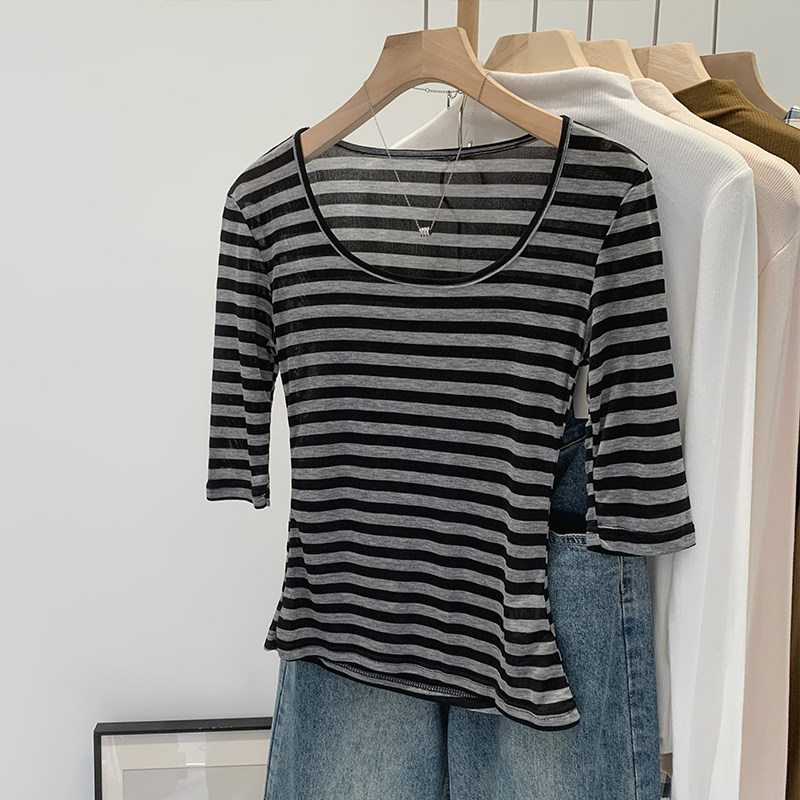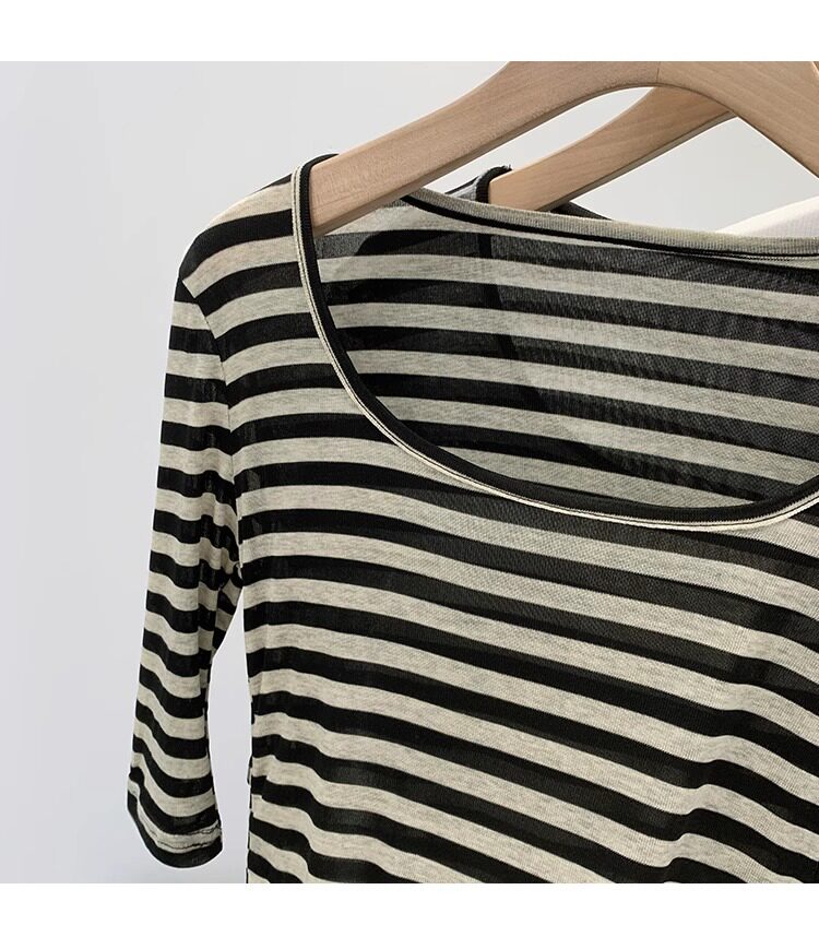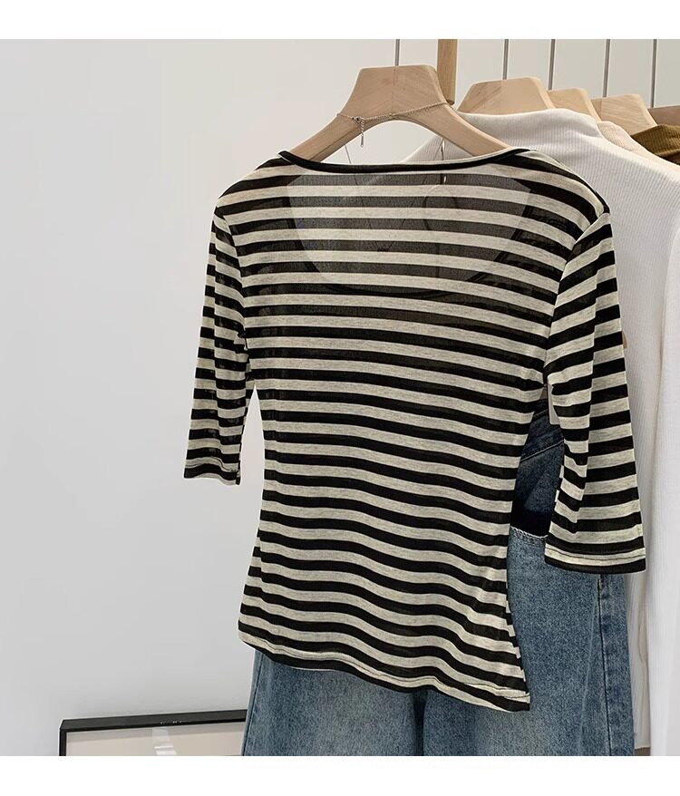 Женская футболка в полоску контрастного цвета с большим вырезом Sweet and Spicy, женская футболка из тенселя со средним рукавом, лето 2026, красивый облегающий маленький топ с протекающей ключицей