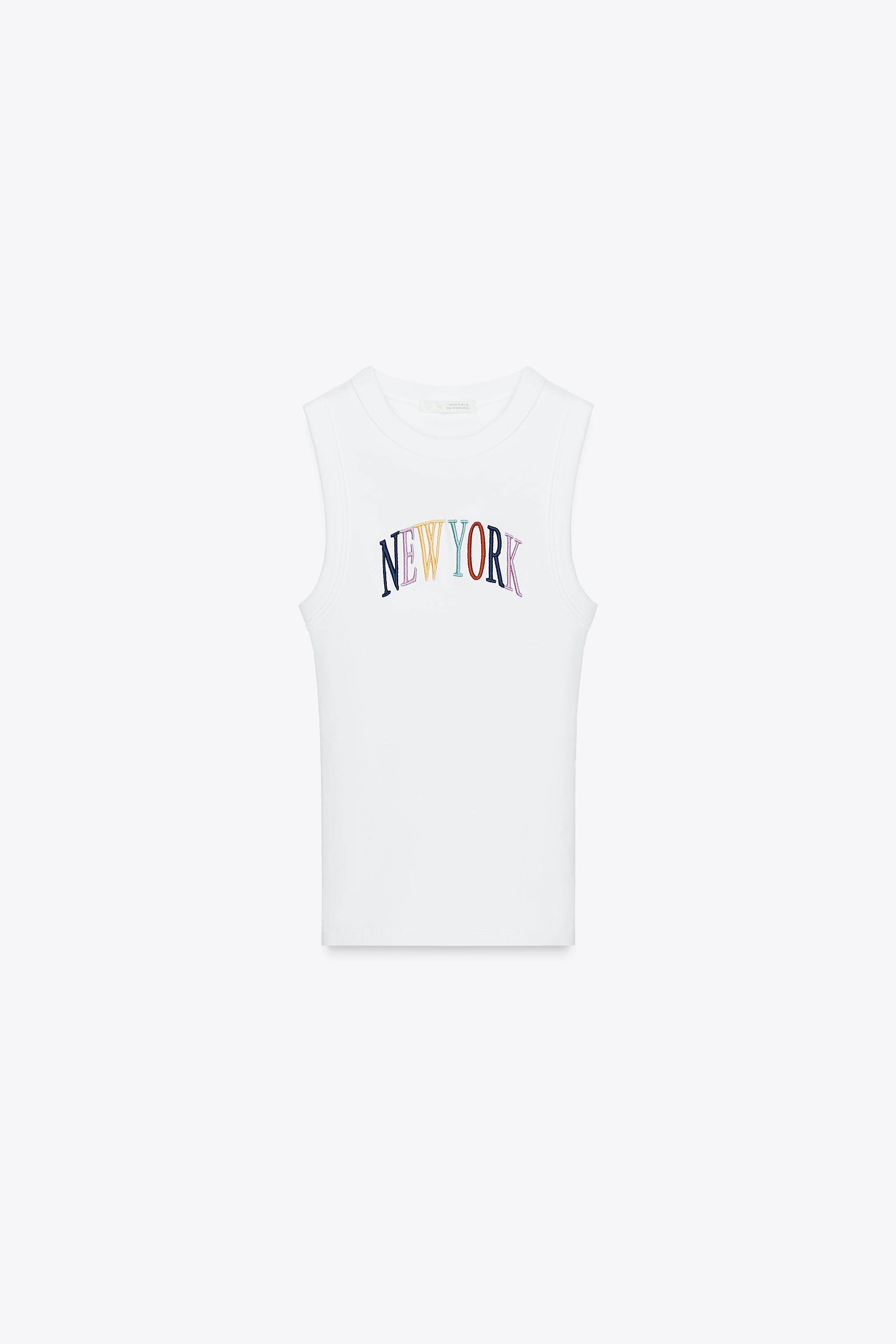 Круглый шейный топ без рукавов.Детали печатной вышивки спереди.