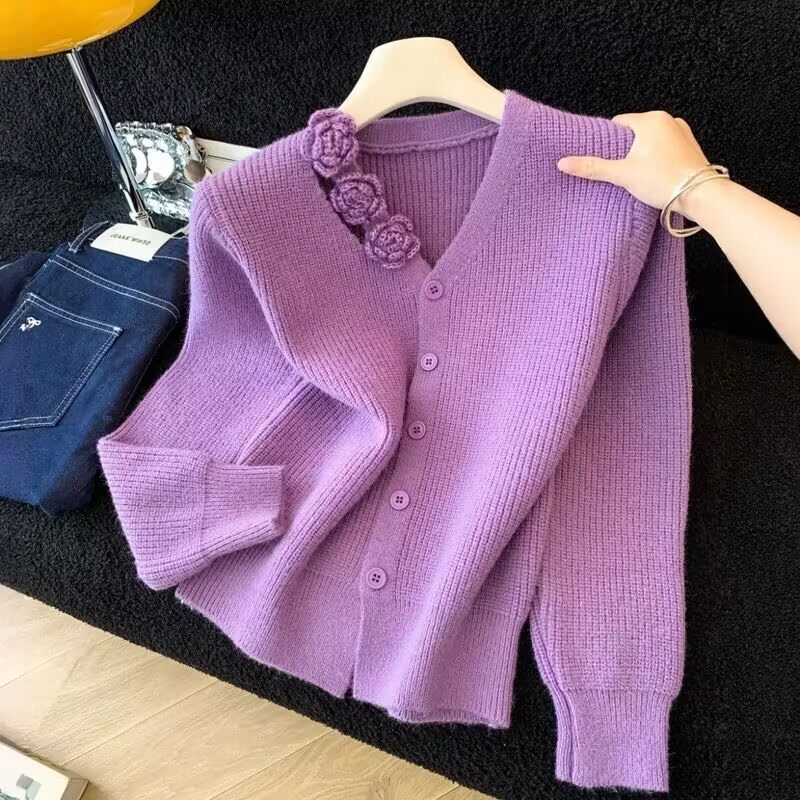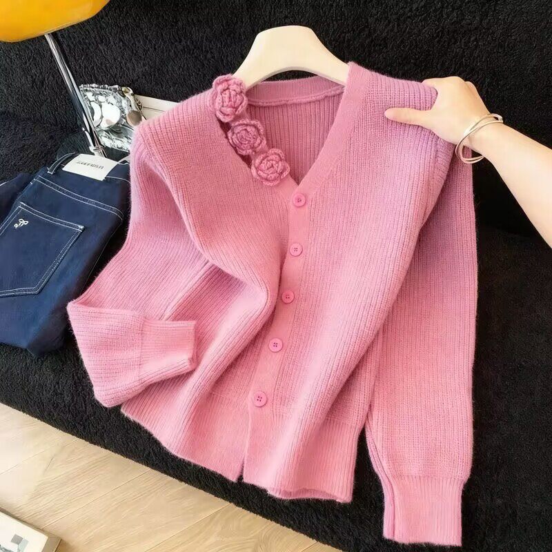 Трехмерный осенний демисезонный модный свитер, приталенный кардиган, в цветочек, увеличенная толщина, по фигуре
