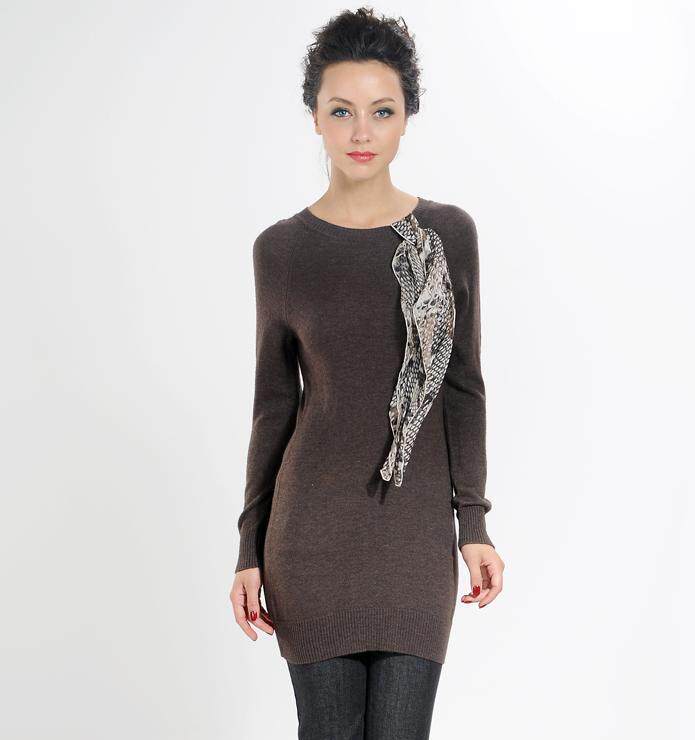 Шерстяной длинный приталенный базовый приятный телу однотонный кофейный свитер с круглым воротником, средней длины
