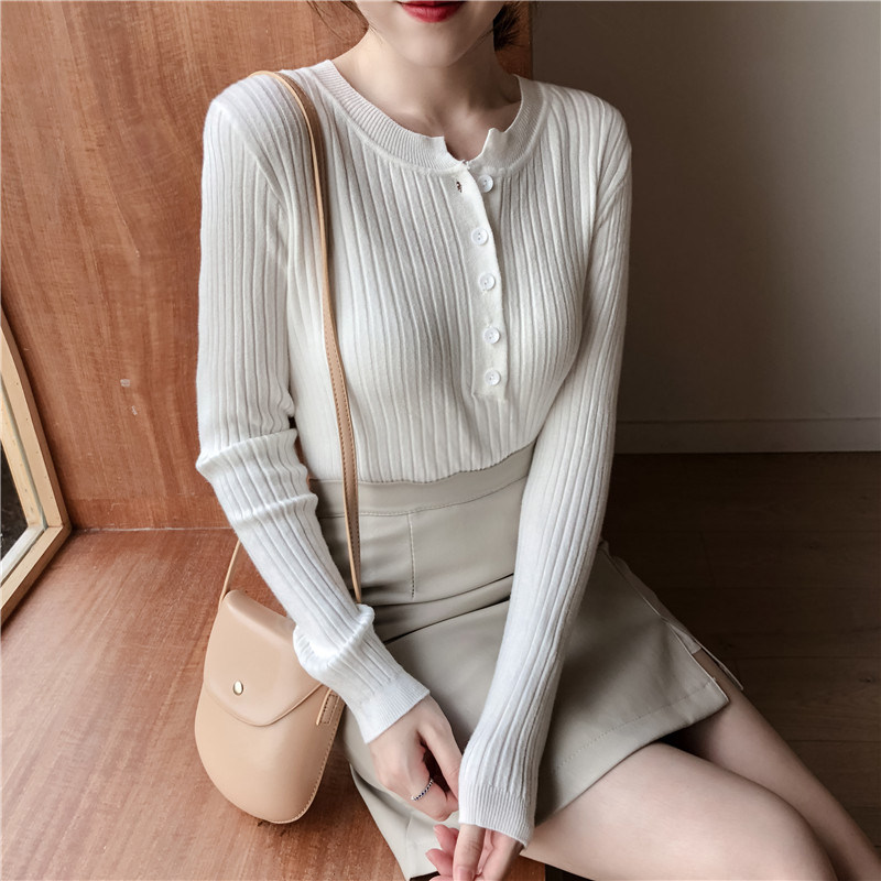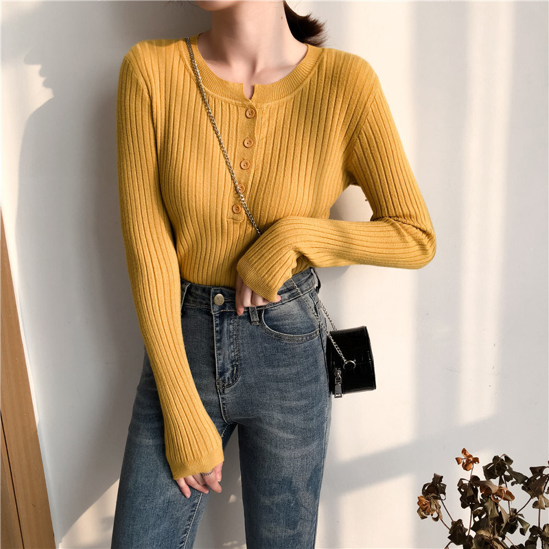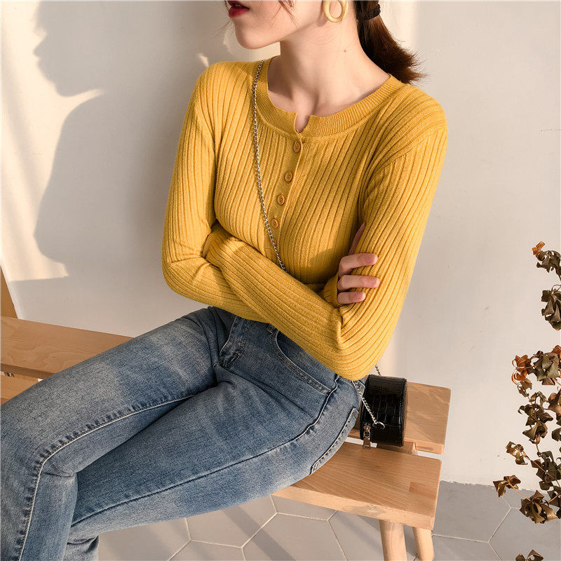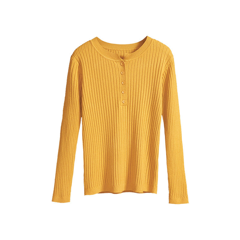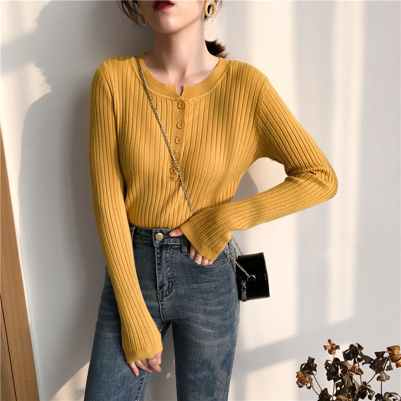 Осенний универсальный лонгслив, булавка, трикотажный базовый приятный телу свитер с круглым воротником, в обтяжку