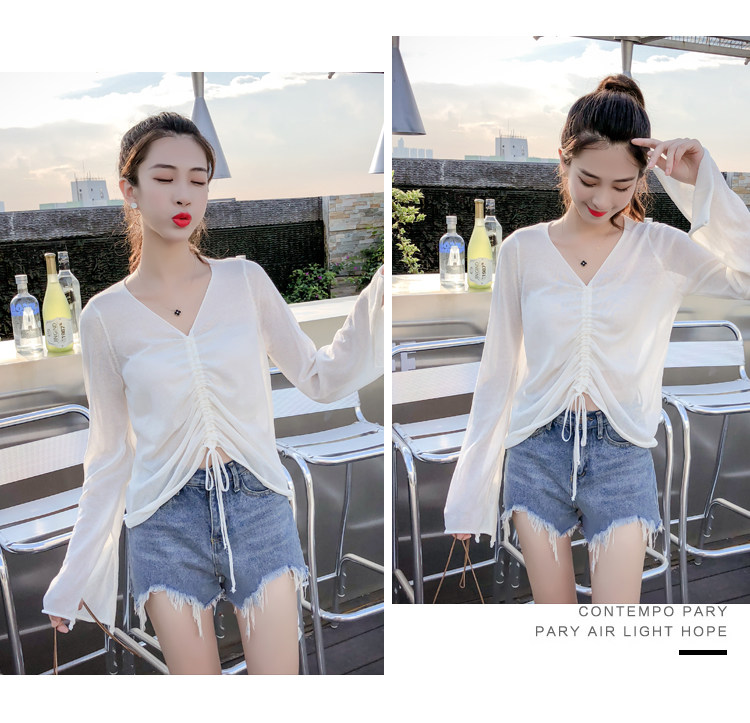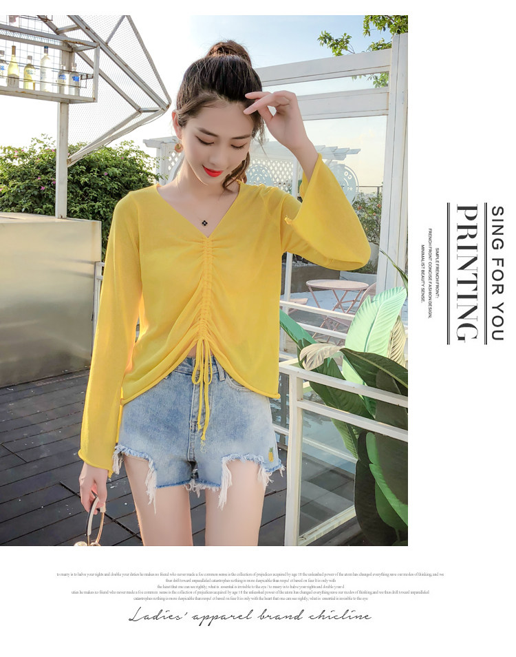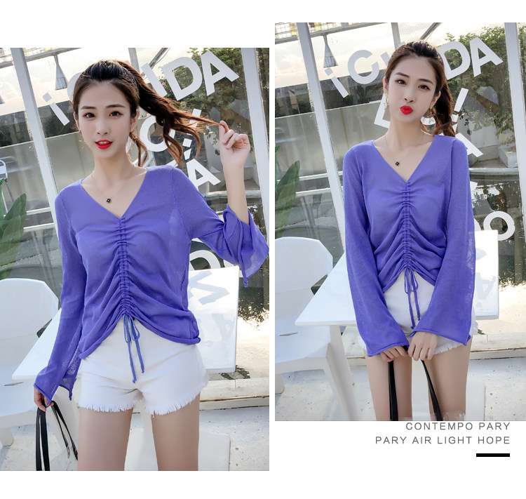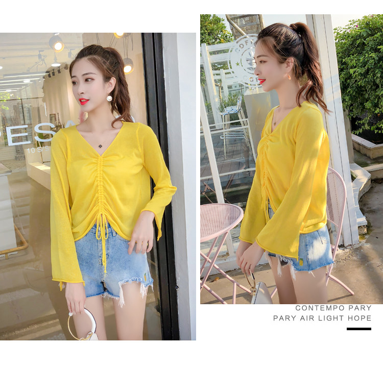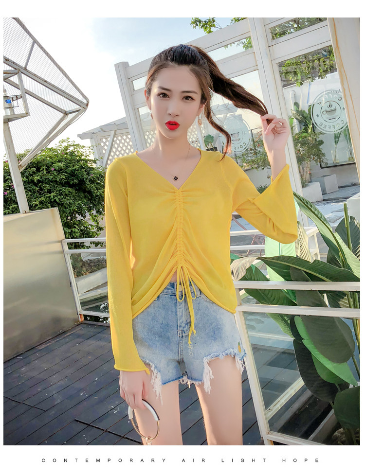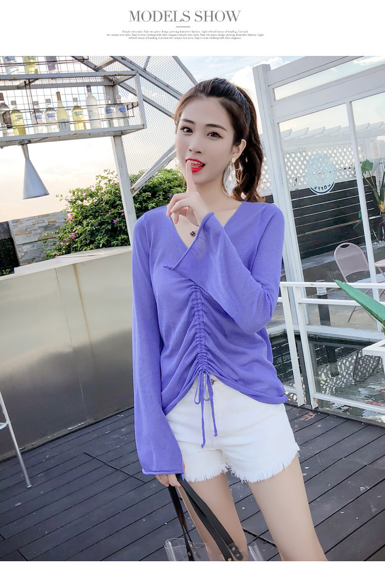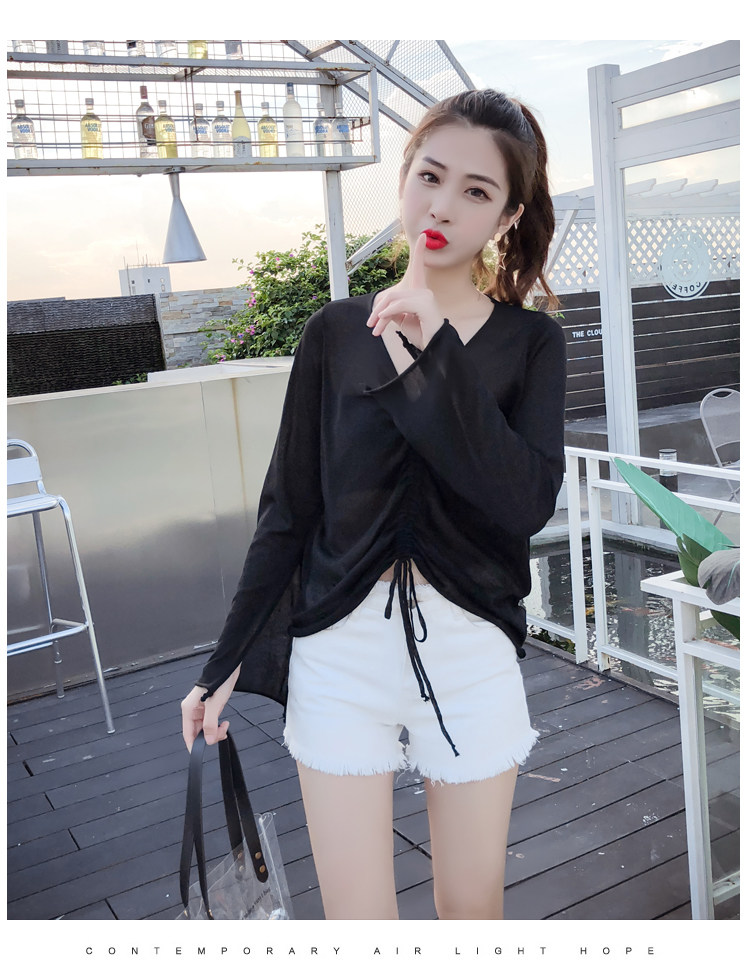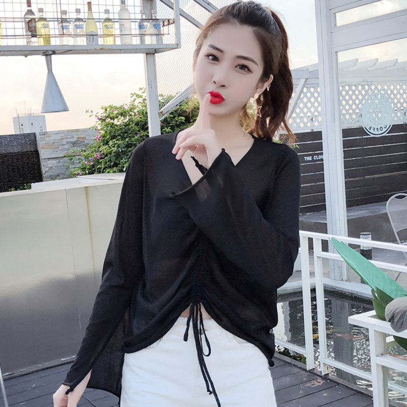 Летний трикотажный тонкий свитер, мегафон, лонгслив, 2020, оверсайз, V-образный вырез, на шнурках, защита от солнца