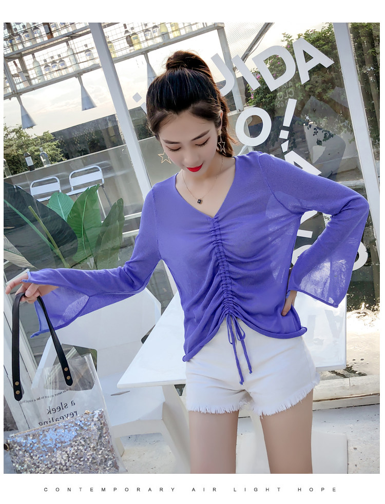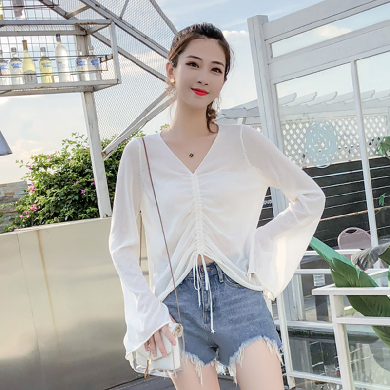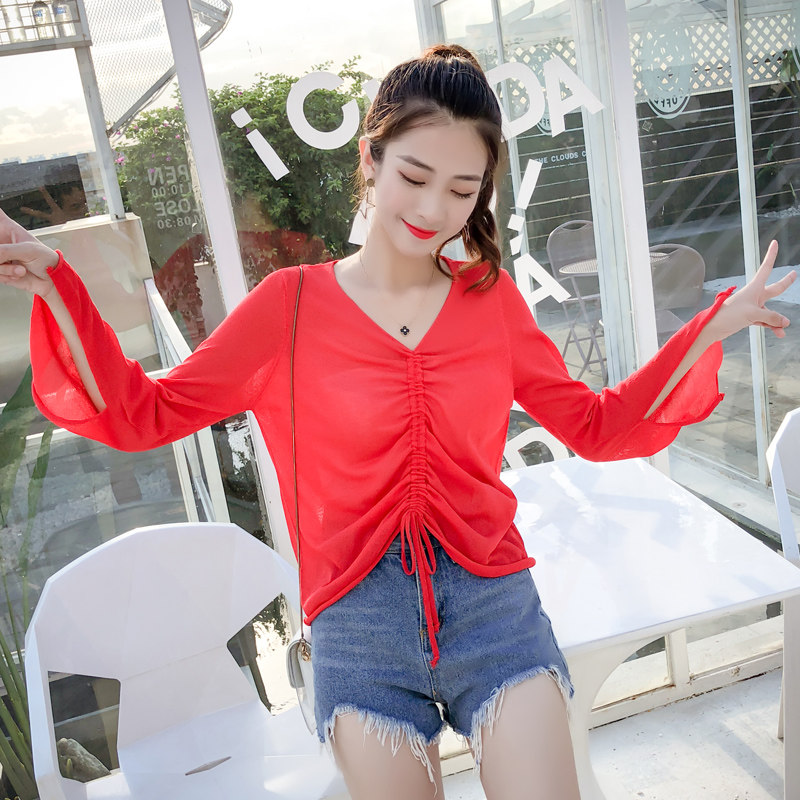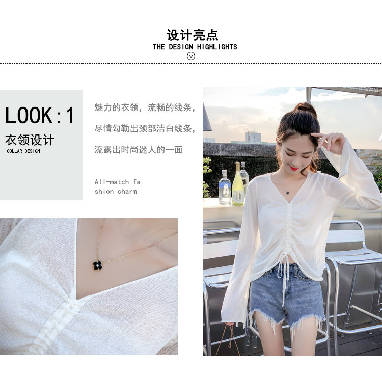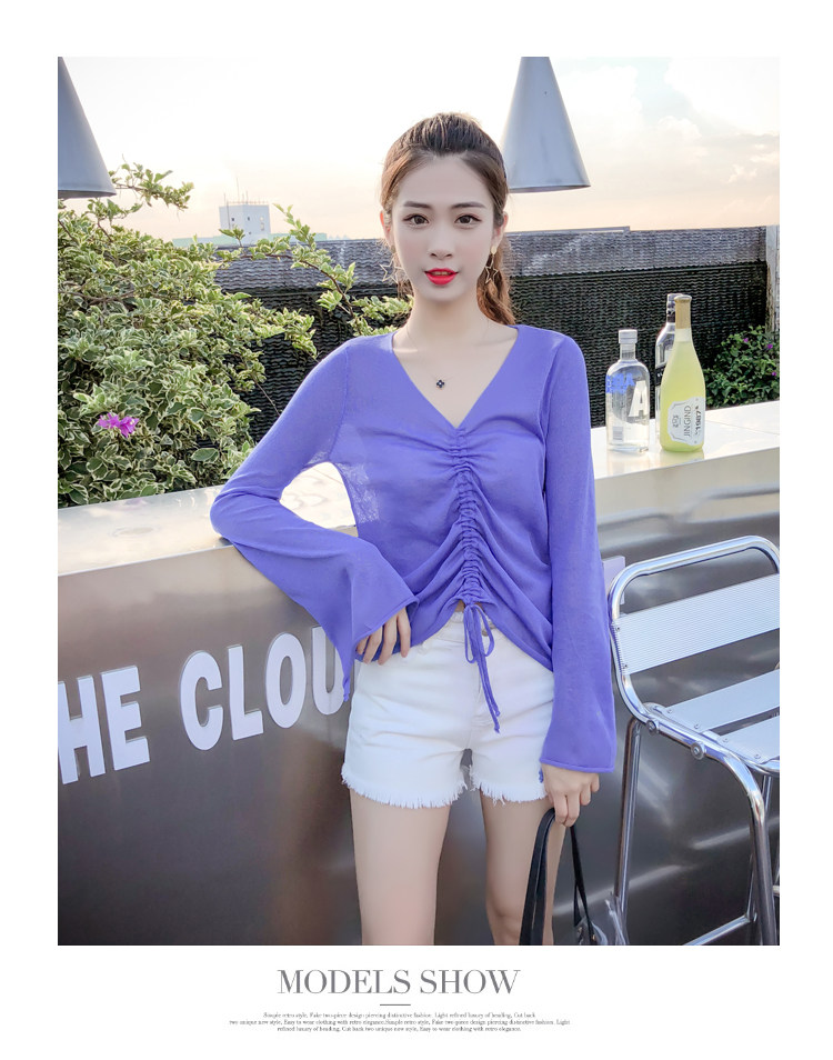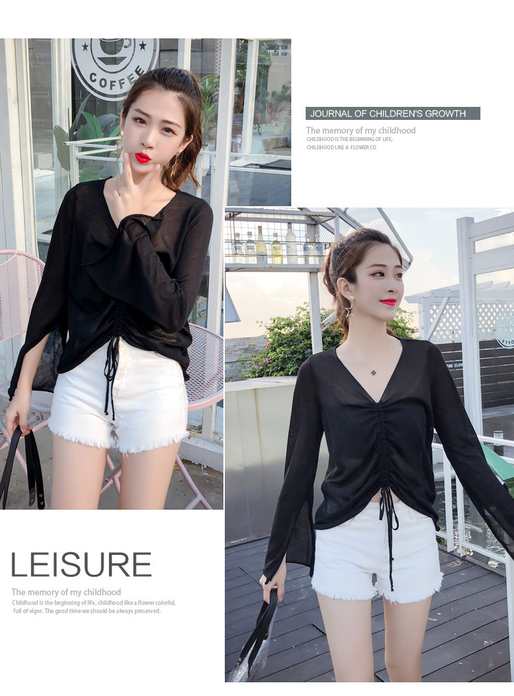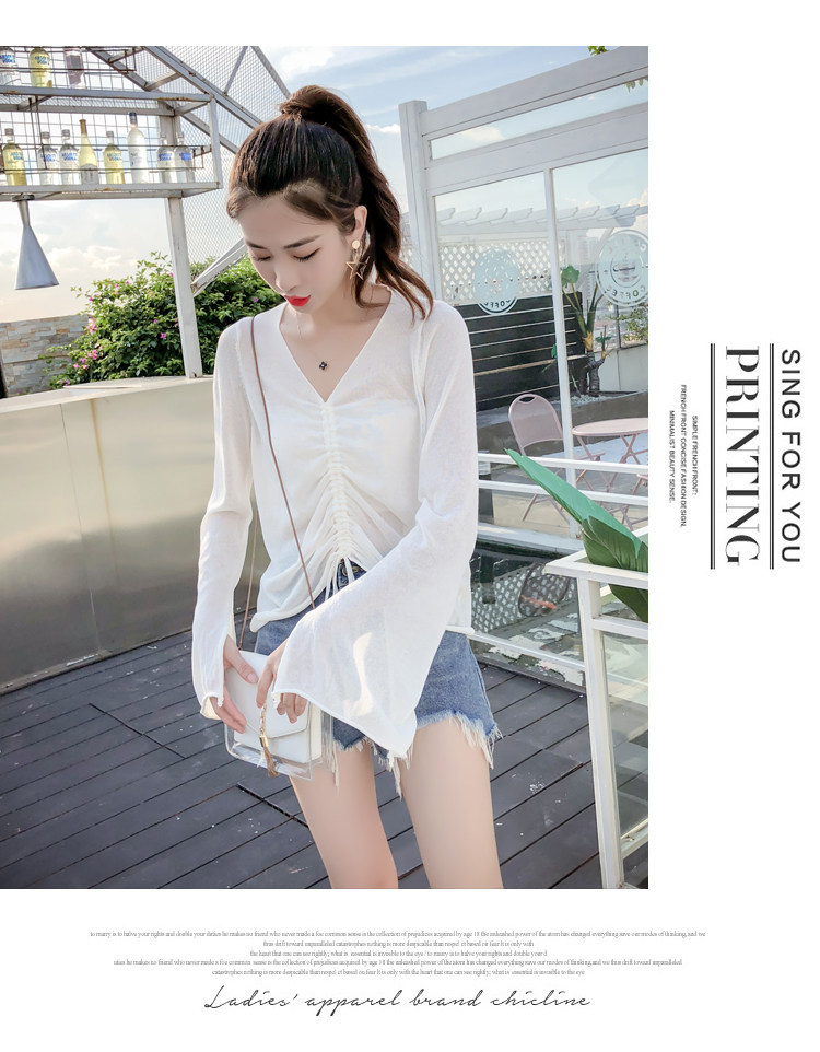 Летний трикотажный тонкий свитер, мегафон, лонгслив, 2020, оверсайз, V-образный вырез, на шнурках, защита от солнца
