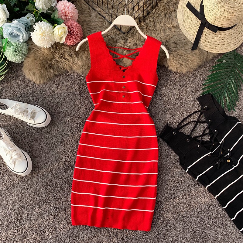 Летний волнистый трикотажный жилет, платье без рукавов, приталенная юбка, ремень, V-образный вырез, с акцентом на бедрах