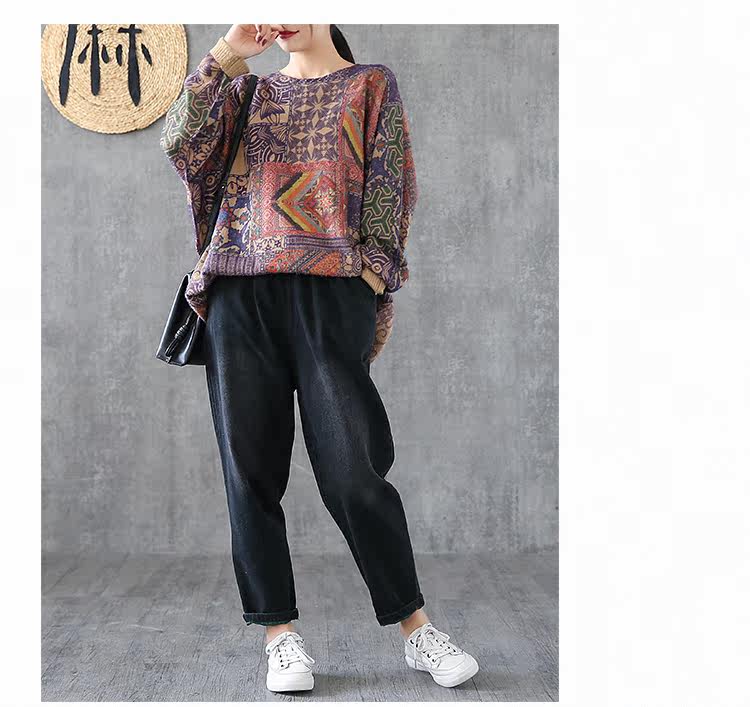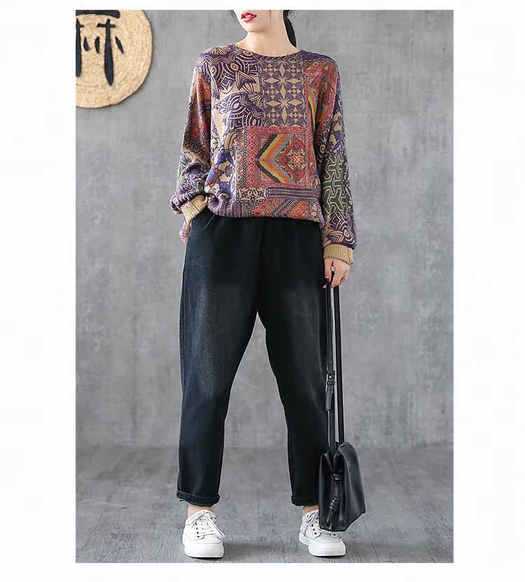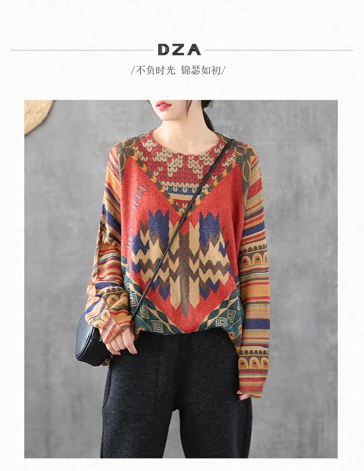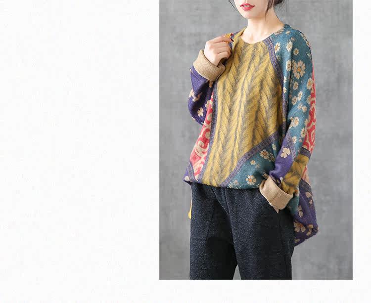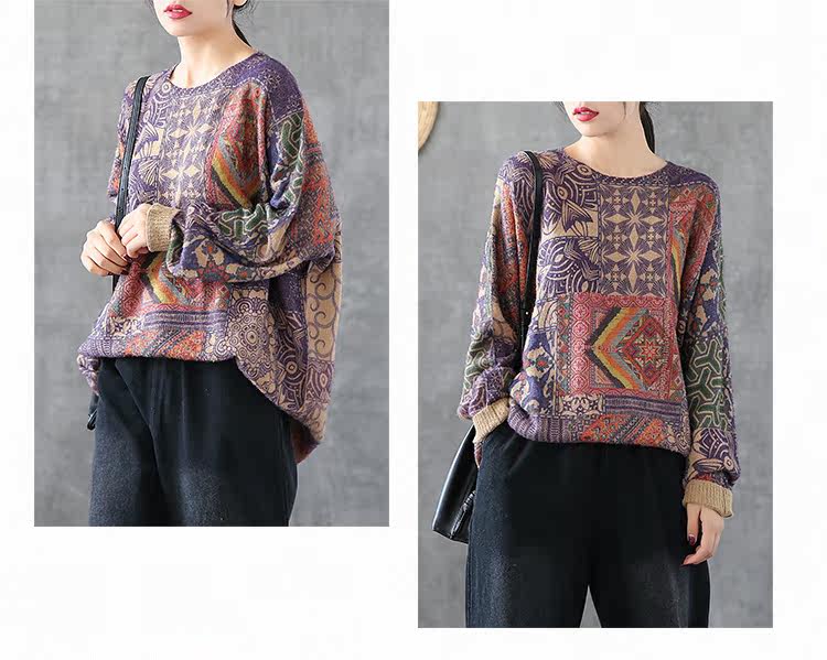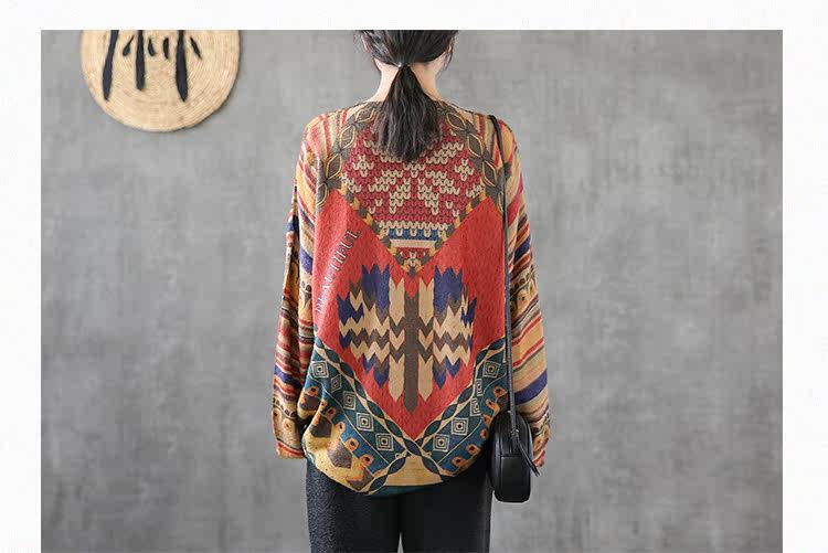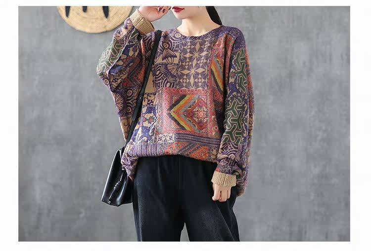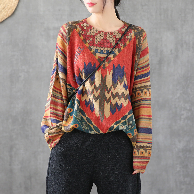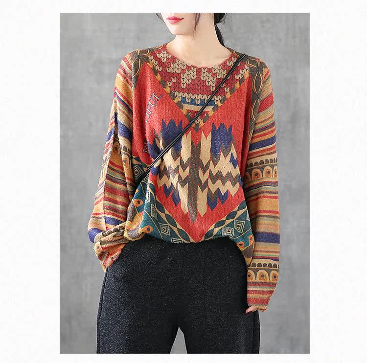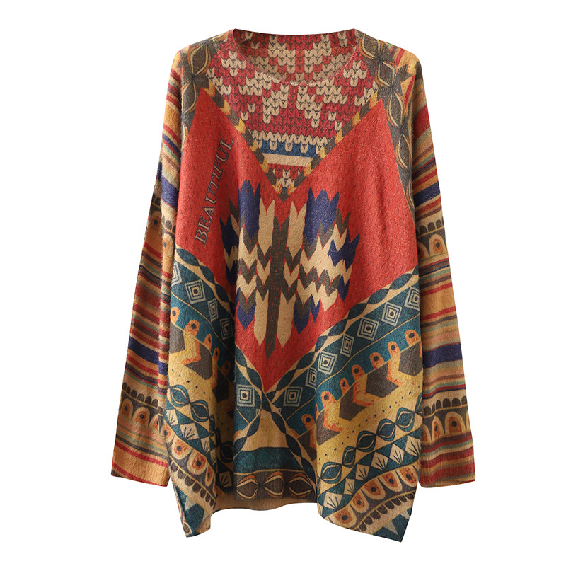 Ретро этнический окрашенный трикотажный свитер, лонгслив, базовое приятное телу демисезонное термобелье, этнический стиль, оверсайз