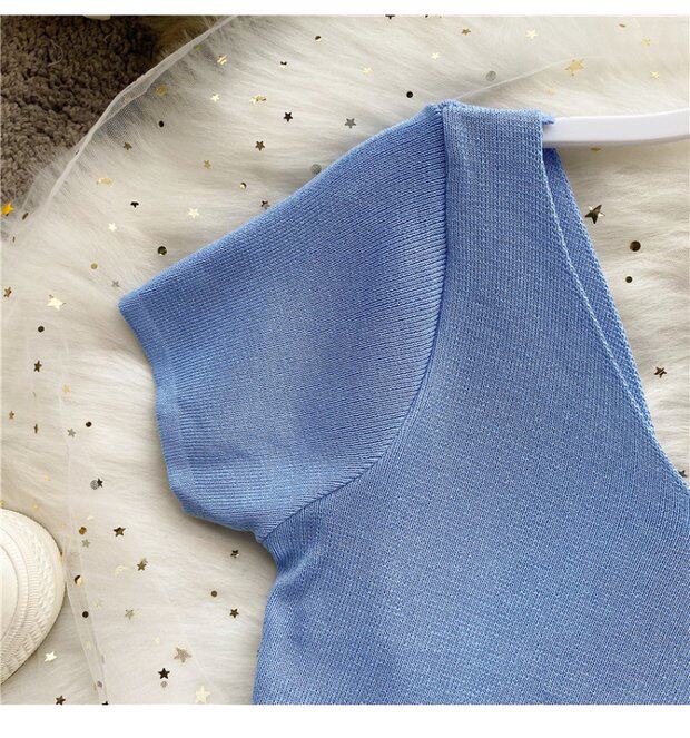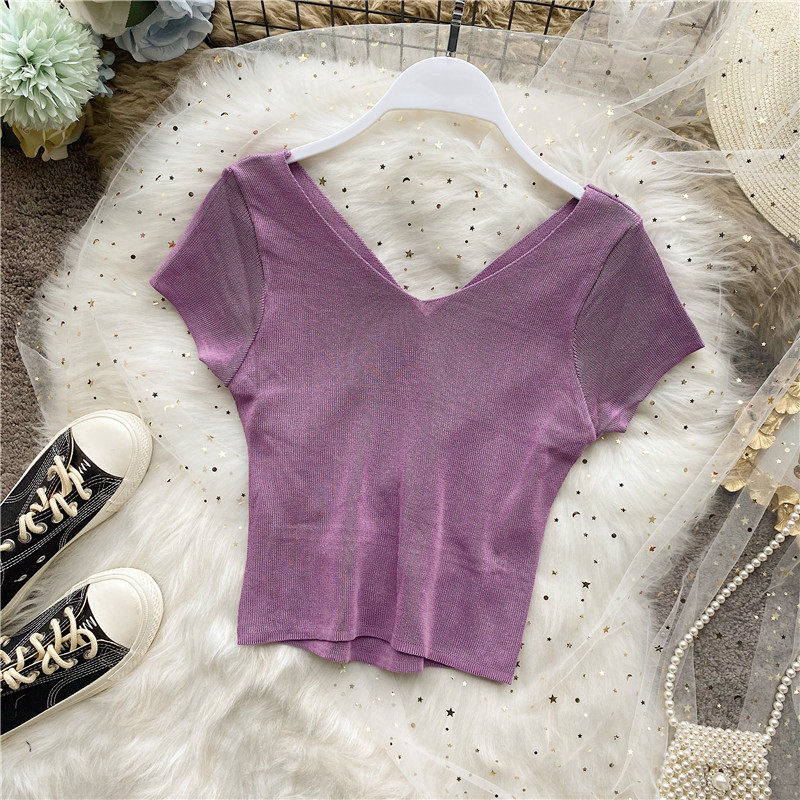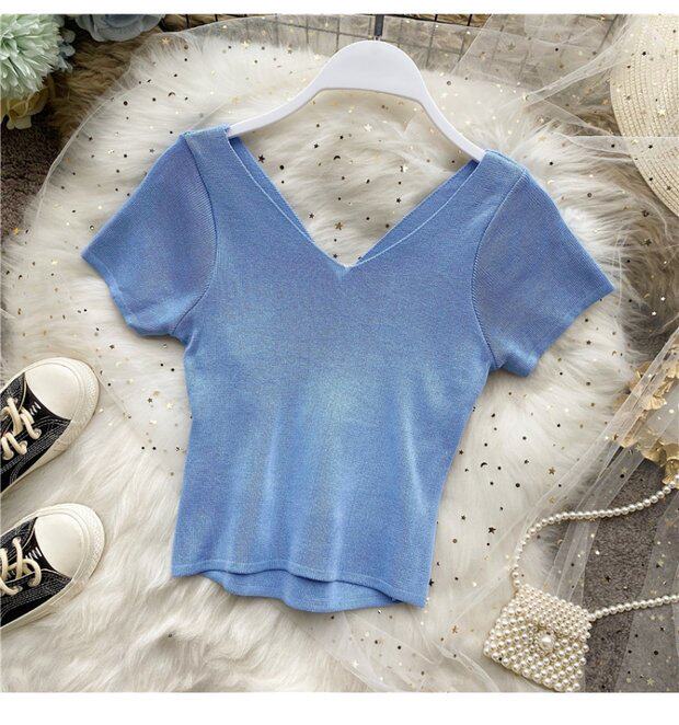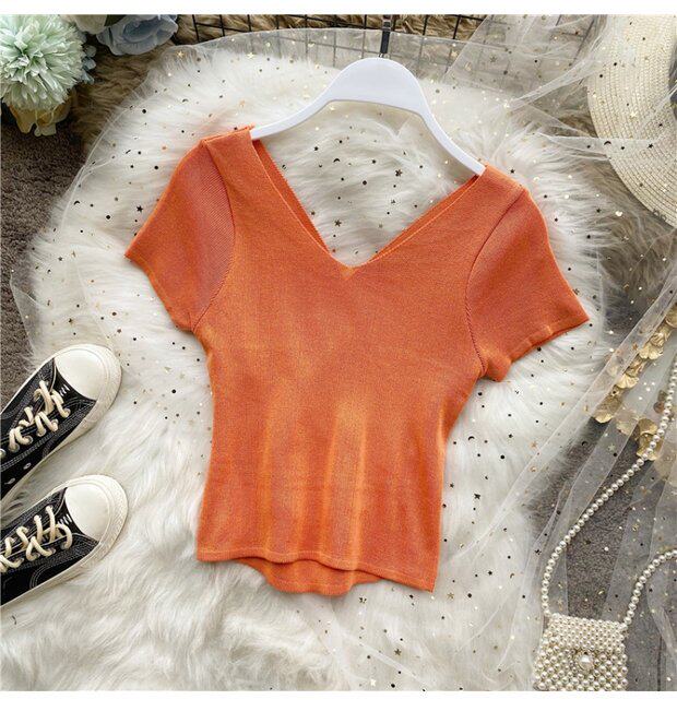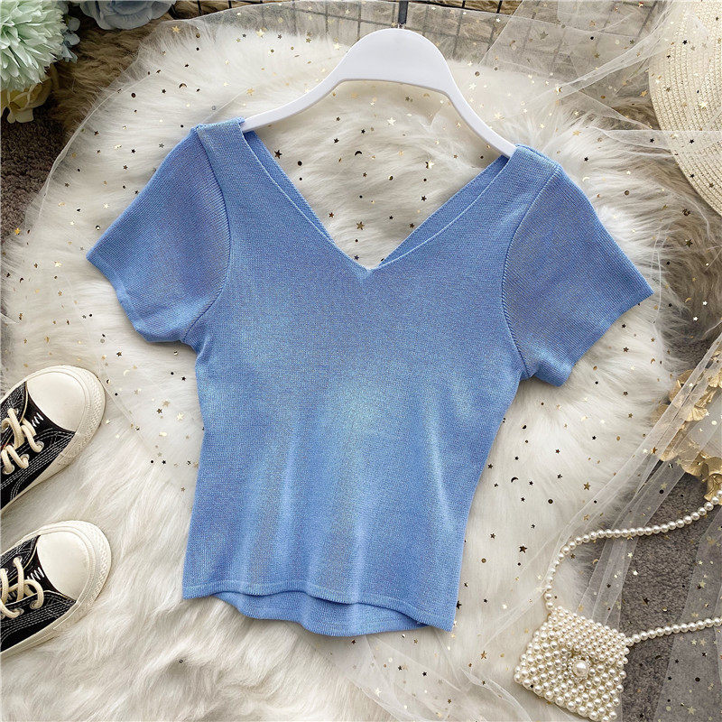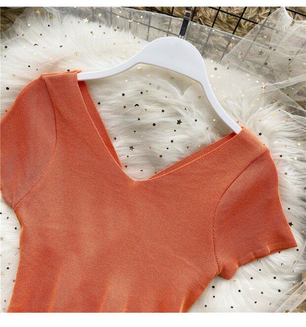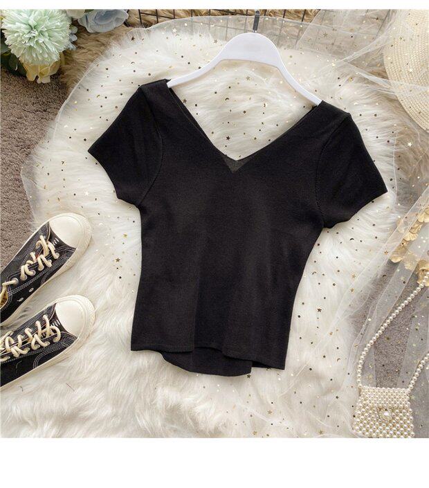 Tide, черная короткая футболка, V-образный вырез, короткий рукав, популярно в интернете, высокая талия, в обтяжку, с открытой спиной