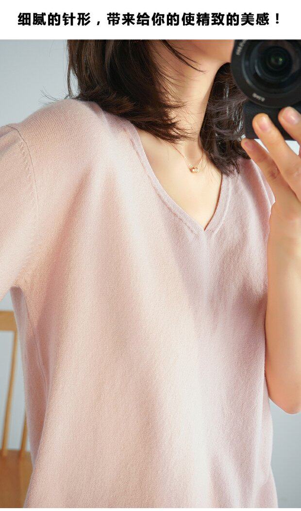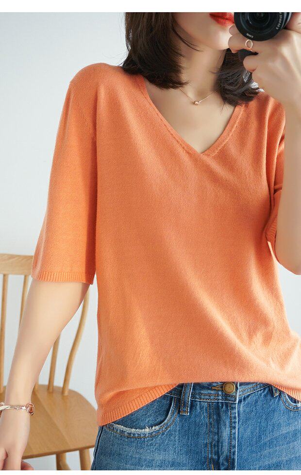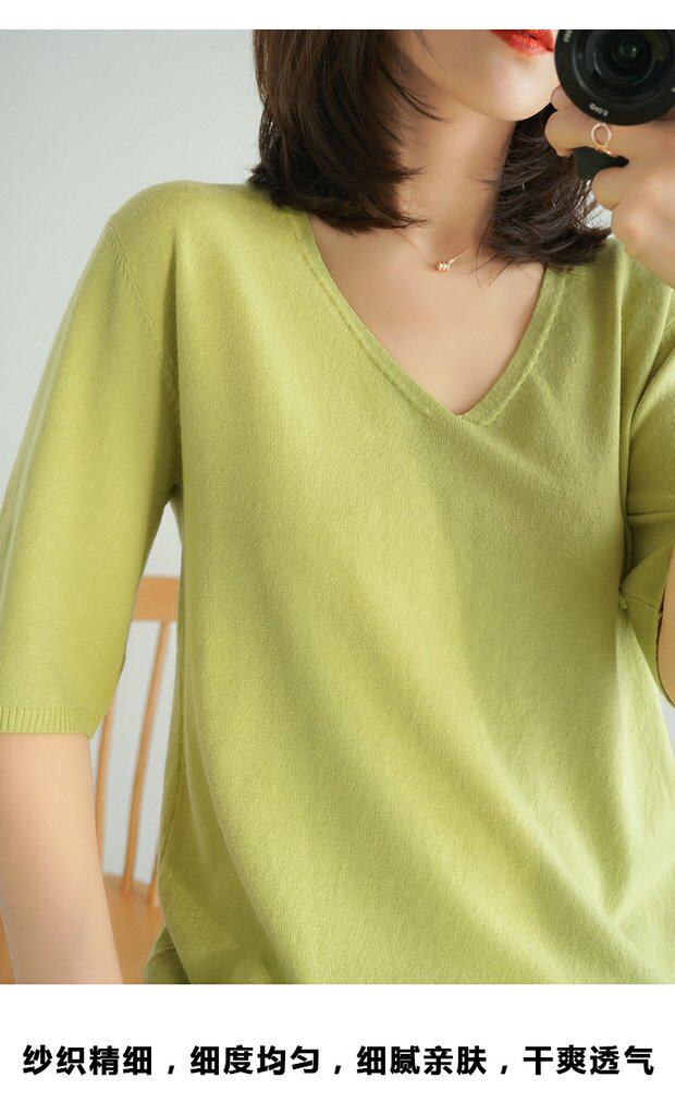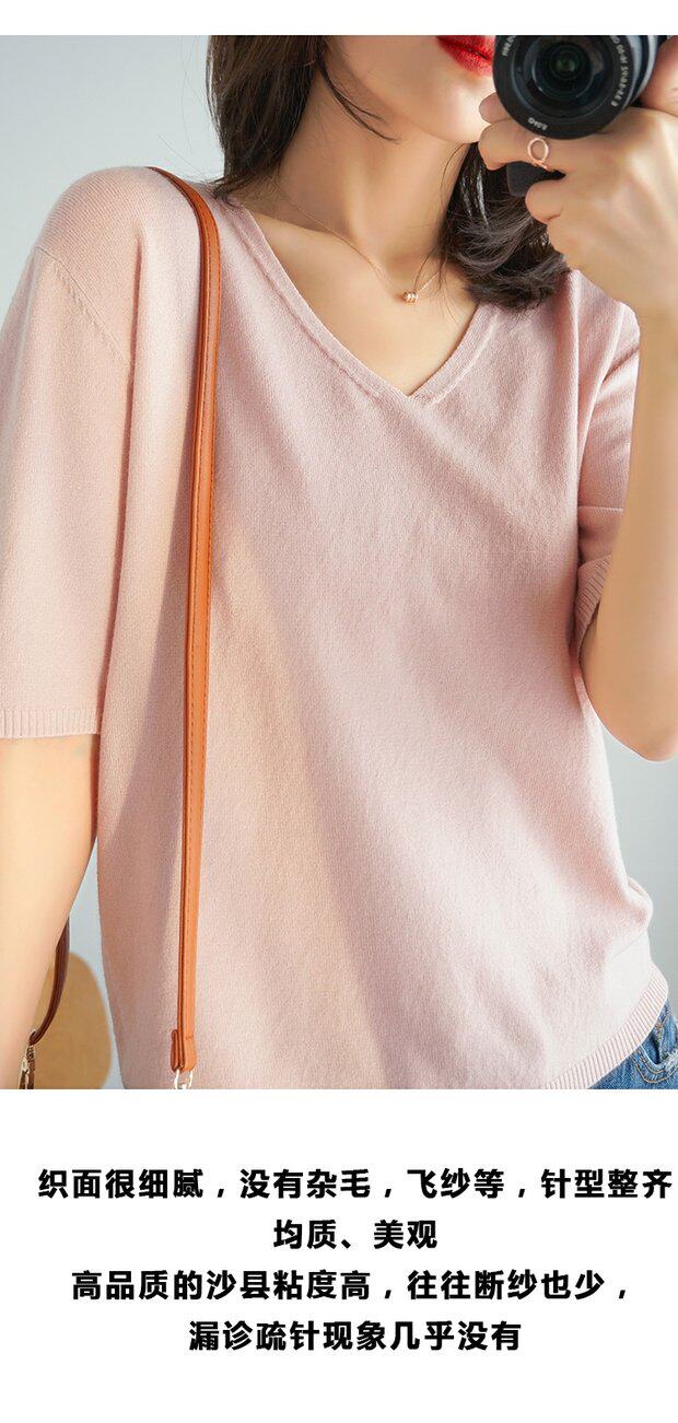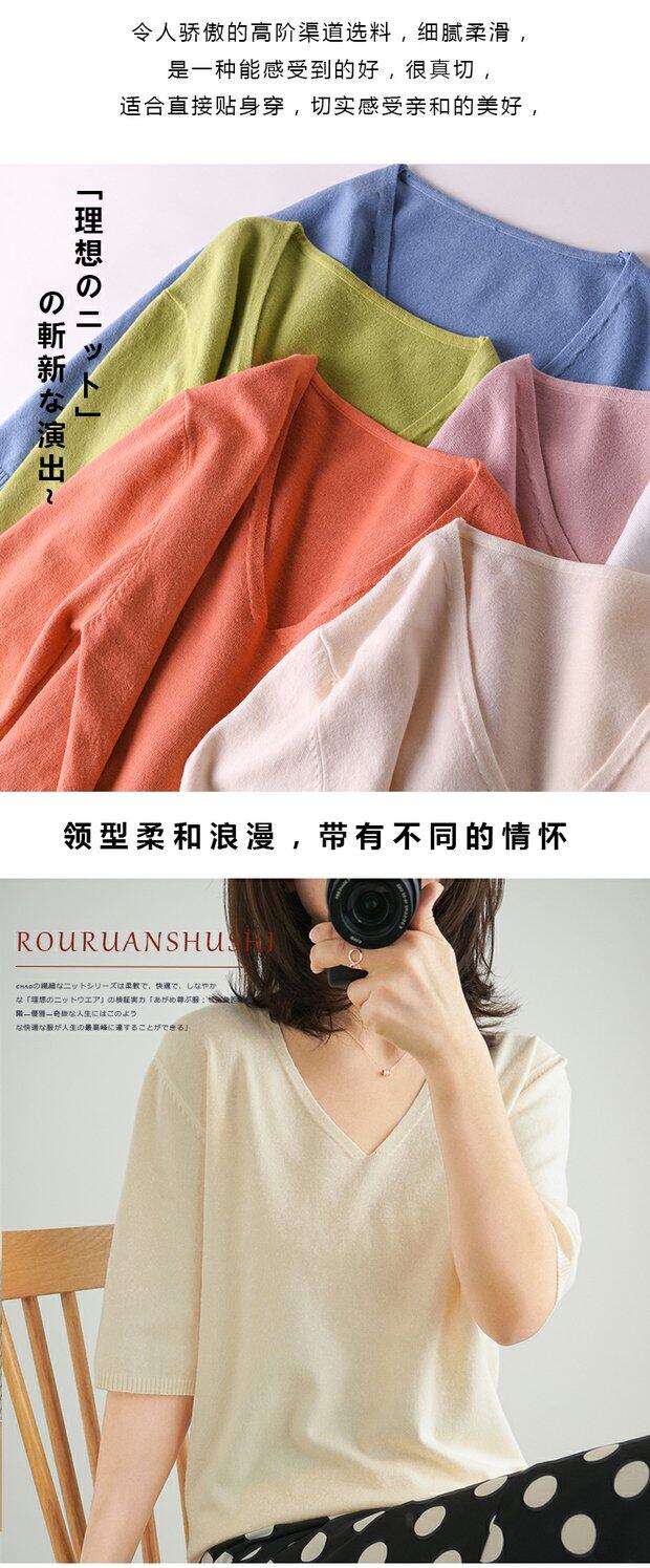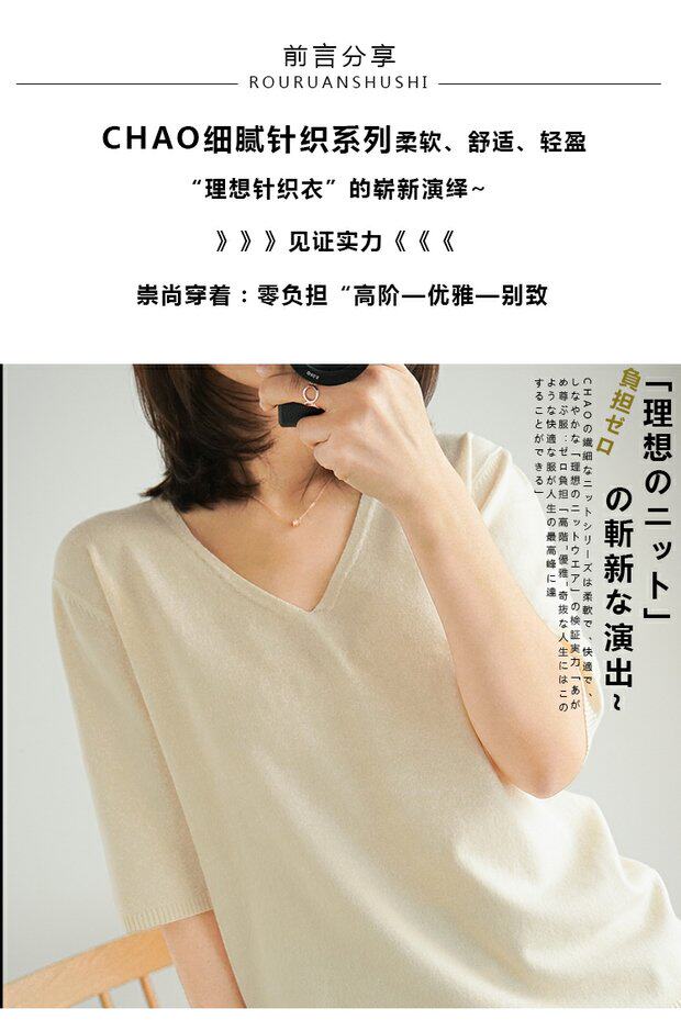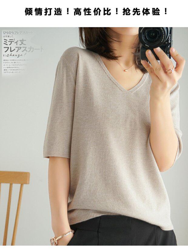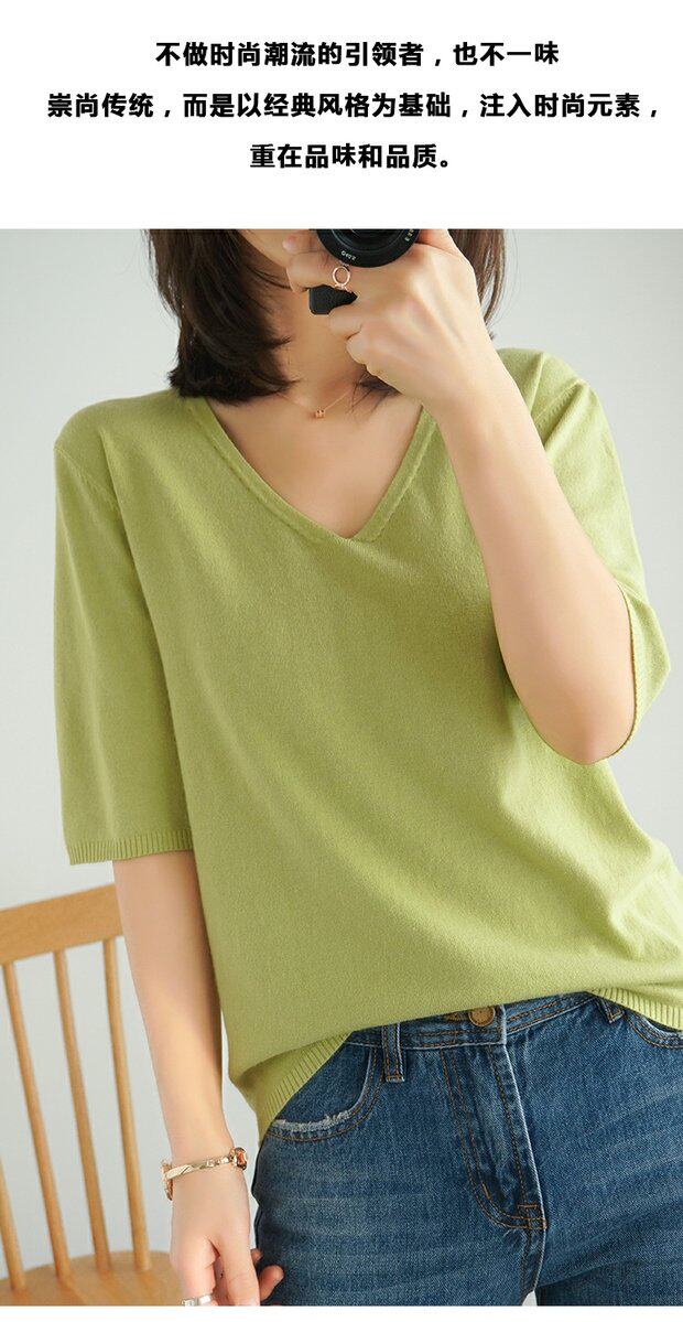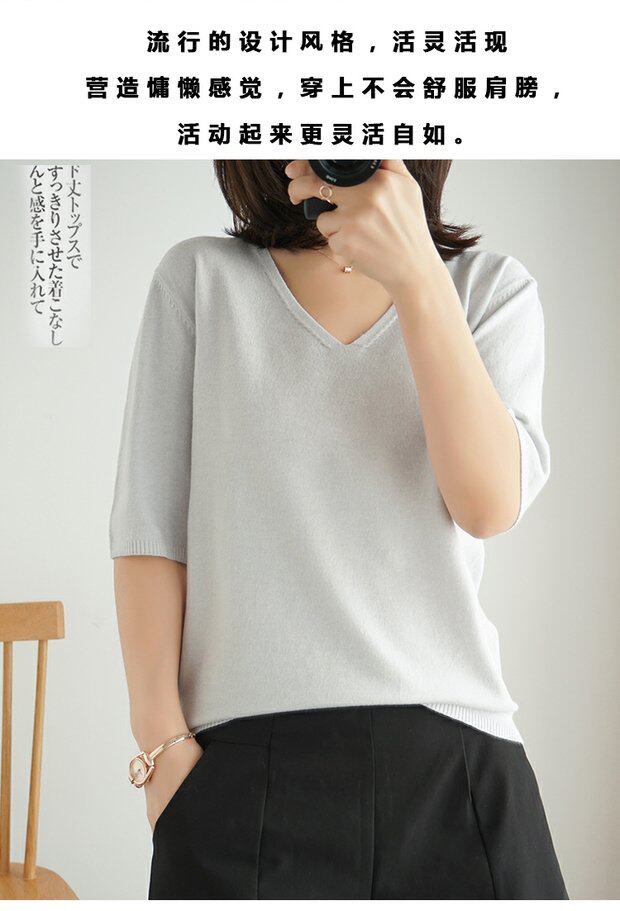 Летний тонкий кашемировый комплект, трикотажная короткая футболка, V-образный вырез, короткий рукав, свободный крой, в корейском стиле