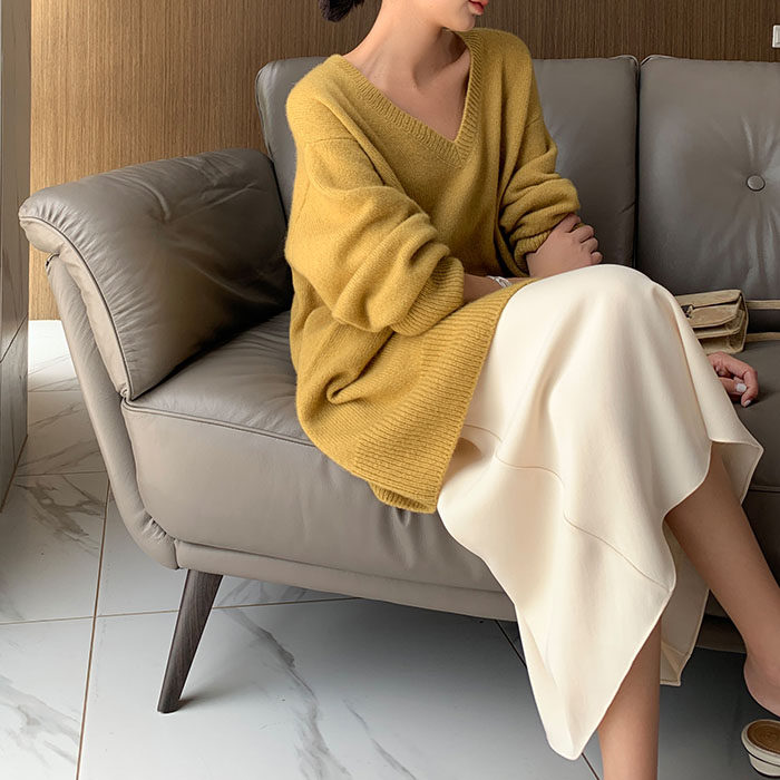 Кашемировый длинный трикотажный модный свитер, V-образный вырез, оверсайз, средней длины