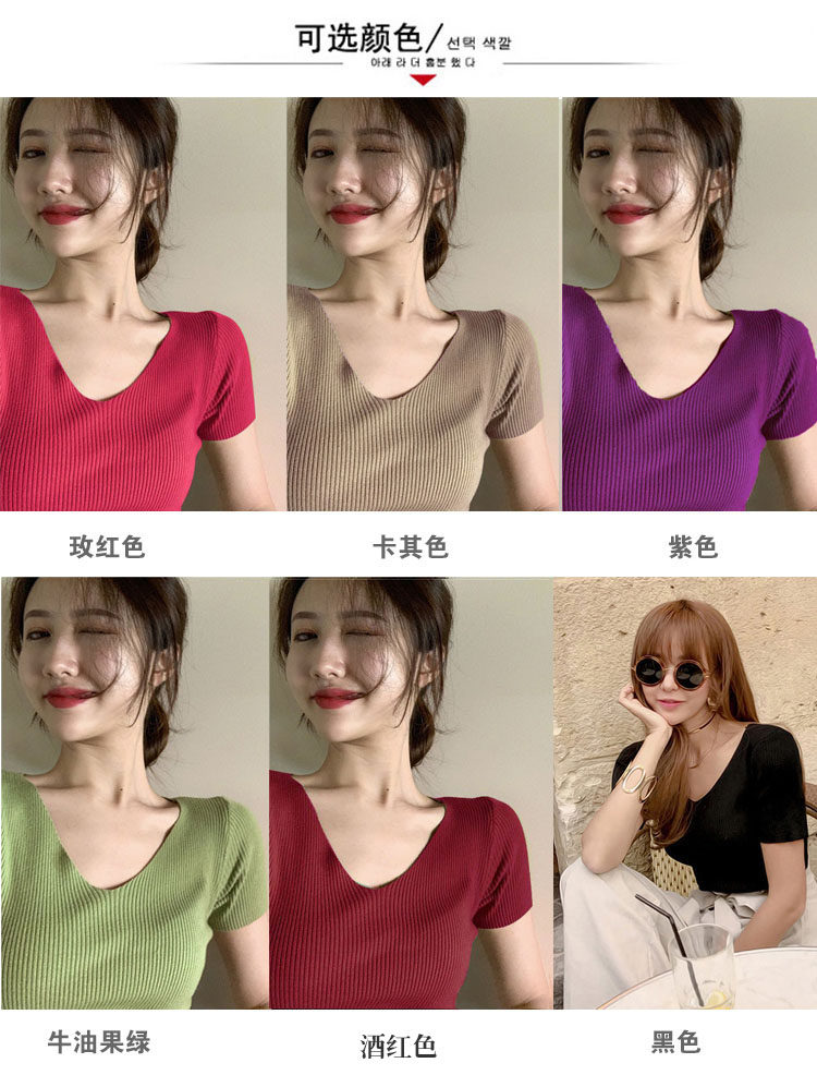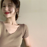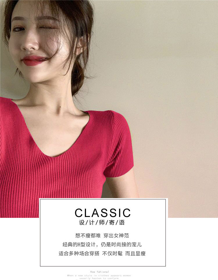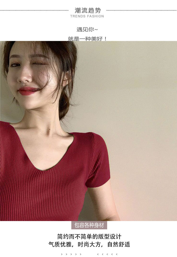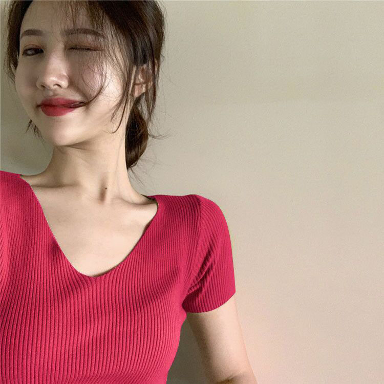 Шелковая летняя короткая приталенная футболка, дизайнерский красный трикотажный свитер, короткий рукав, коллекция 2023, V-образный вырез, в западном стиле, тренд сезона
