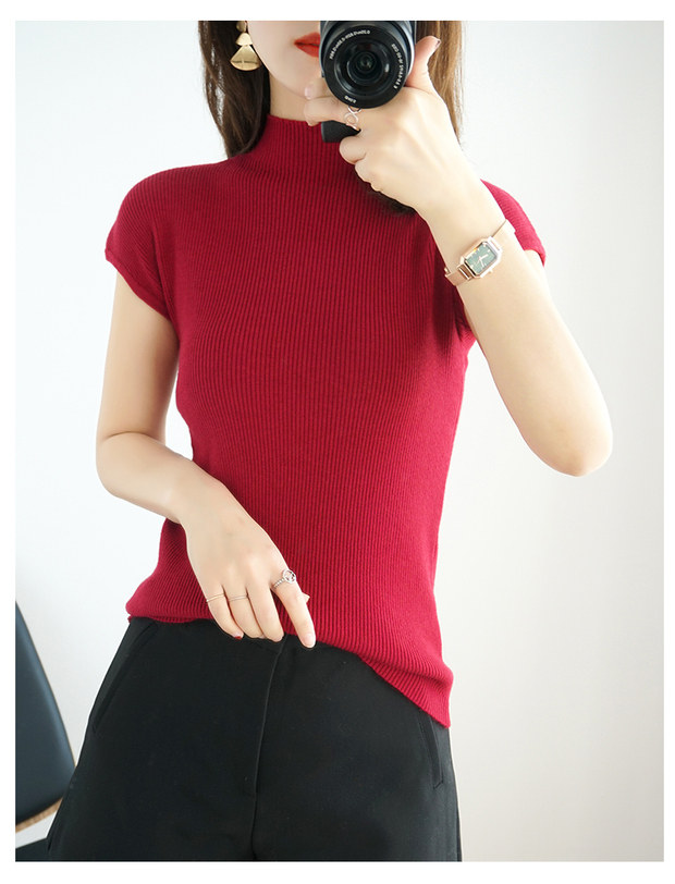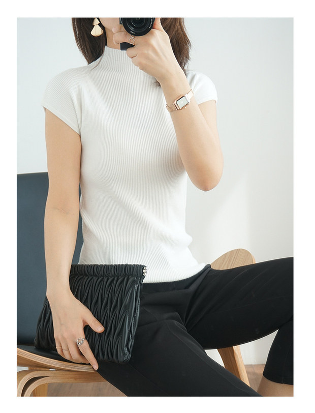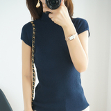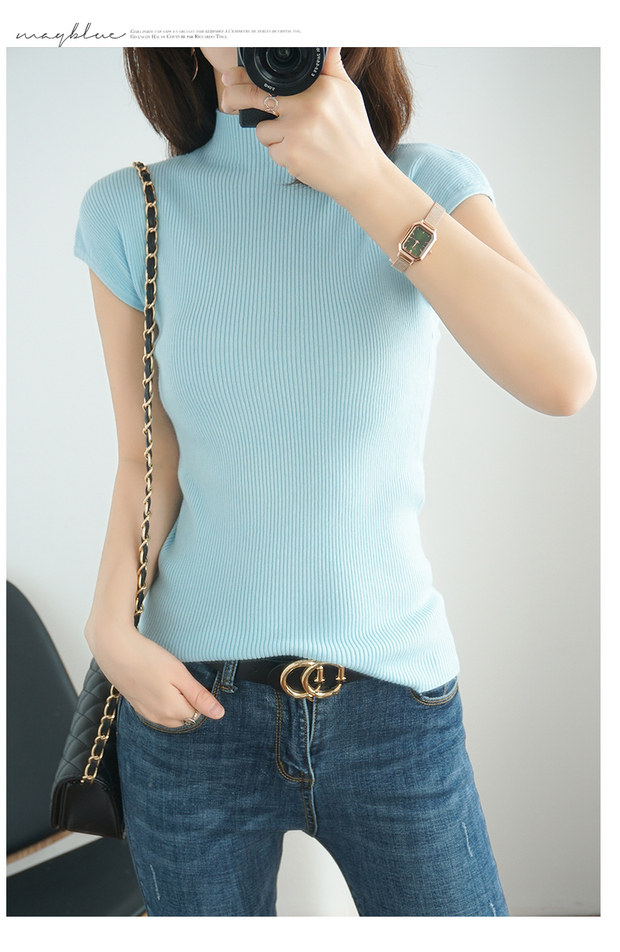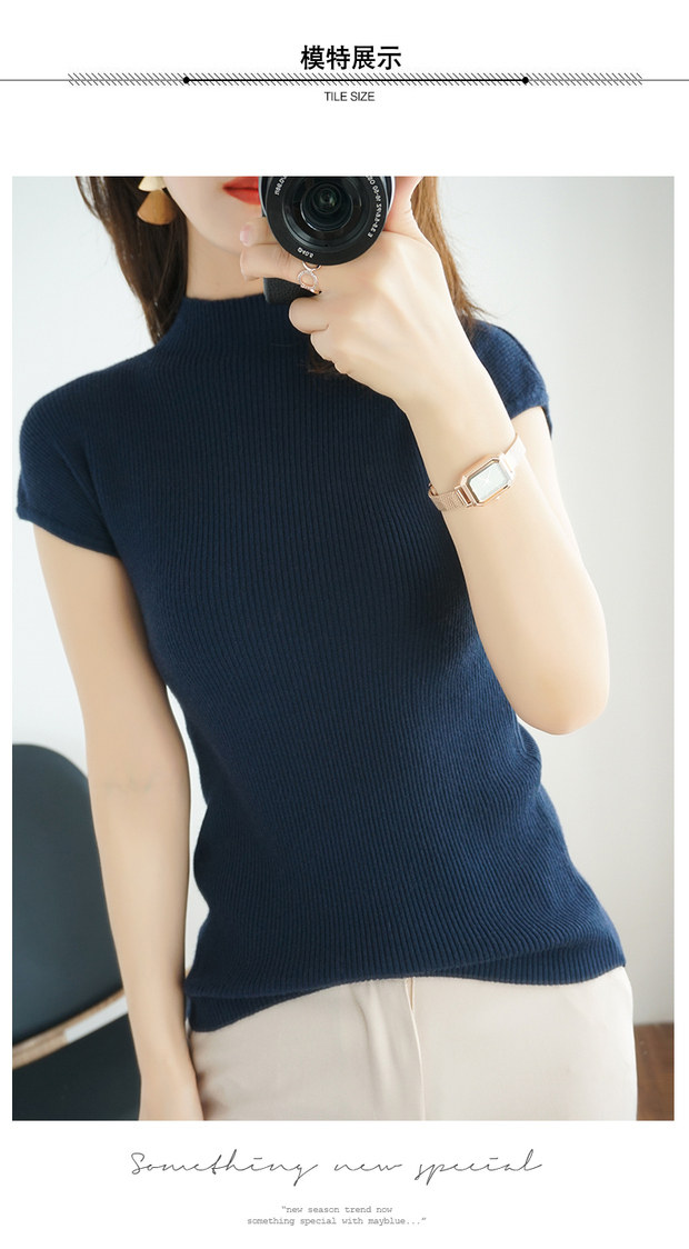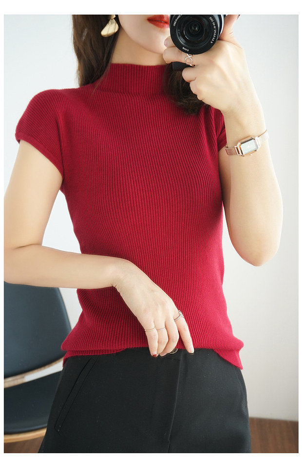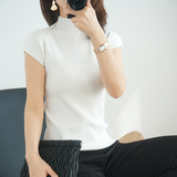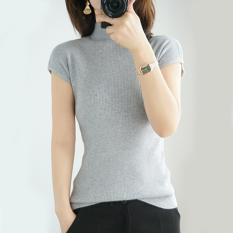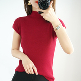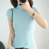 Летний шерстяной свитер, тонкая базовая приятная телу футболка, короткий рукав, 2020, высокий воротник