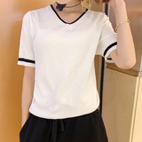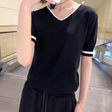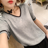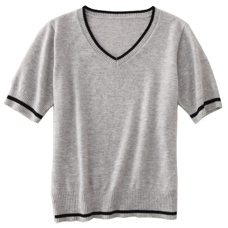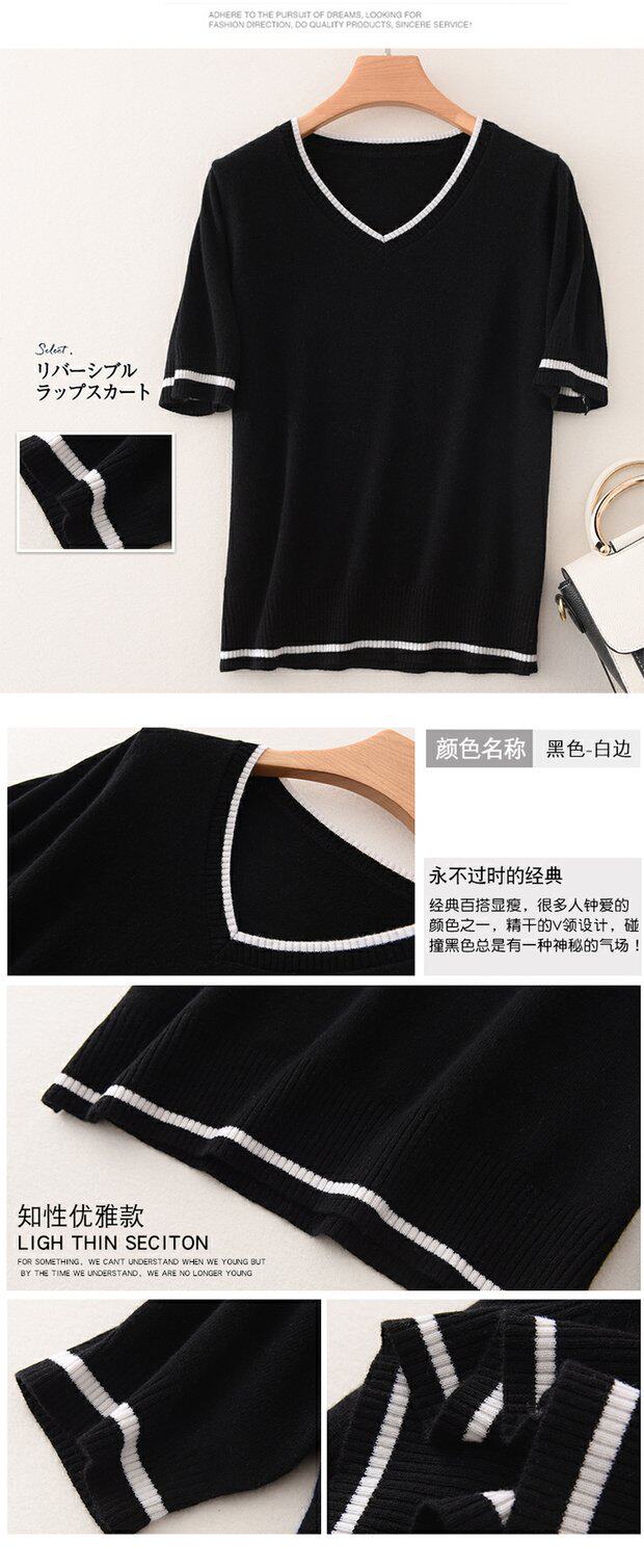 Летняя кашемировая короткая футболка, тонкий трикотажный свитер, короткий рукав, V-образный вырез, свободный крой