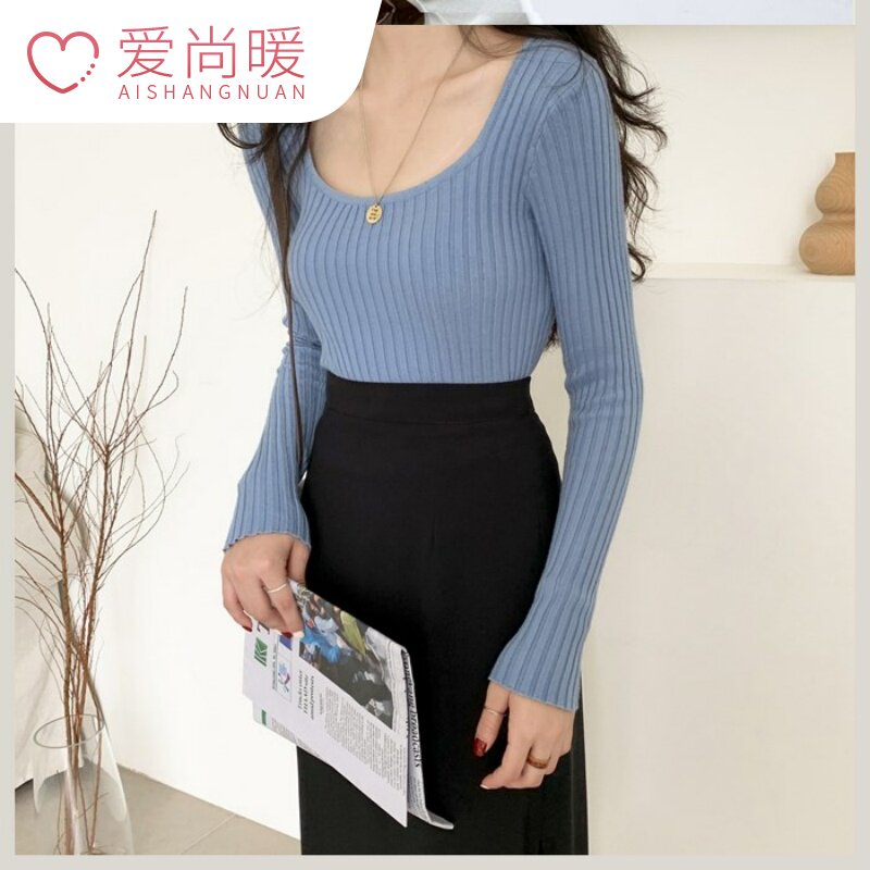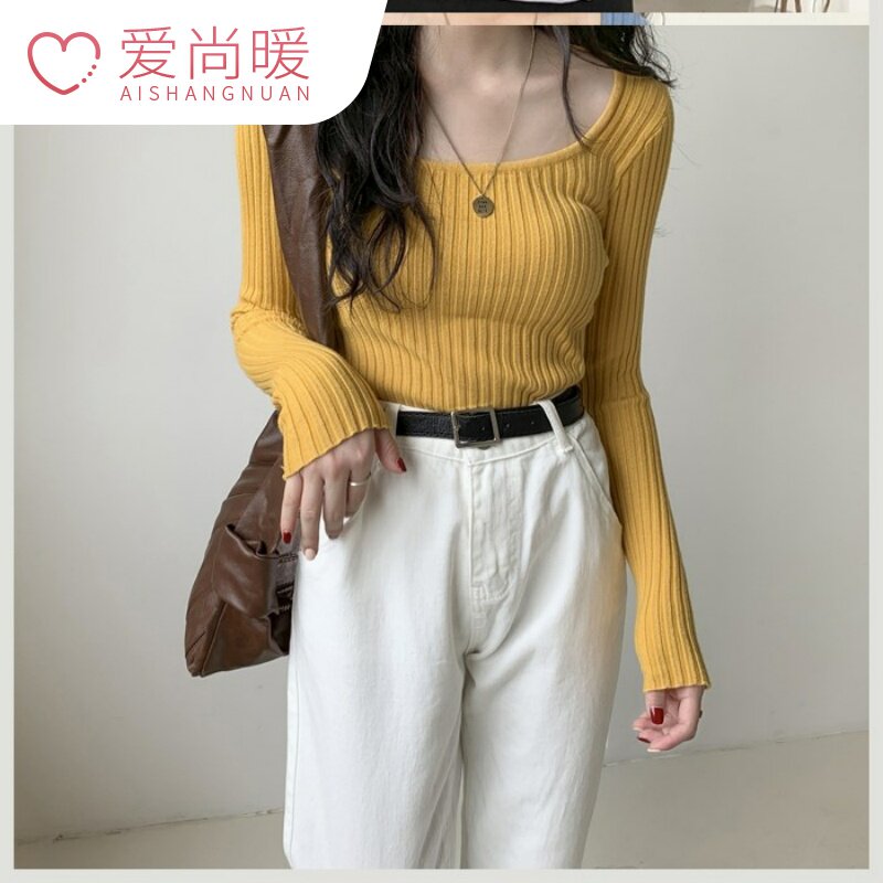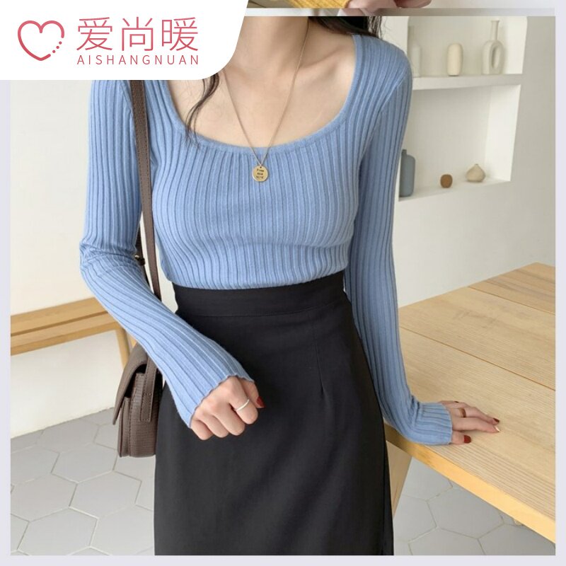Брендовый кремовый рыжий эластичный трикотажный синий свитер, квадратный вырез, облегающий крой