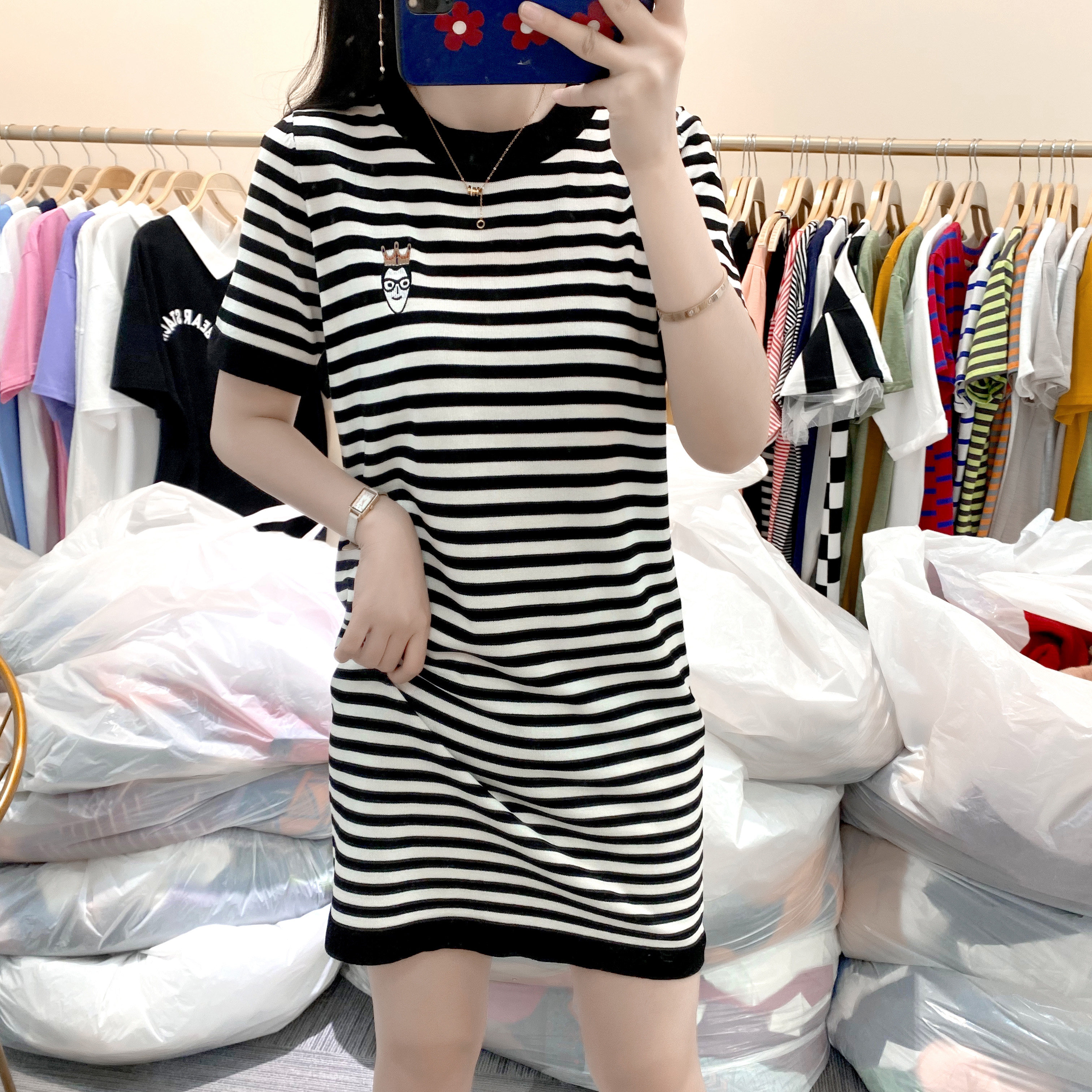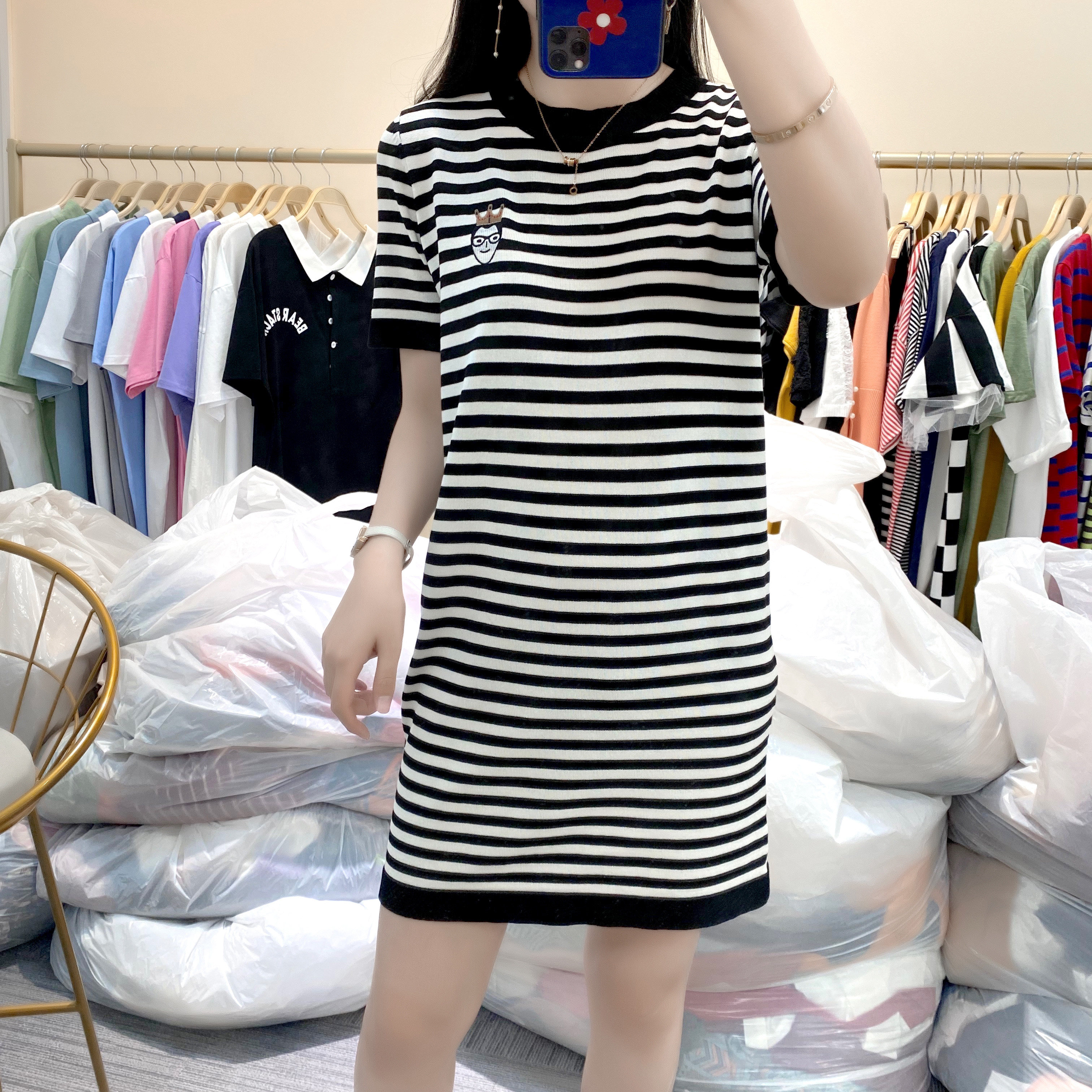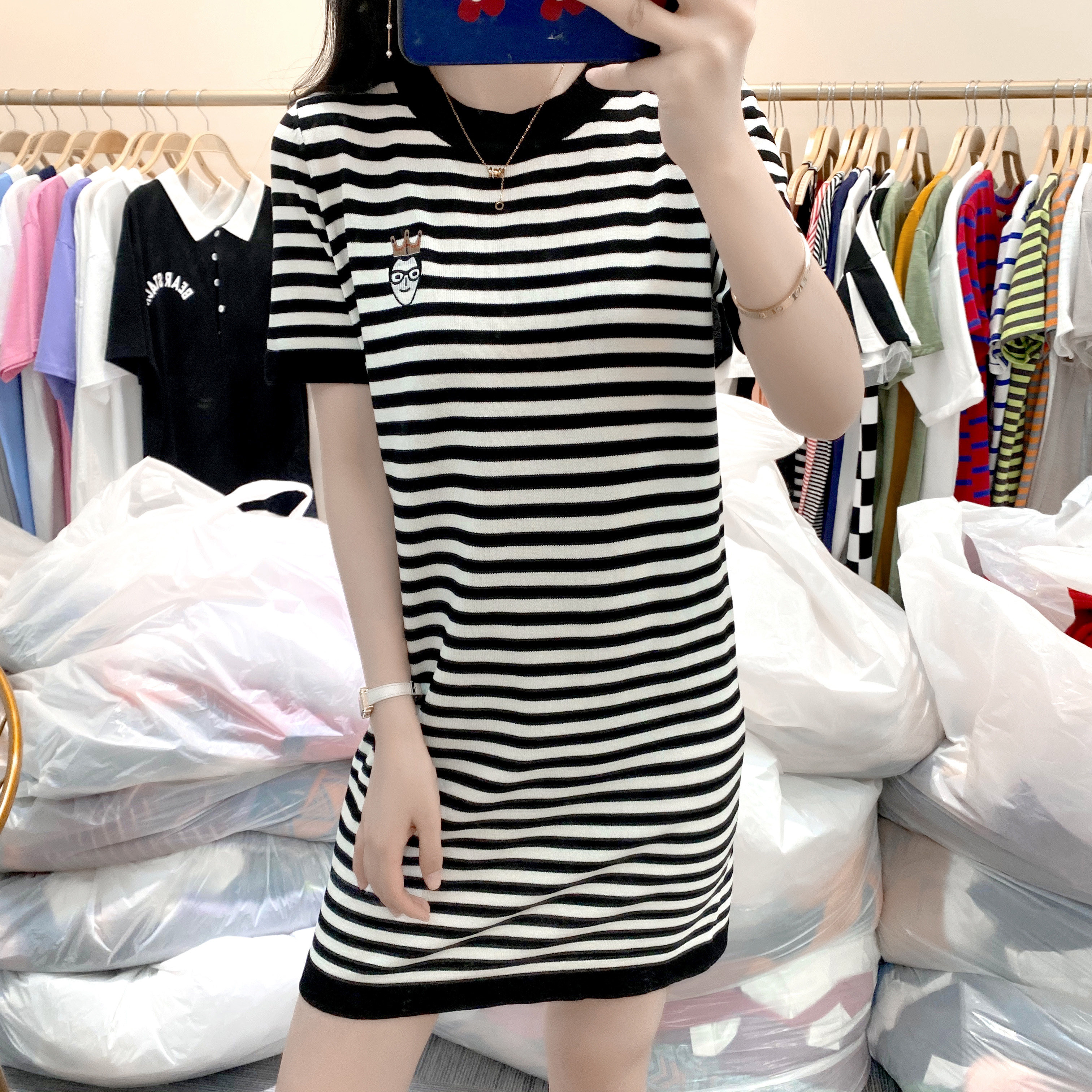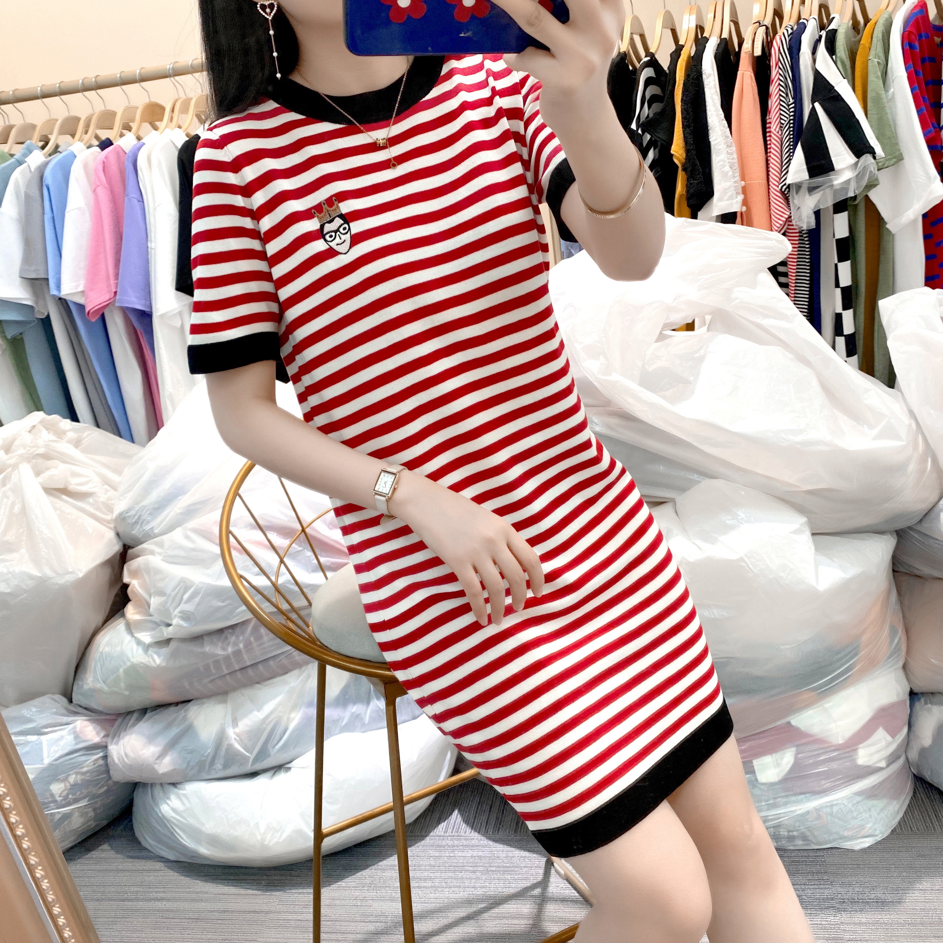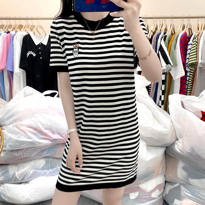 Летний модный длинный базовый трикотажный свитер, платье, европейский стиль, оверсайз, средней длины, короткий рукав