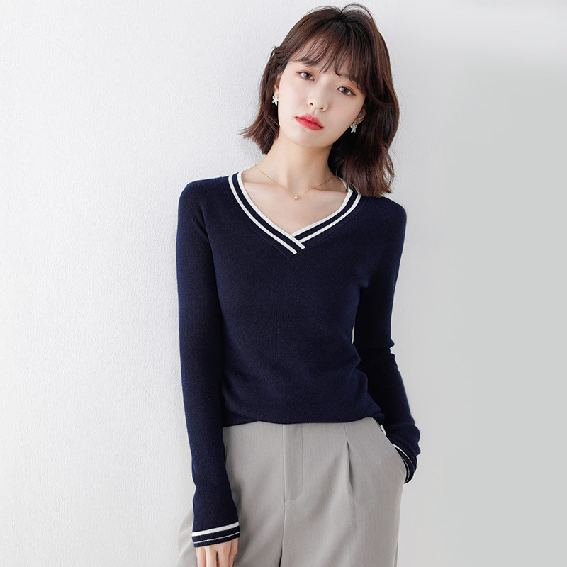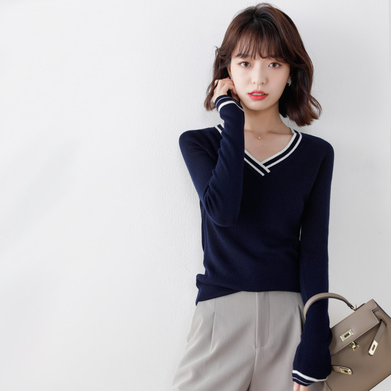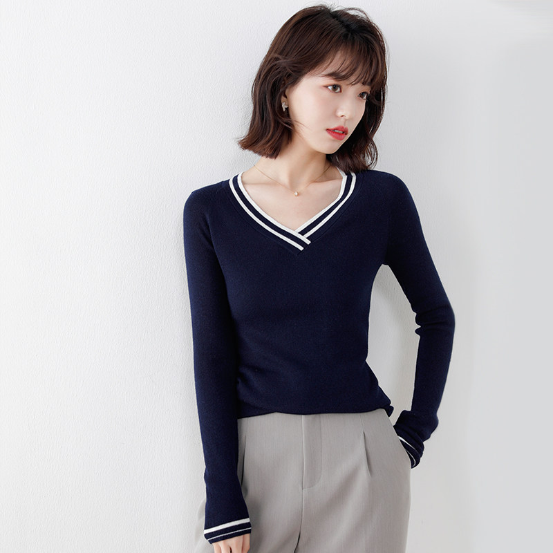 Весенний трикотажный базовый свитер, приятный телу лонгслив, коллекция 2021, свободный крой, в стиле Шанель, V-образный вырез