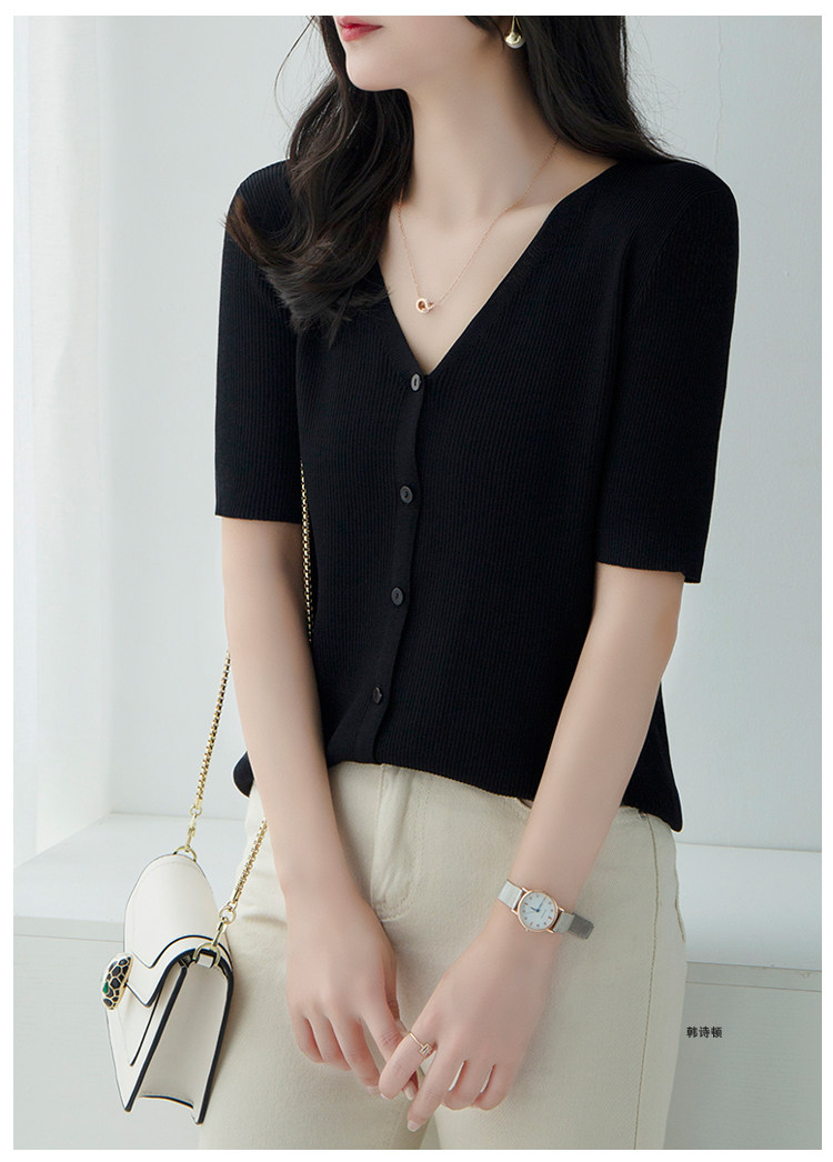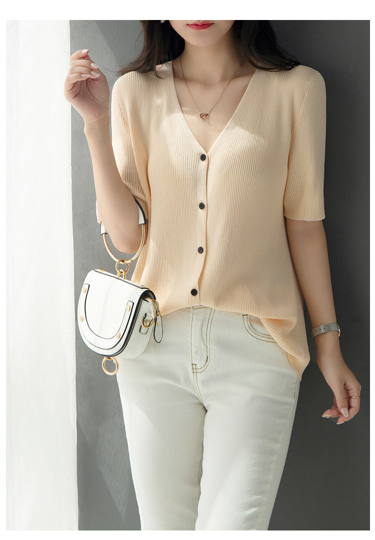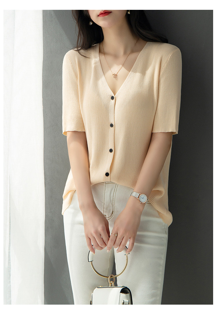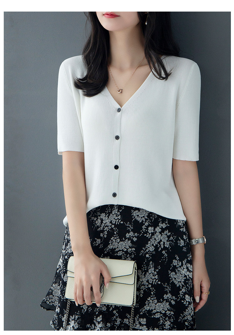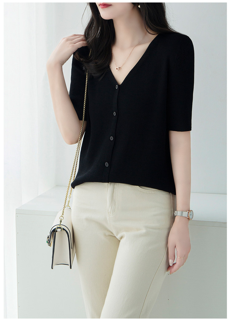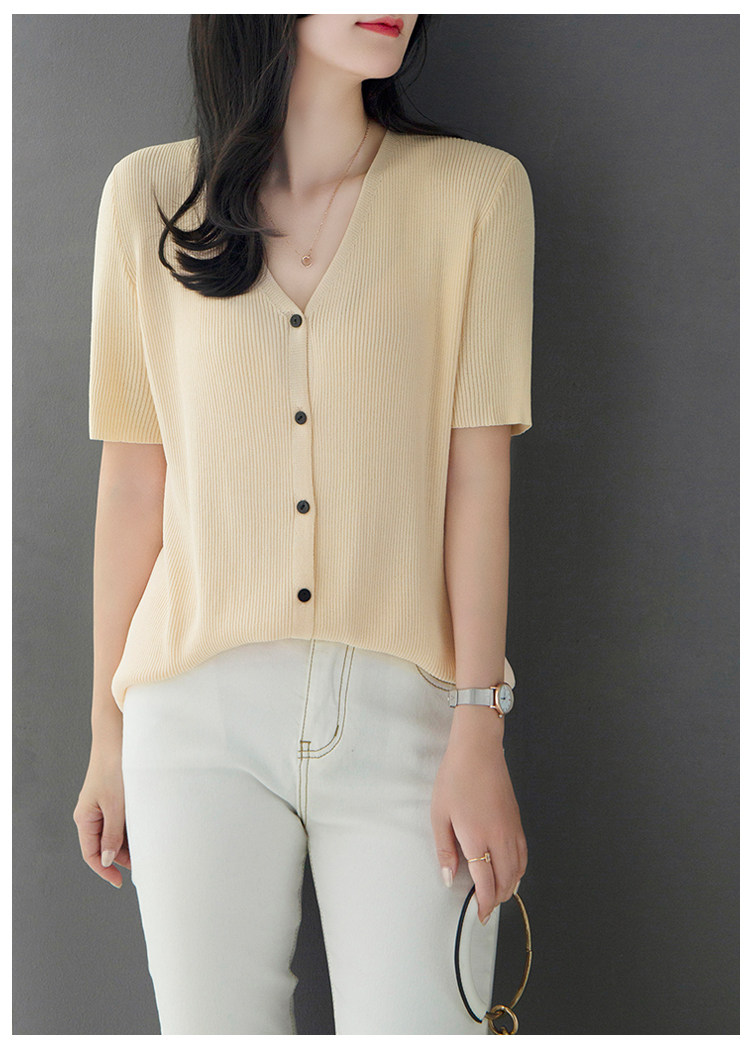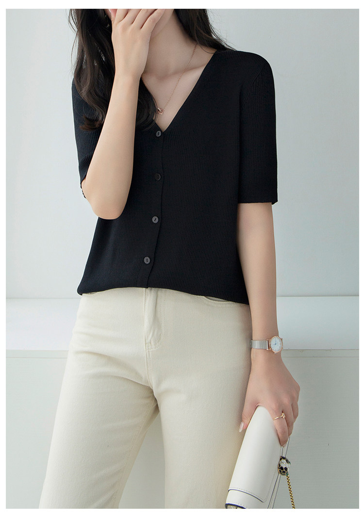 Трикотажный летний свитер, однотонный базовый кардиган, короткий рукав, V-образный вырез, в западном стиле
