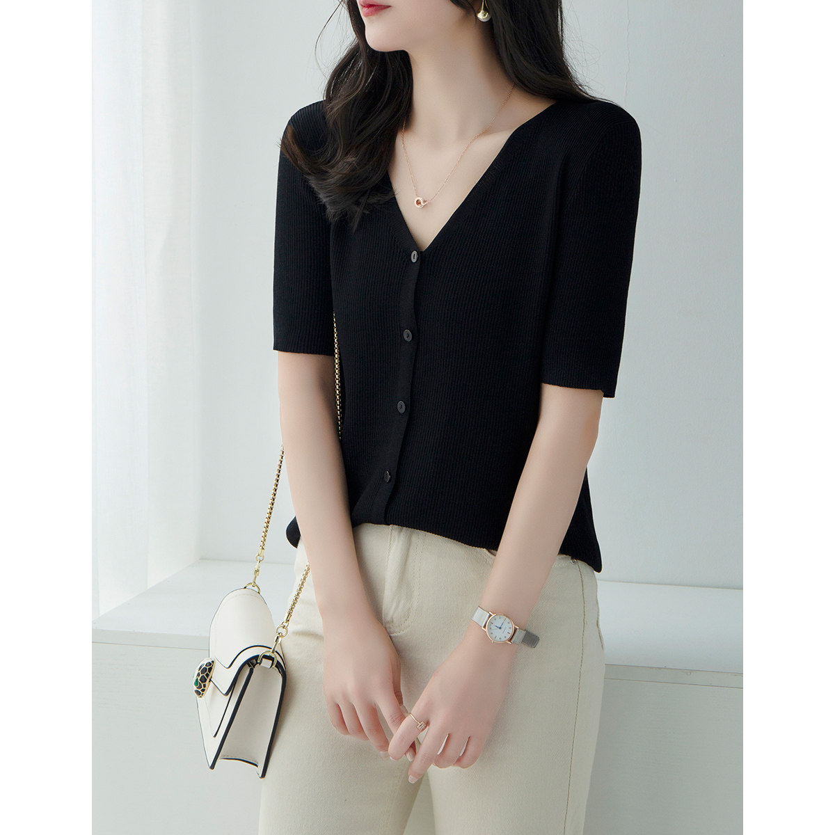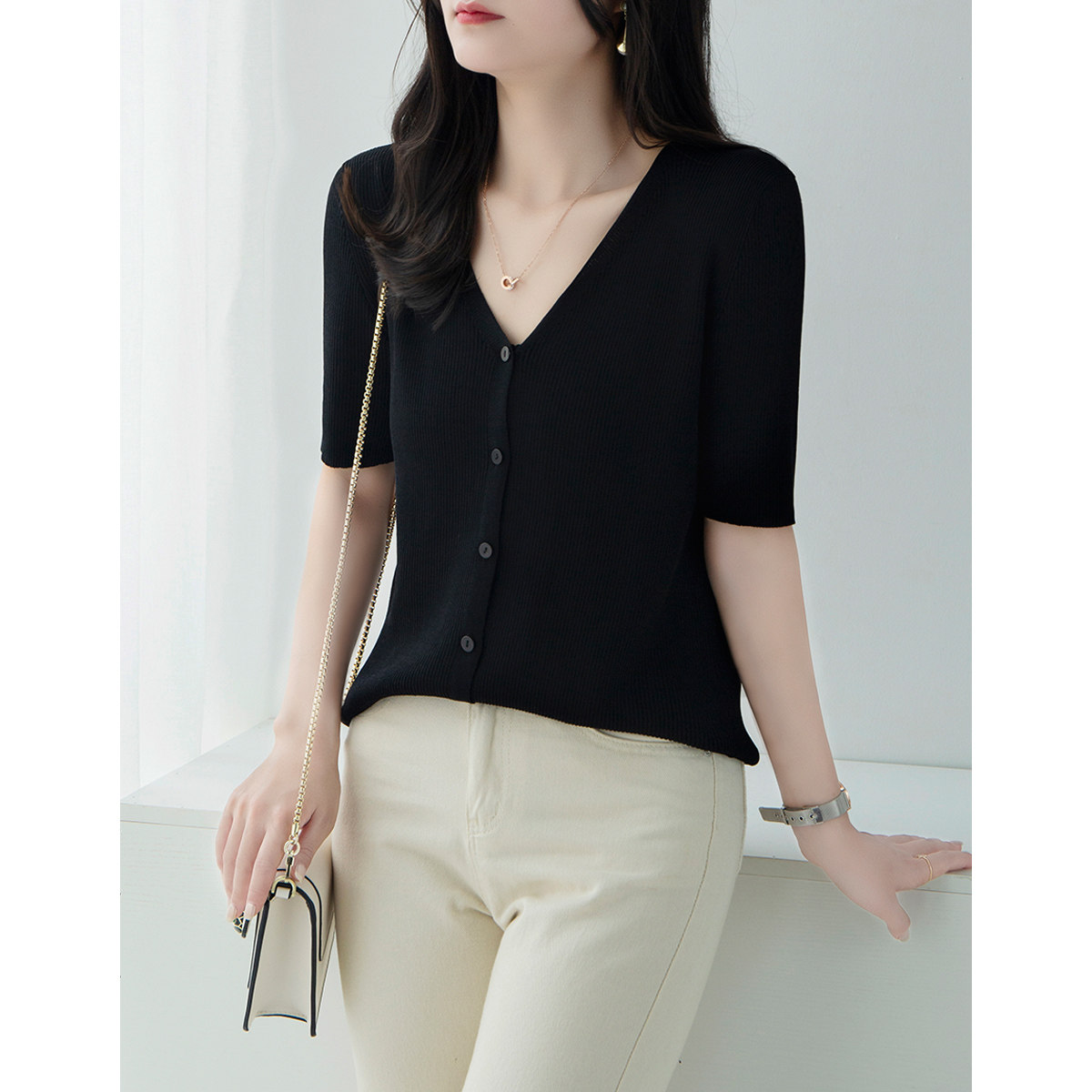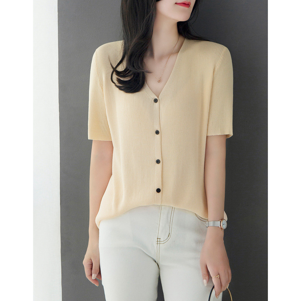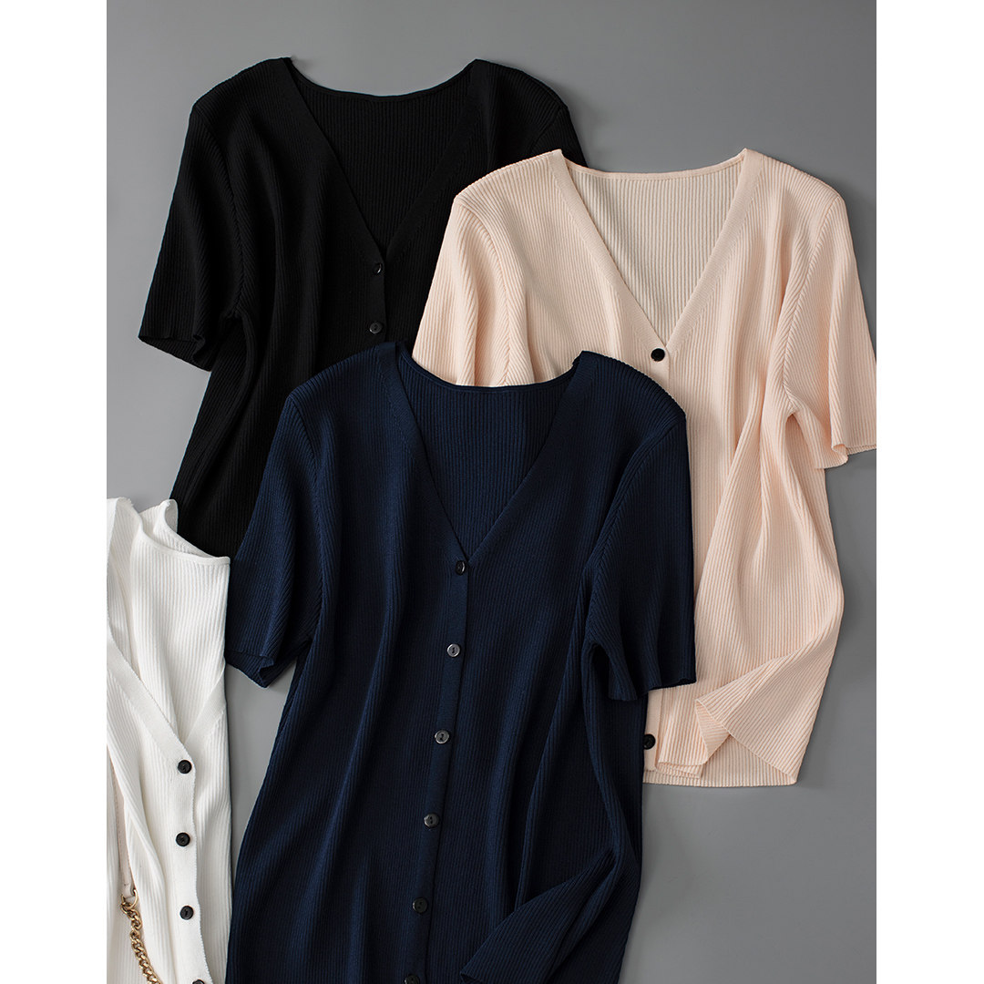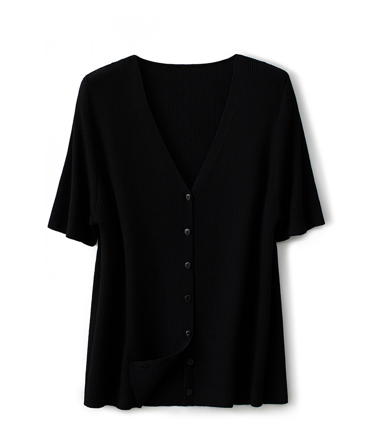 Трикотажный летний свитер, однотонный базовый кардиган, короткий рукав, V-образный вырез, в западном стиле