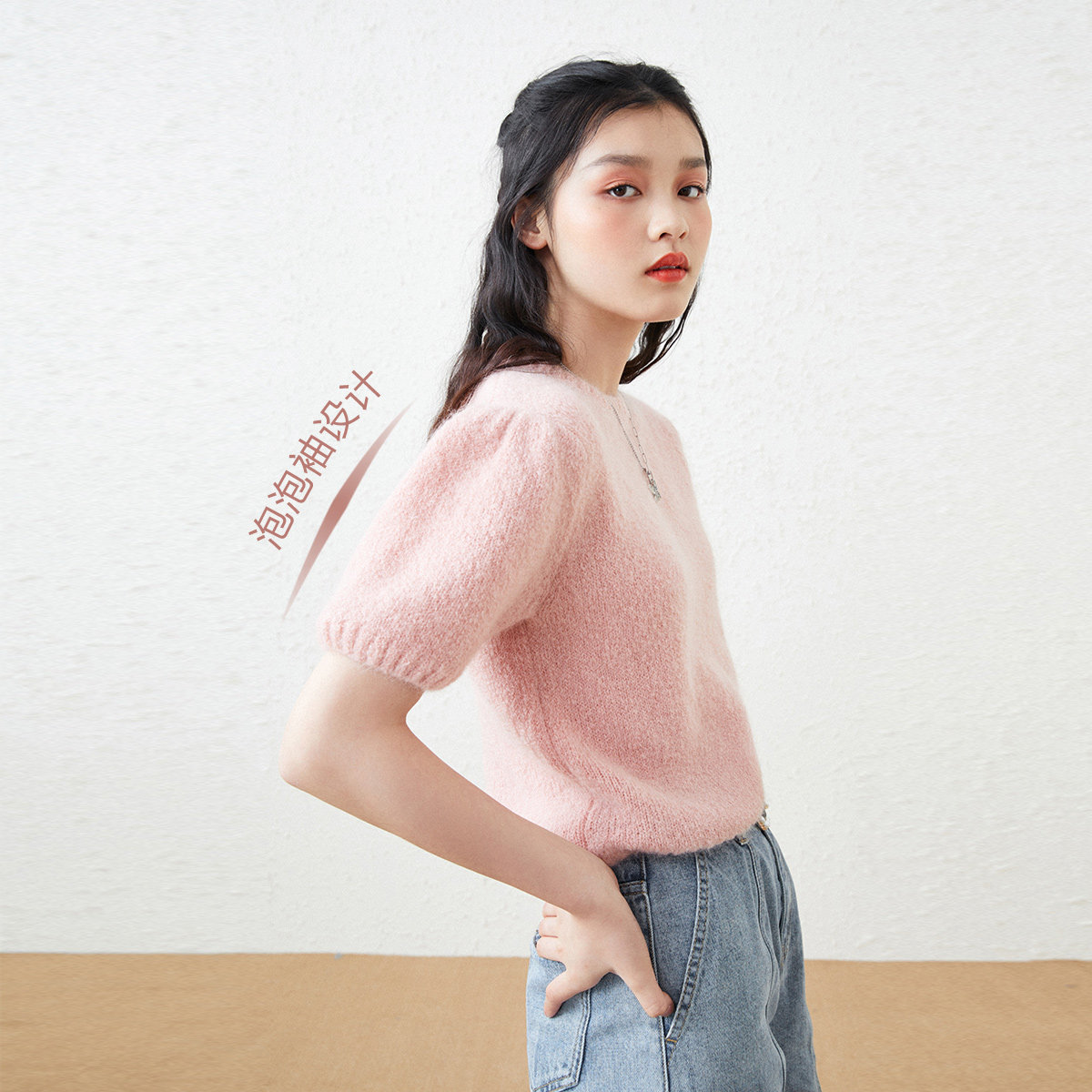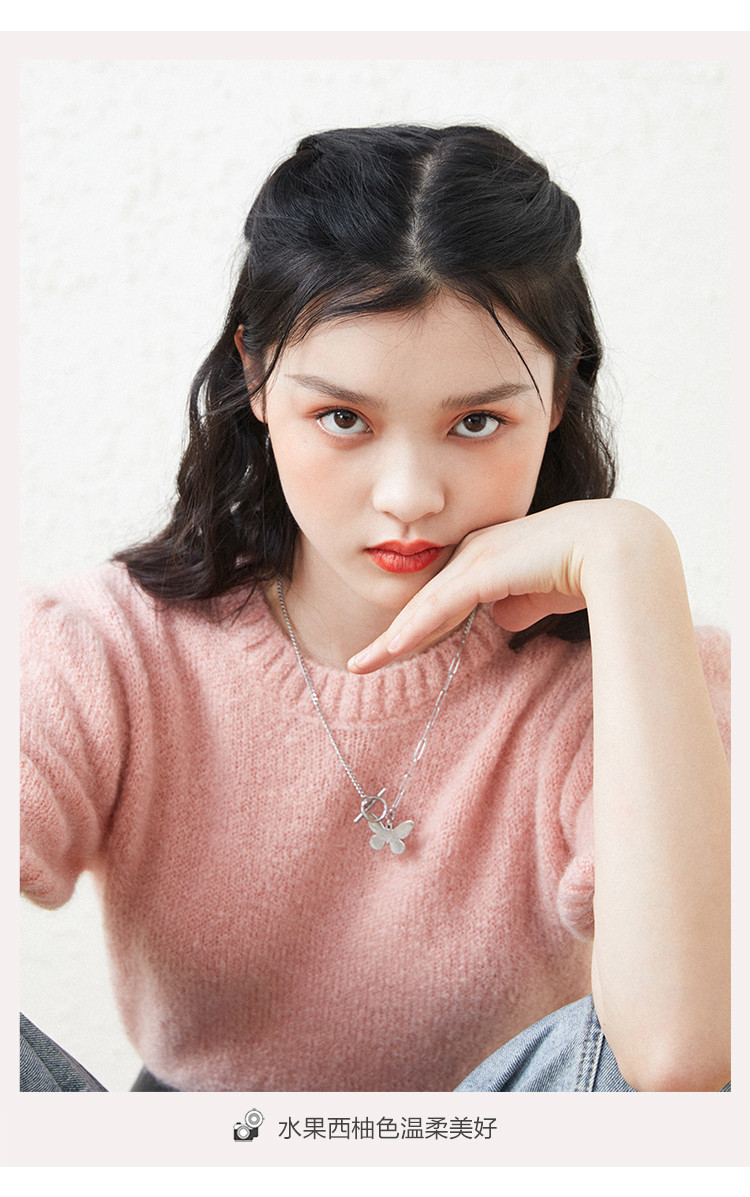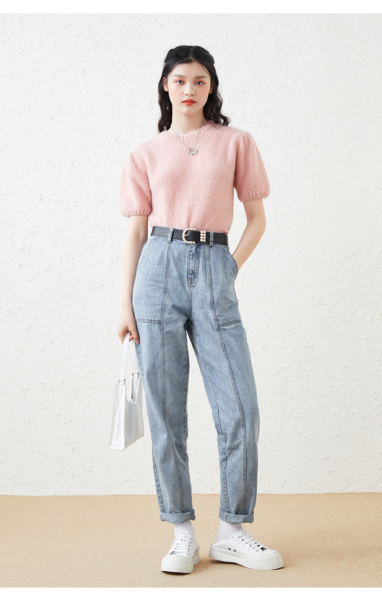 Розовый трикотажный осенний базовый свитер с круглым воротником, рукава фонарики, 2020