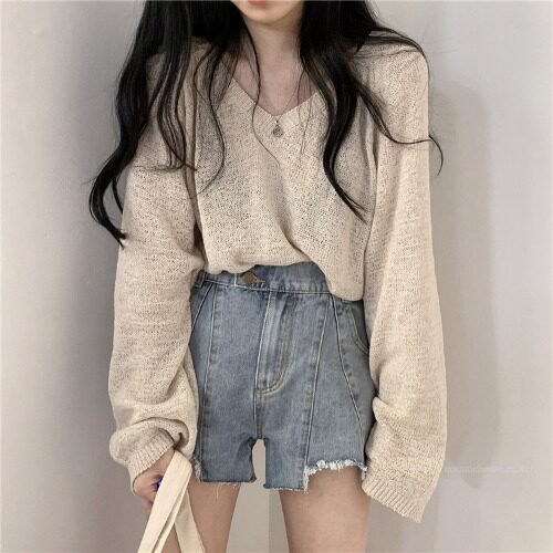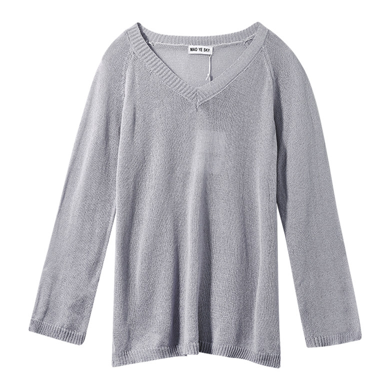 Трикотажный лонгслив, осенний весенний тонкий свитер, V-образный вырез, коллекция 2023, оверсайз