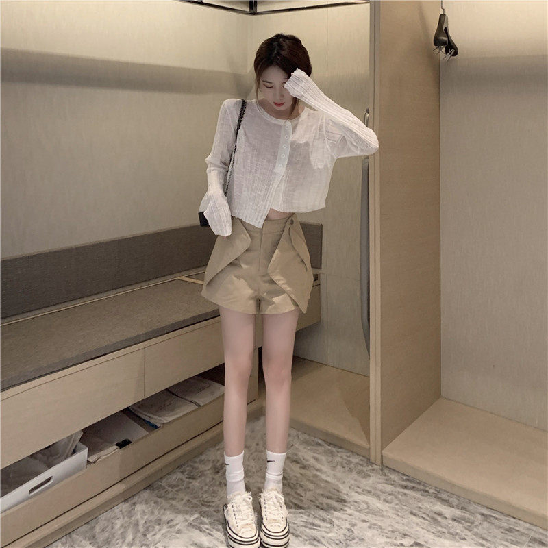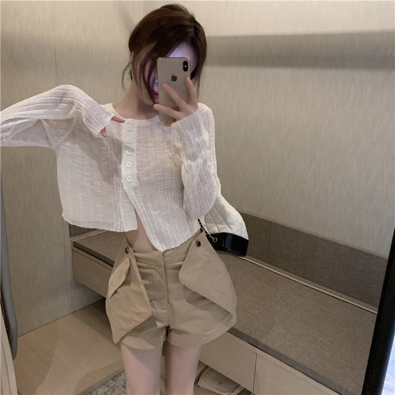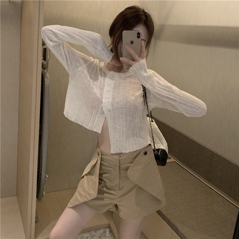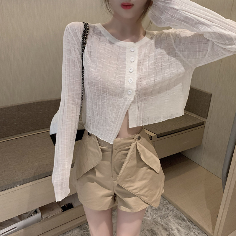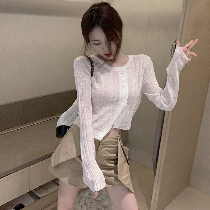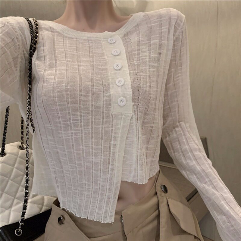 Белый тонкий осенний кардиган, короткий приталенный лонгслив, защита от солнца, в корейском стиле