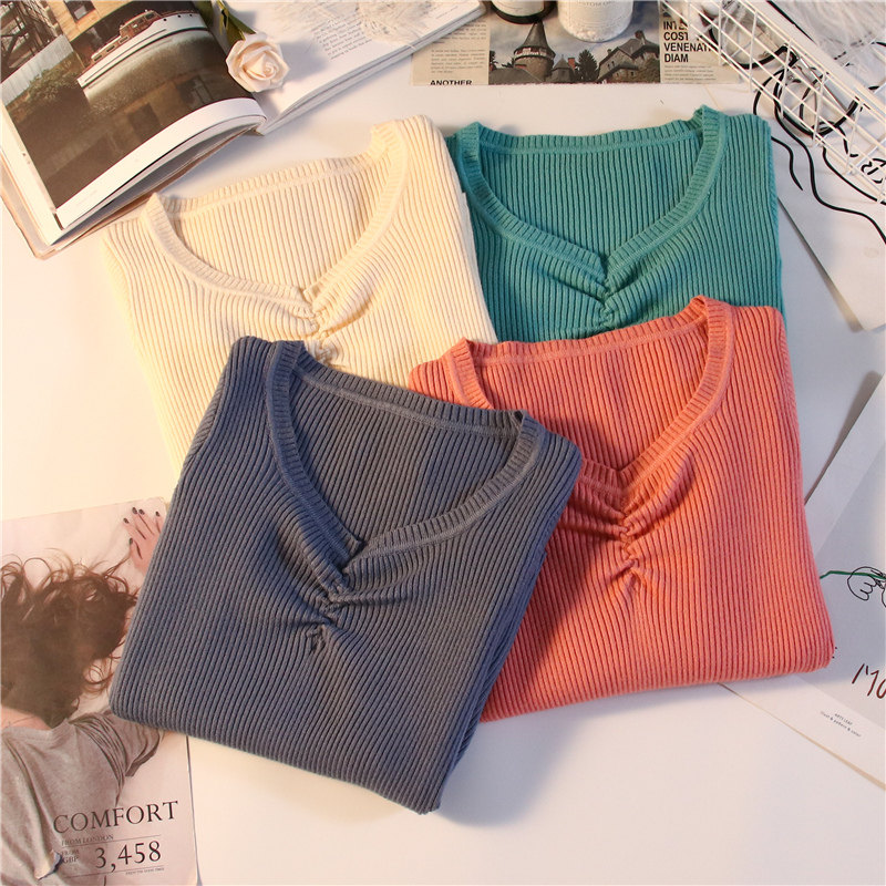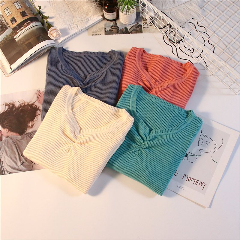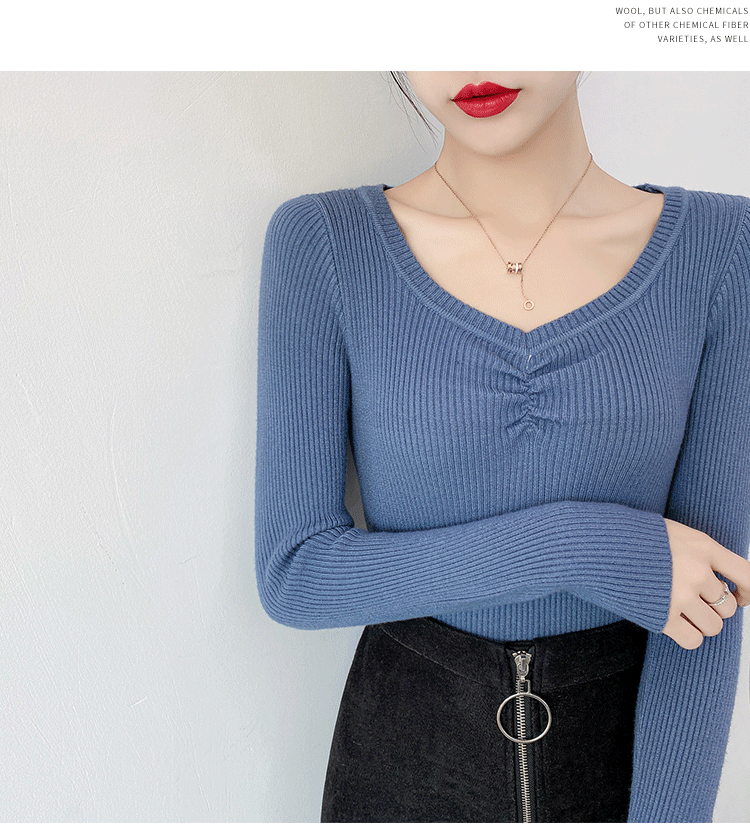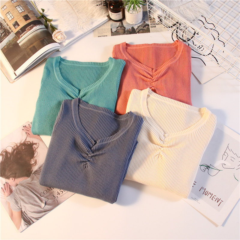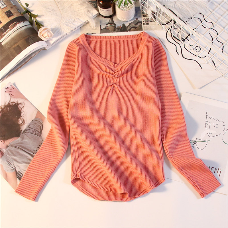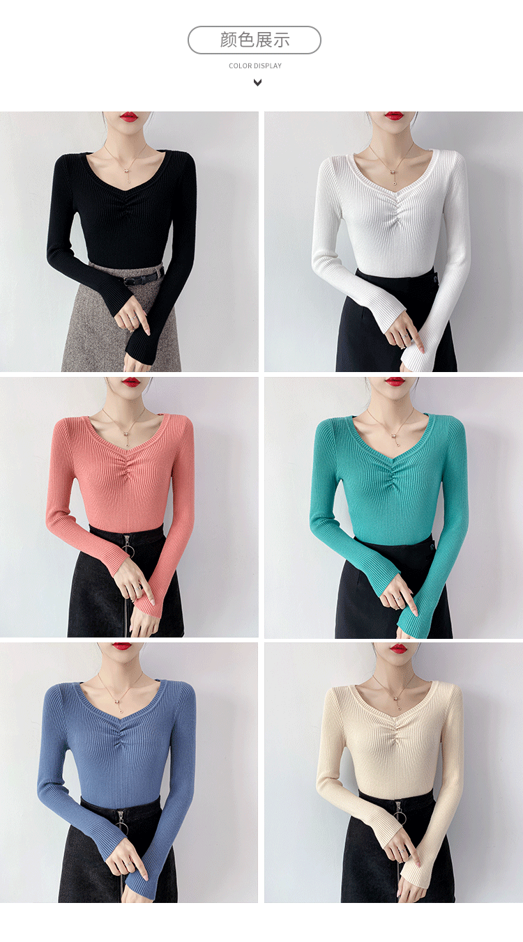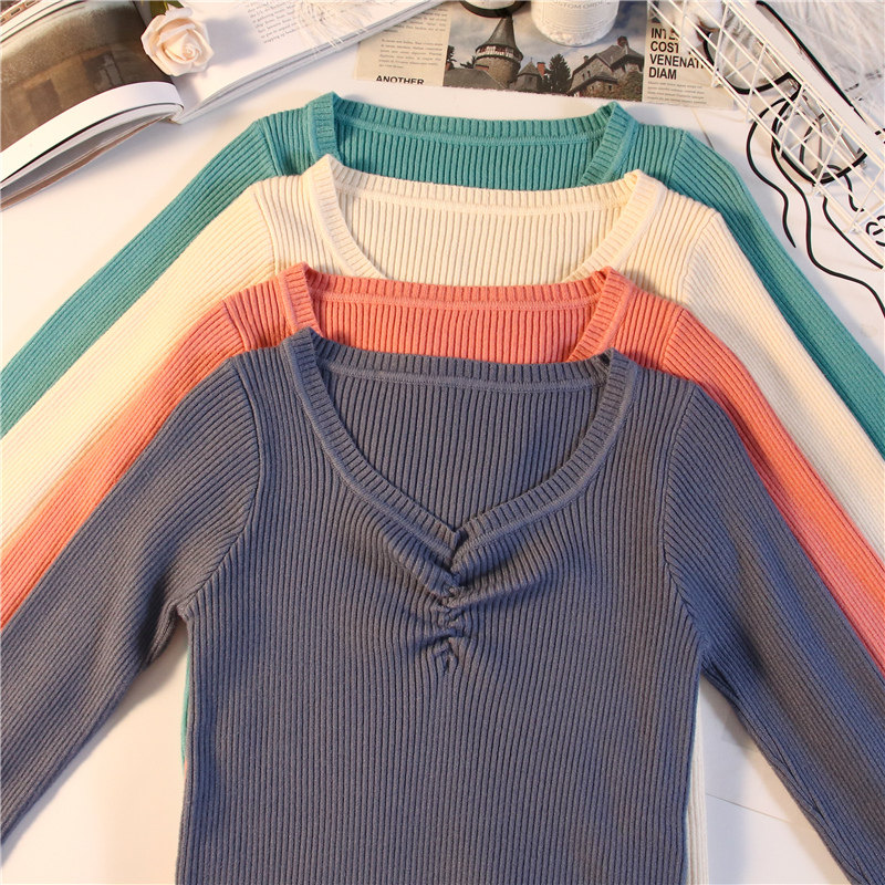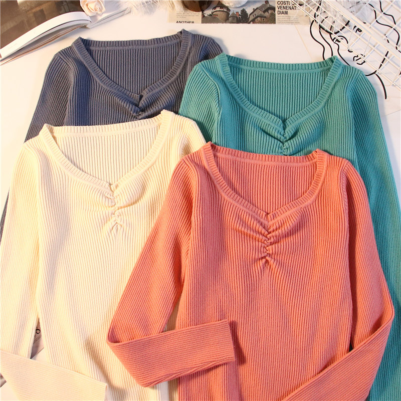 Демисезонный приталенный свитер, тонкий трикотажный короткий лонгслив, в обтяжку, V-образный вырез