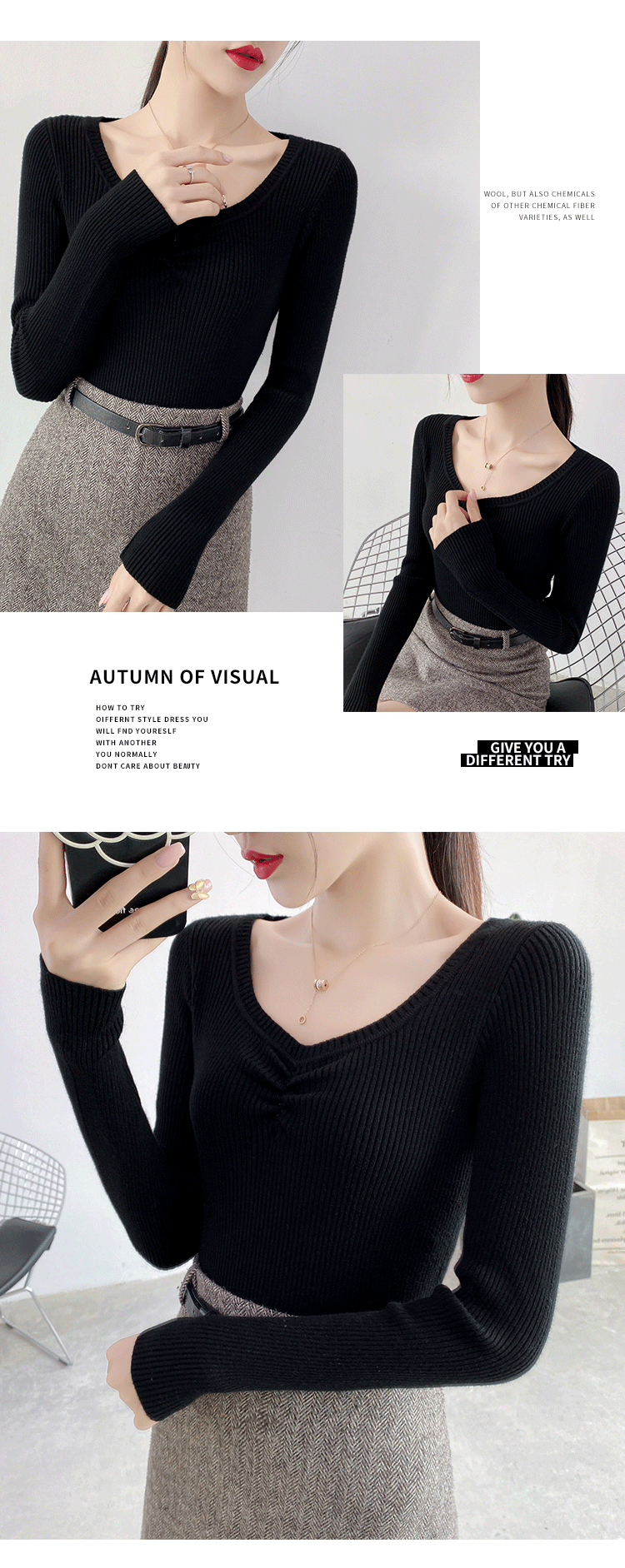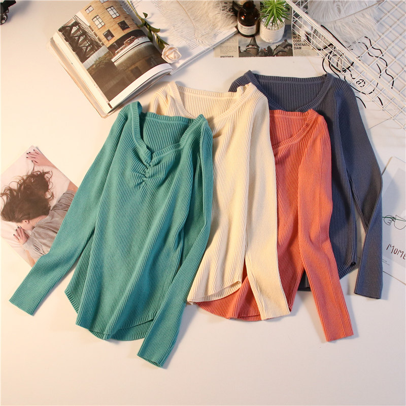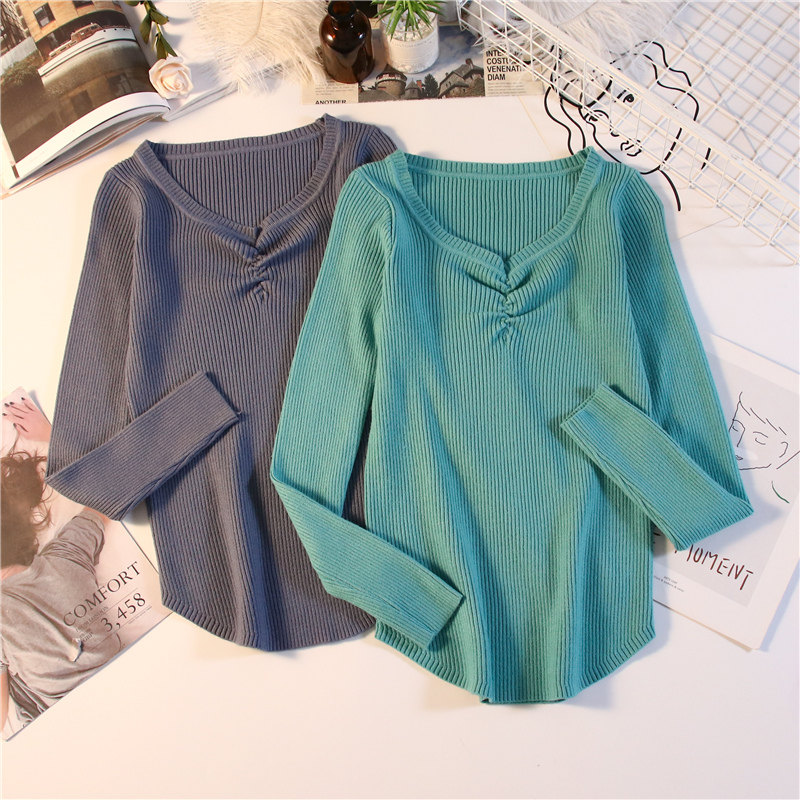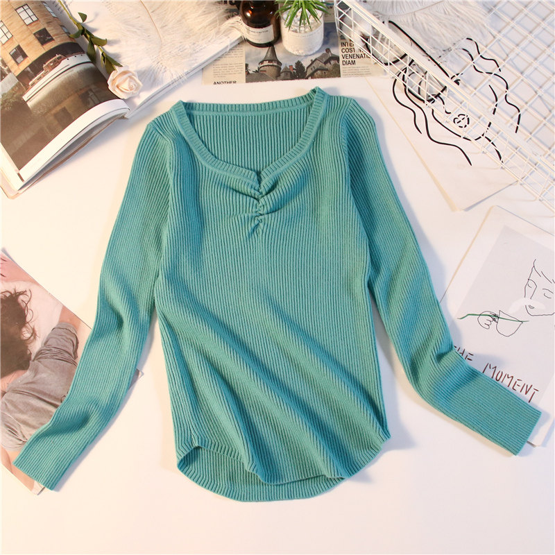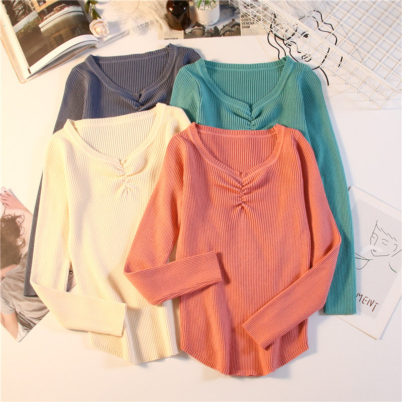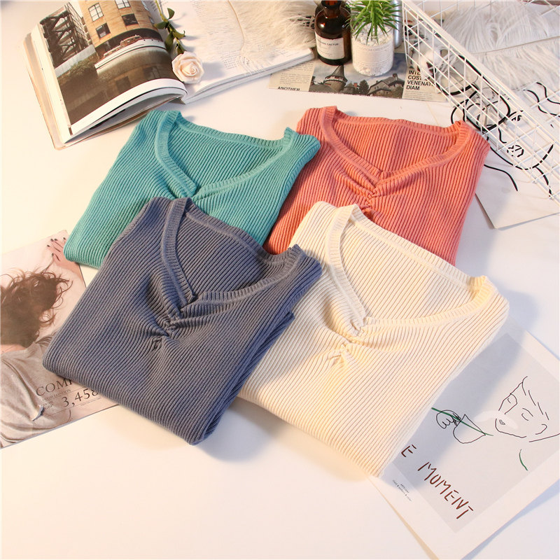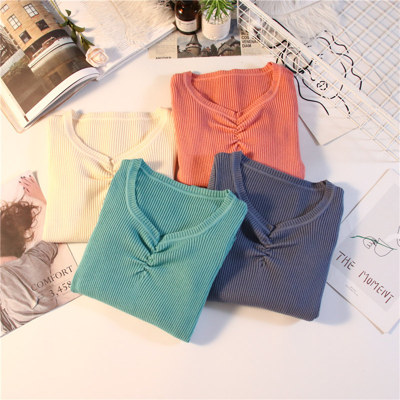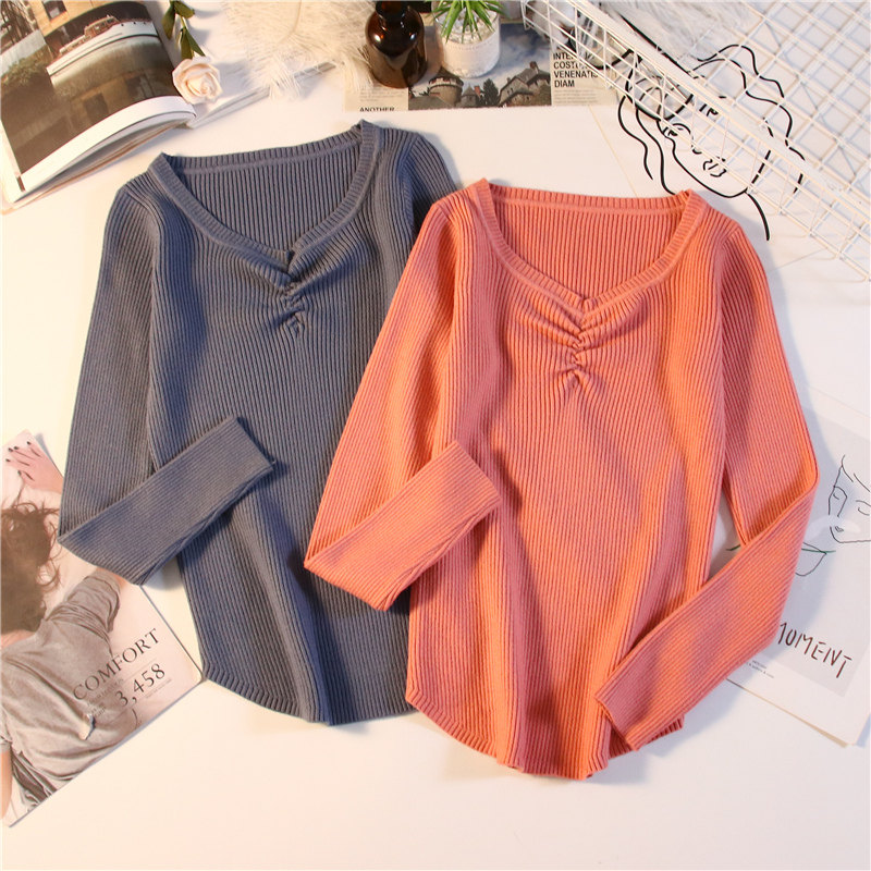 Демисезонный приталенный свитер, тонкий трикотажный короткий лонгслив, в обтяжку, V-образный вырез