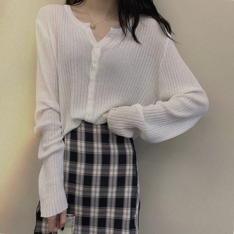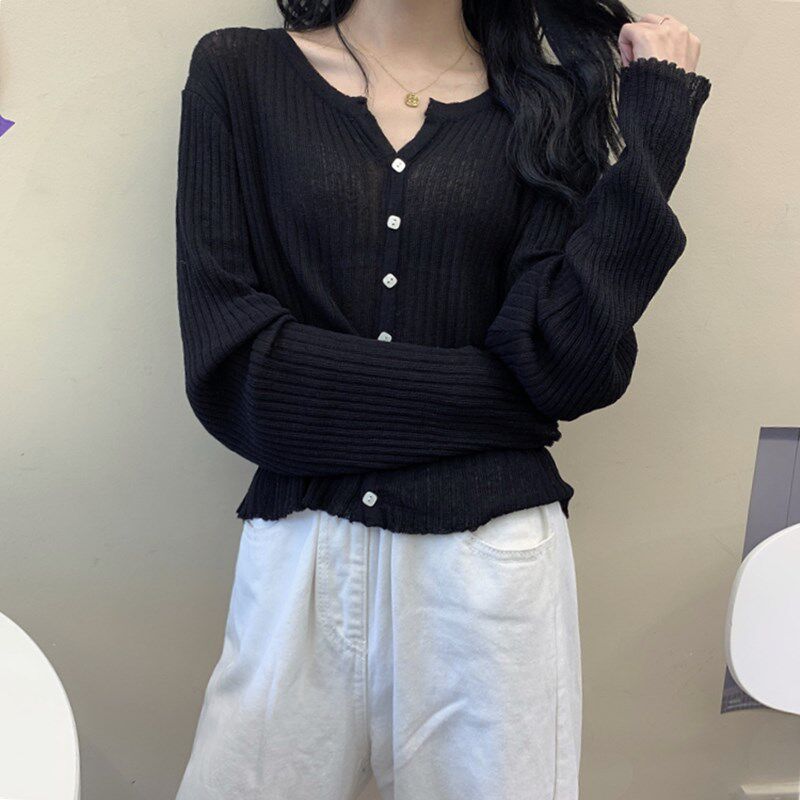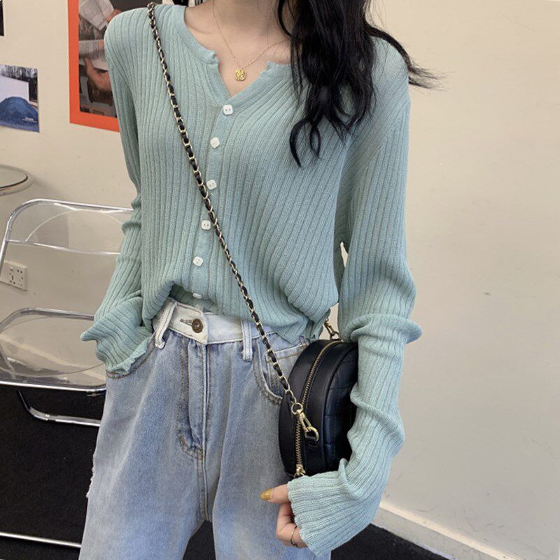 Однотонный трикотажный свитер, осенняя защитная застежка, короткий лонгслив, 2023, в корейском стиле, защита от солнца