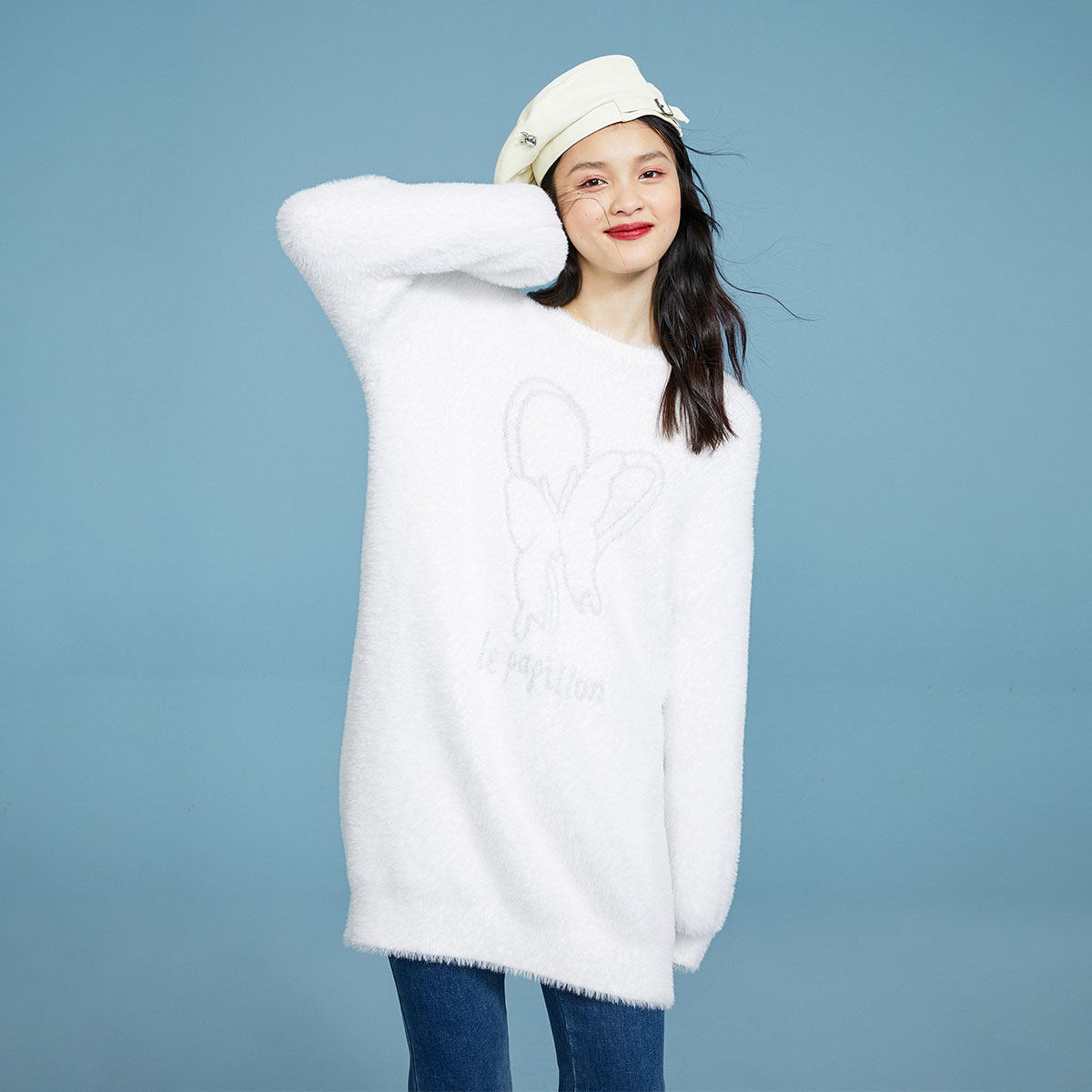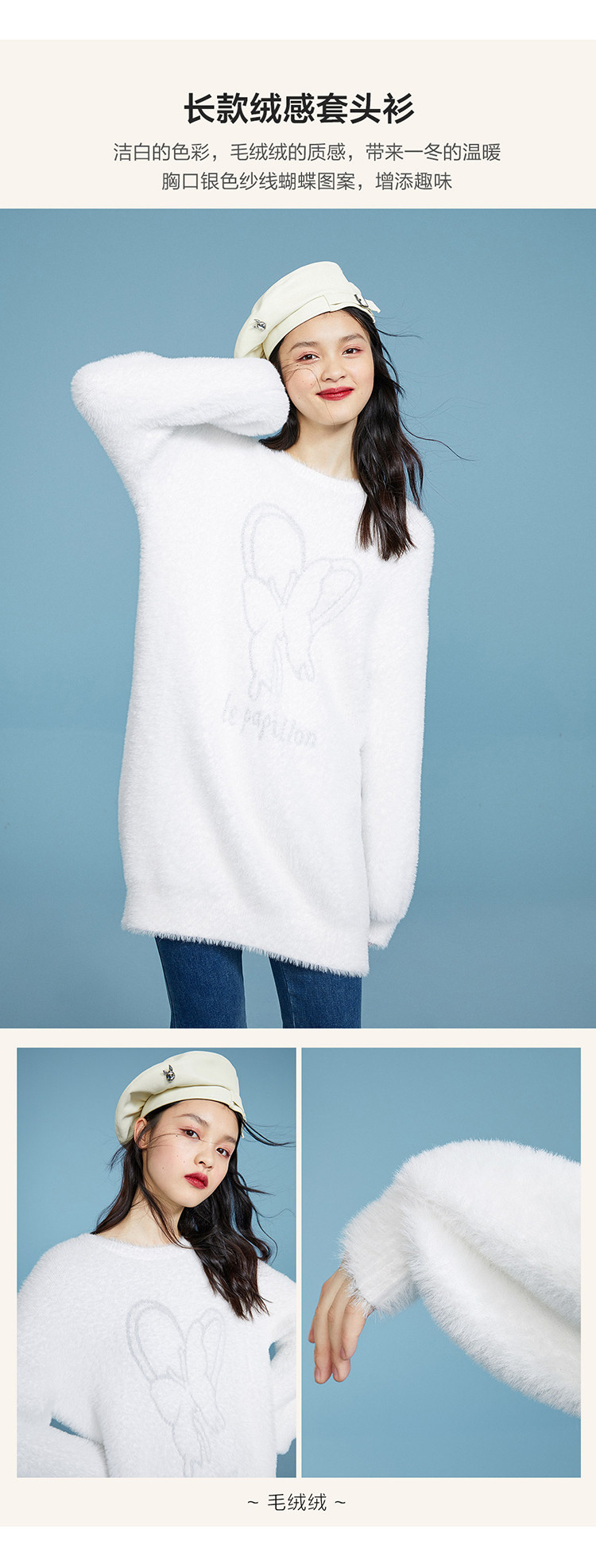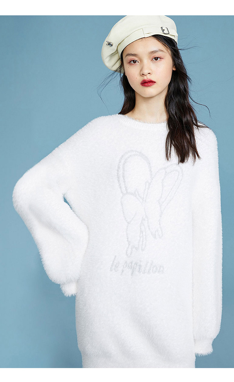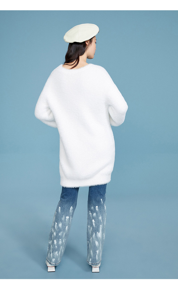 Белый длинный комплект, трикотажный зимний бархатный свитер с круглым воротником, набивка пером, 2020