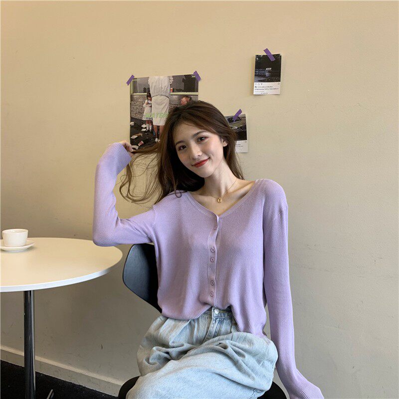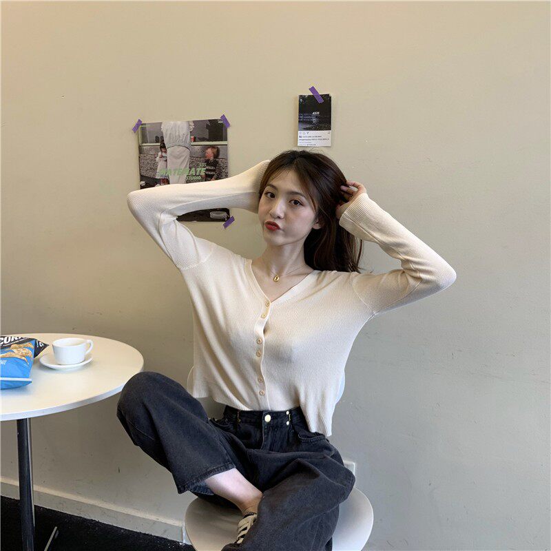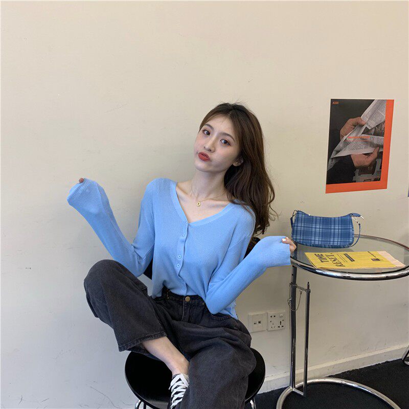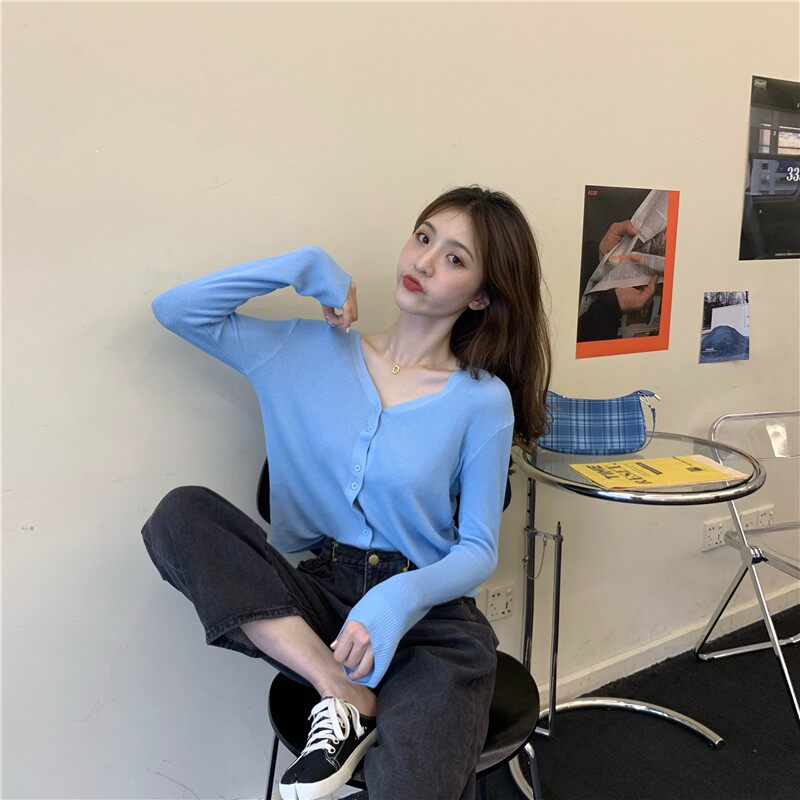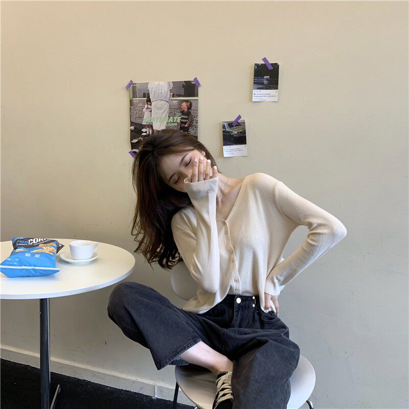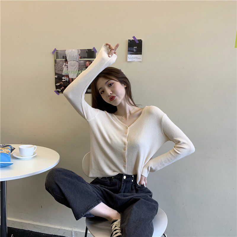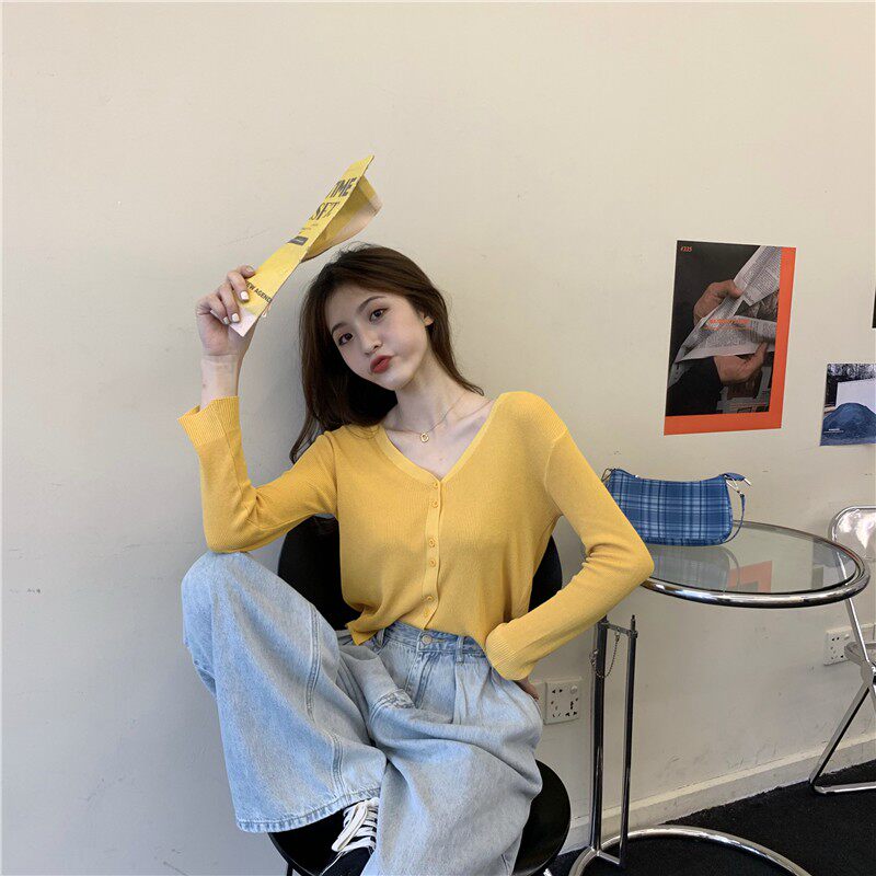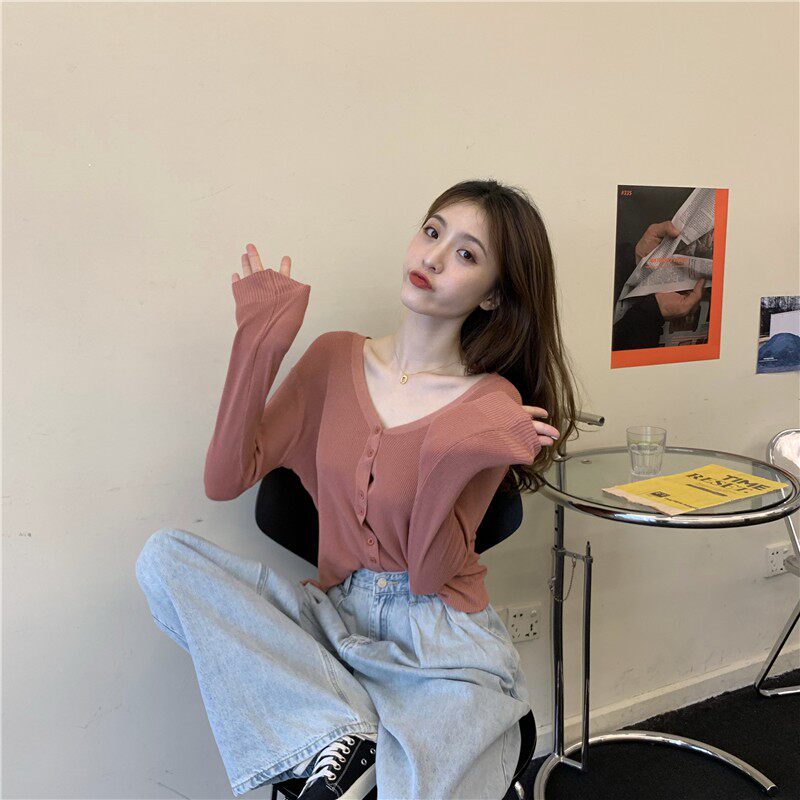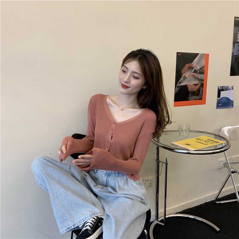 Тонкий однотонный кардиган, осенний лонгслив, свитер, 2020, в корейском стиле