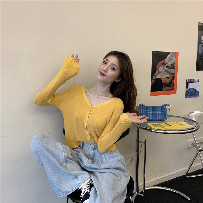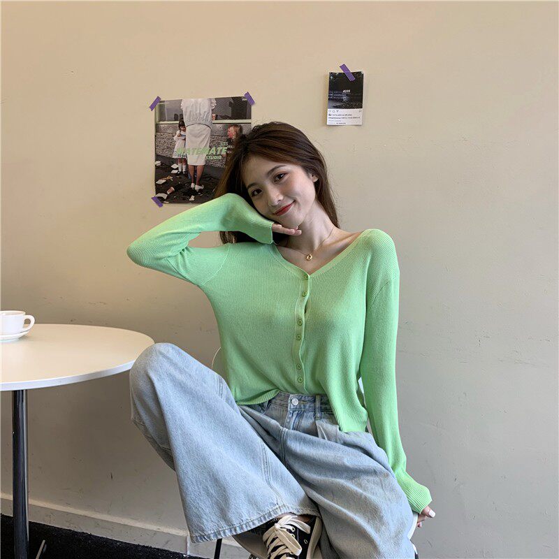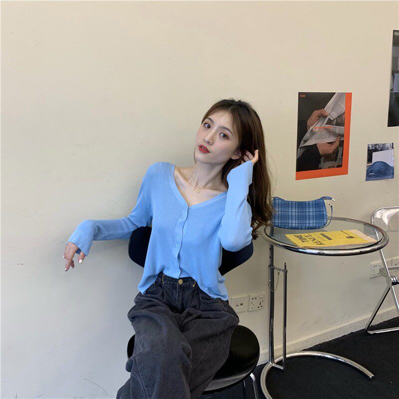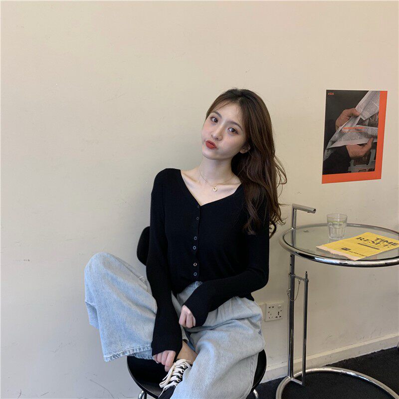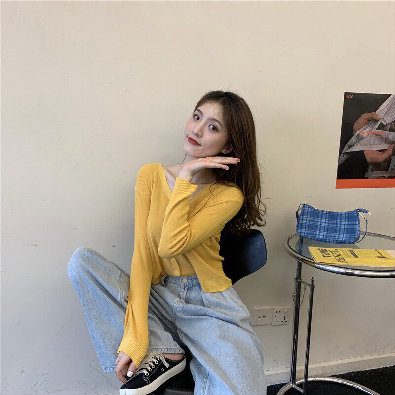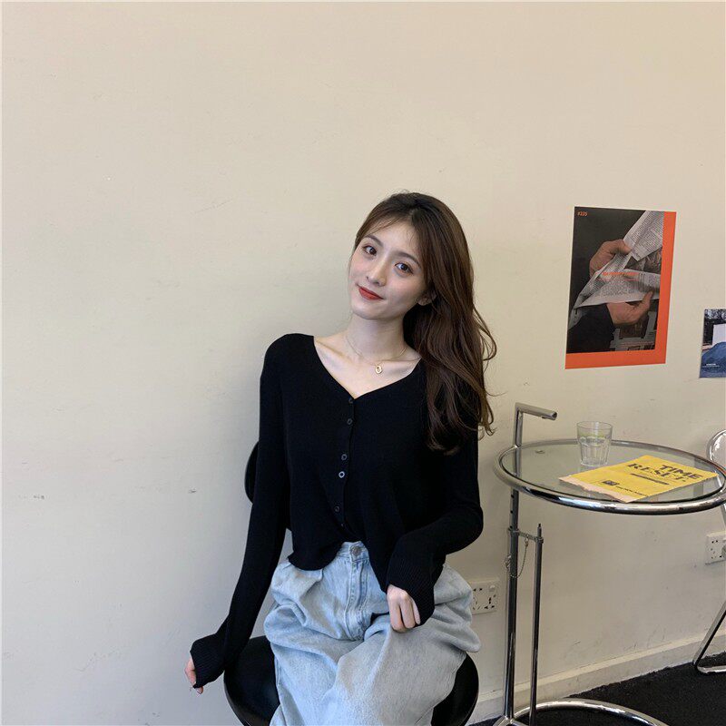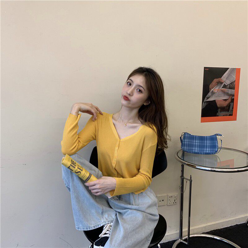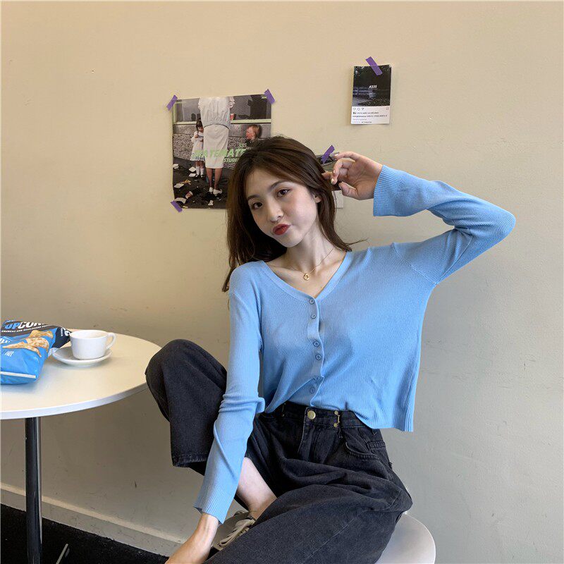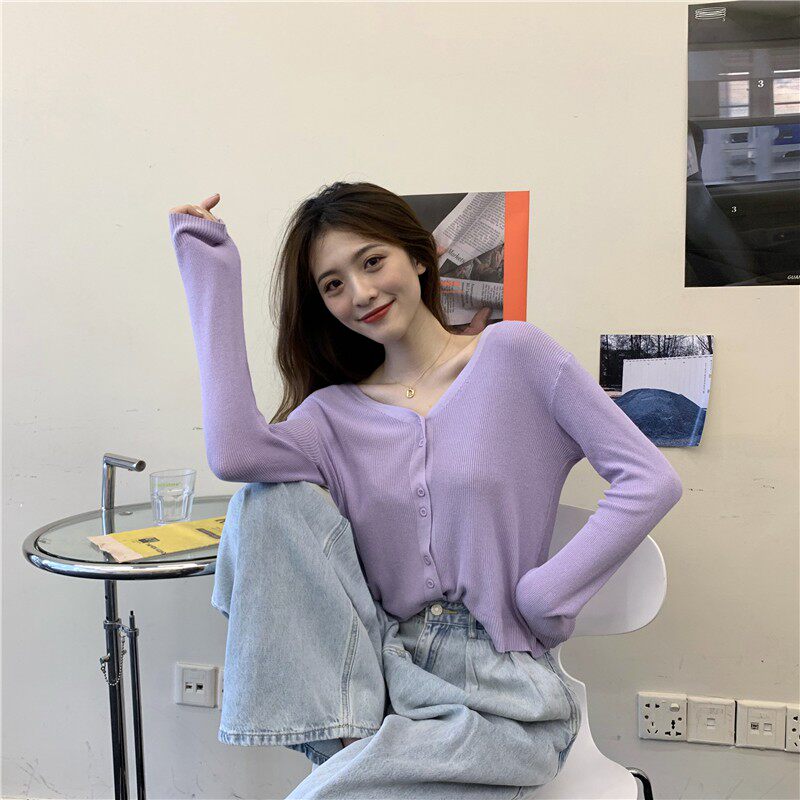 Тонкий однотонный кардиган, осенний лонгслив, свитер, 2020, в корейском стиле
