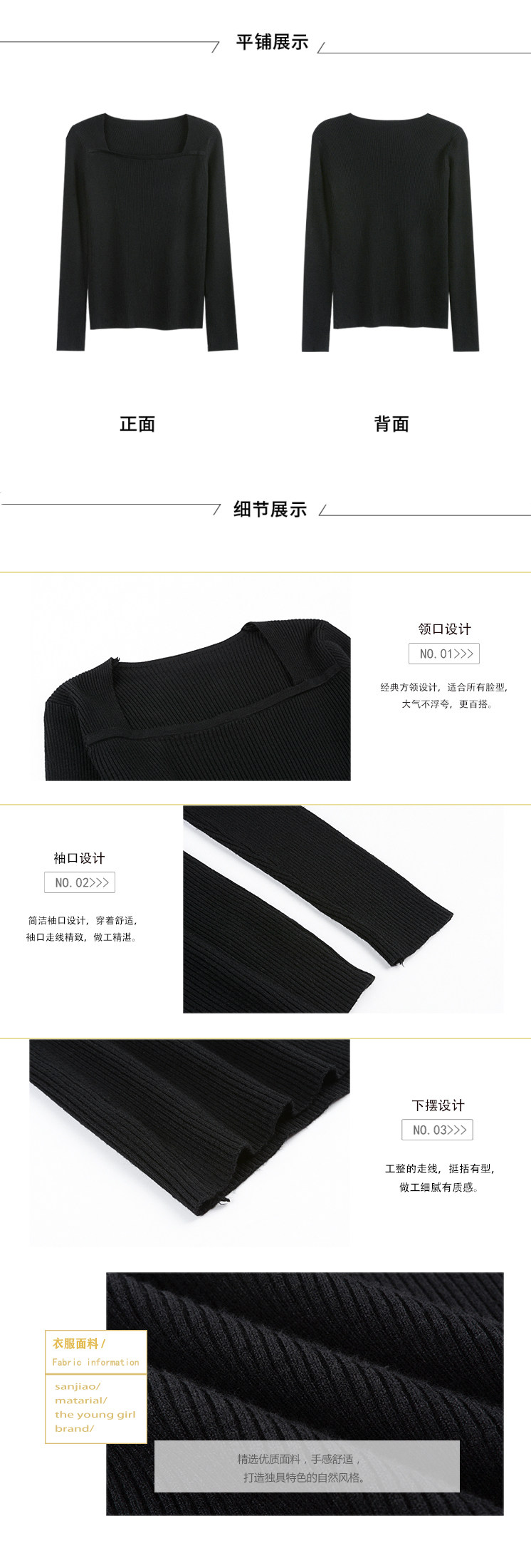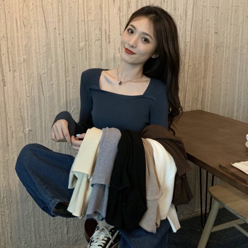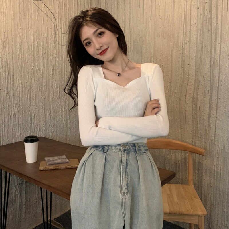 Трикотажный приятный телу осенний черный лонгслив, свитер, квадратный вырез, облегающий крой, в обтяжку