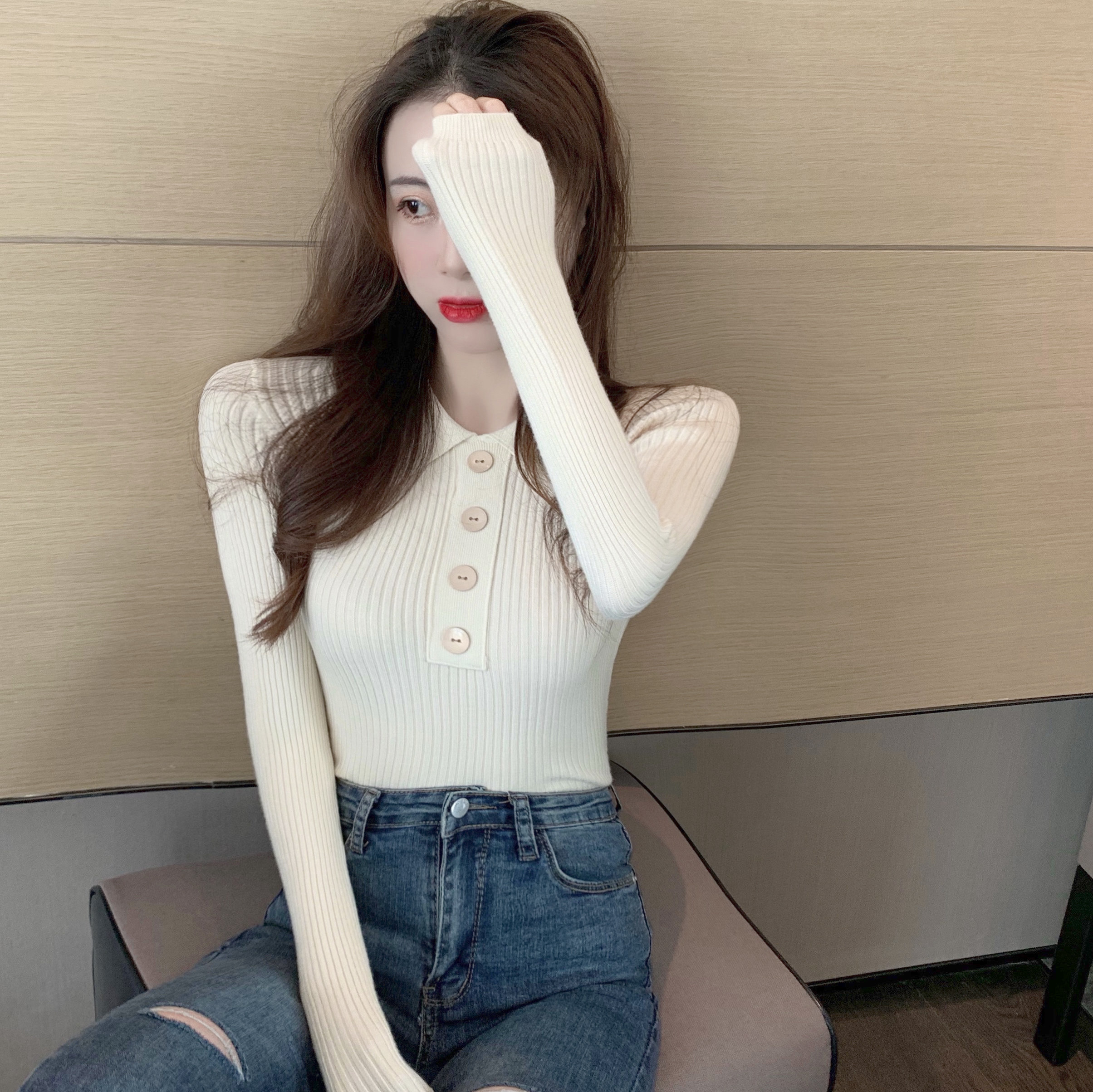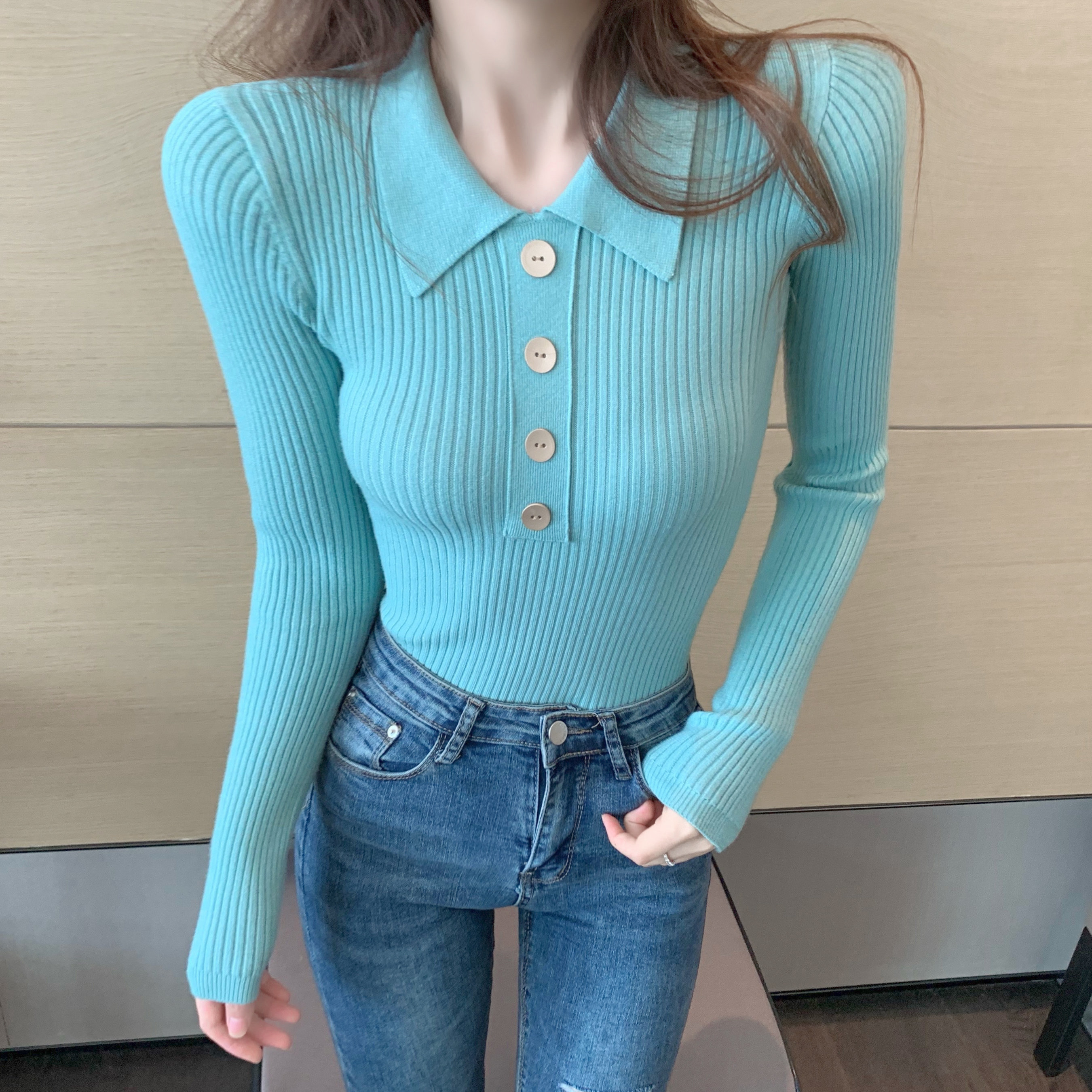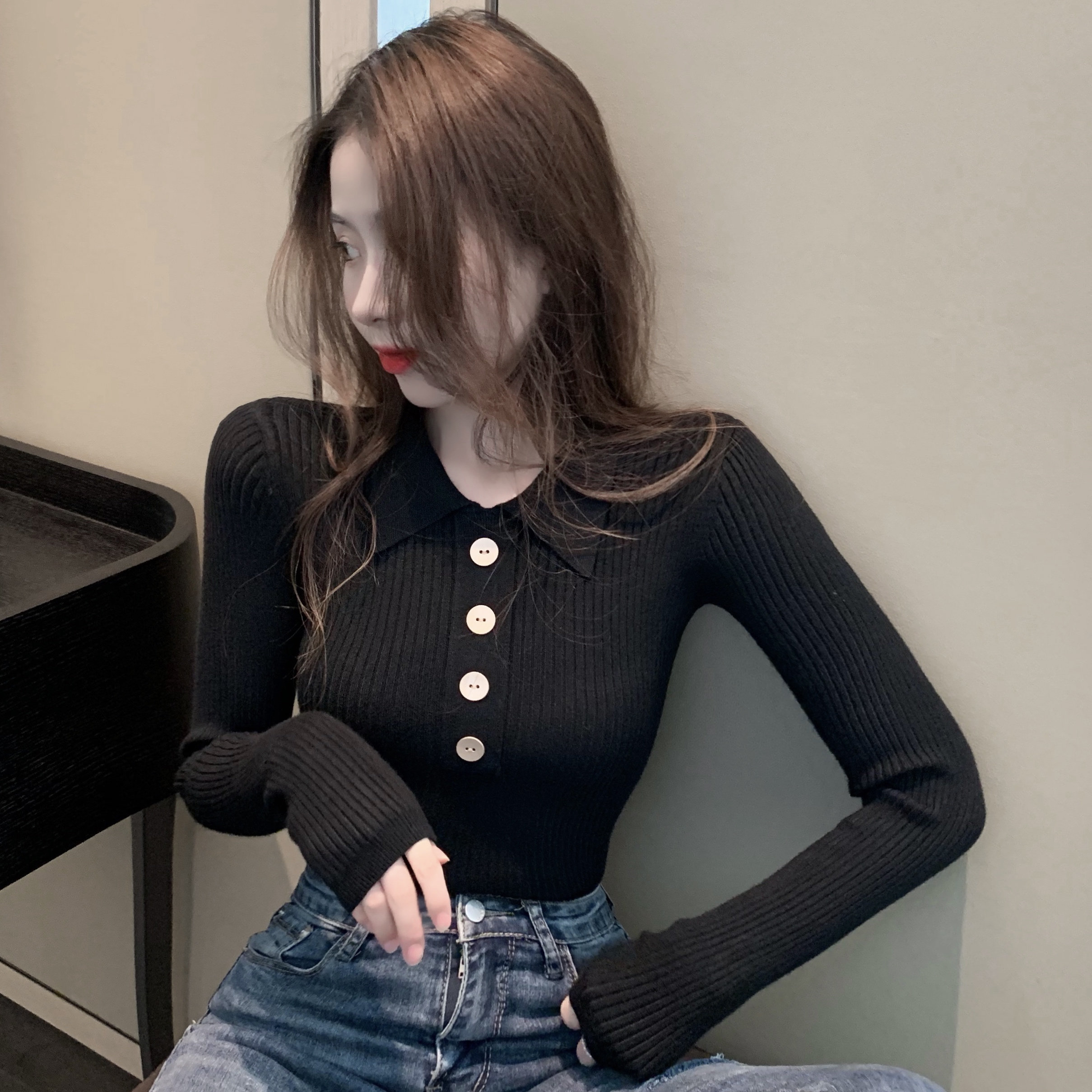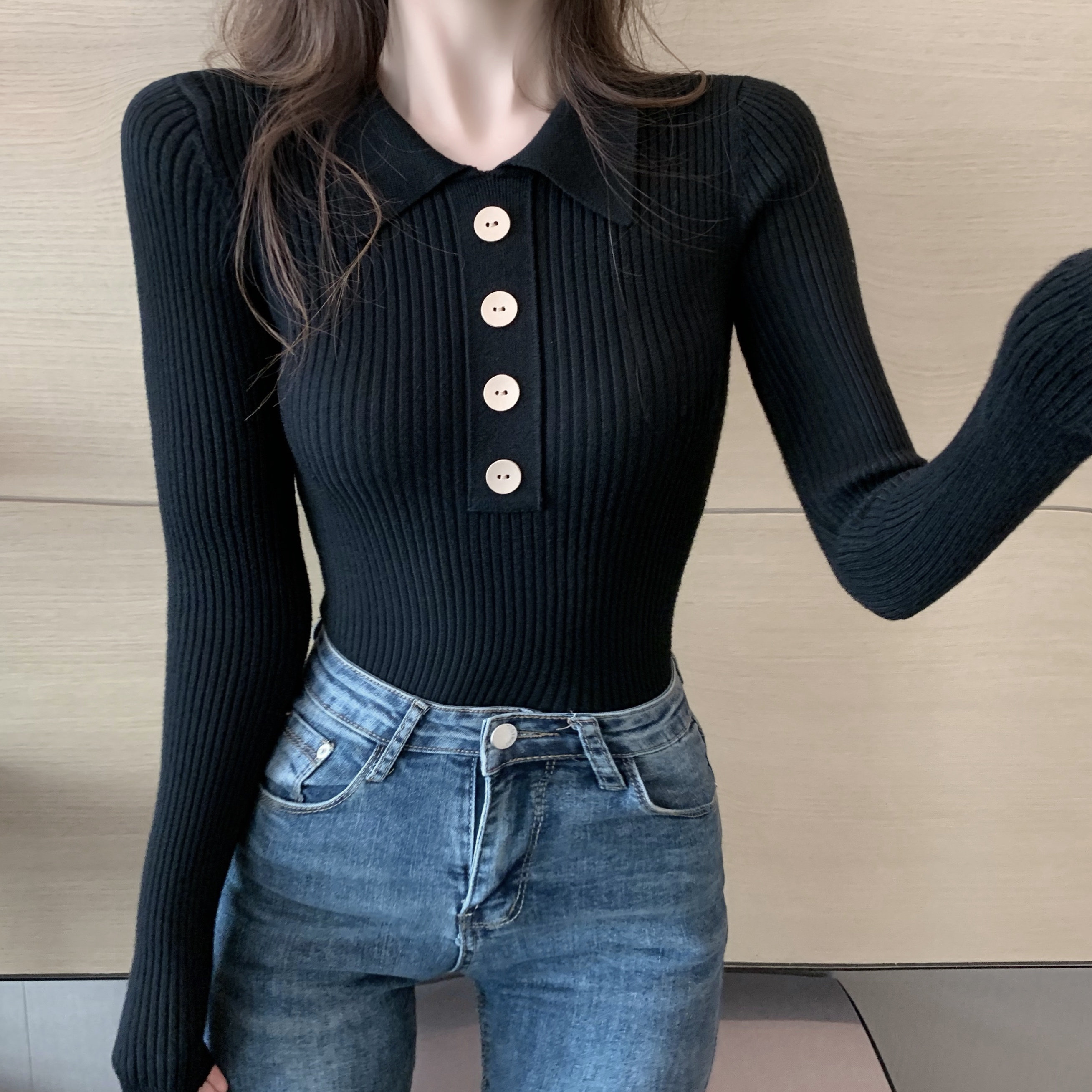 Демисезонный свитер, базовый приятный телу приталенный трикотажный лонгслив, в обтяжку, в западном стиле, воротник поло, с рукавом