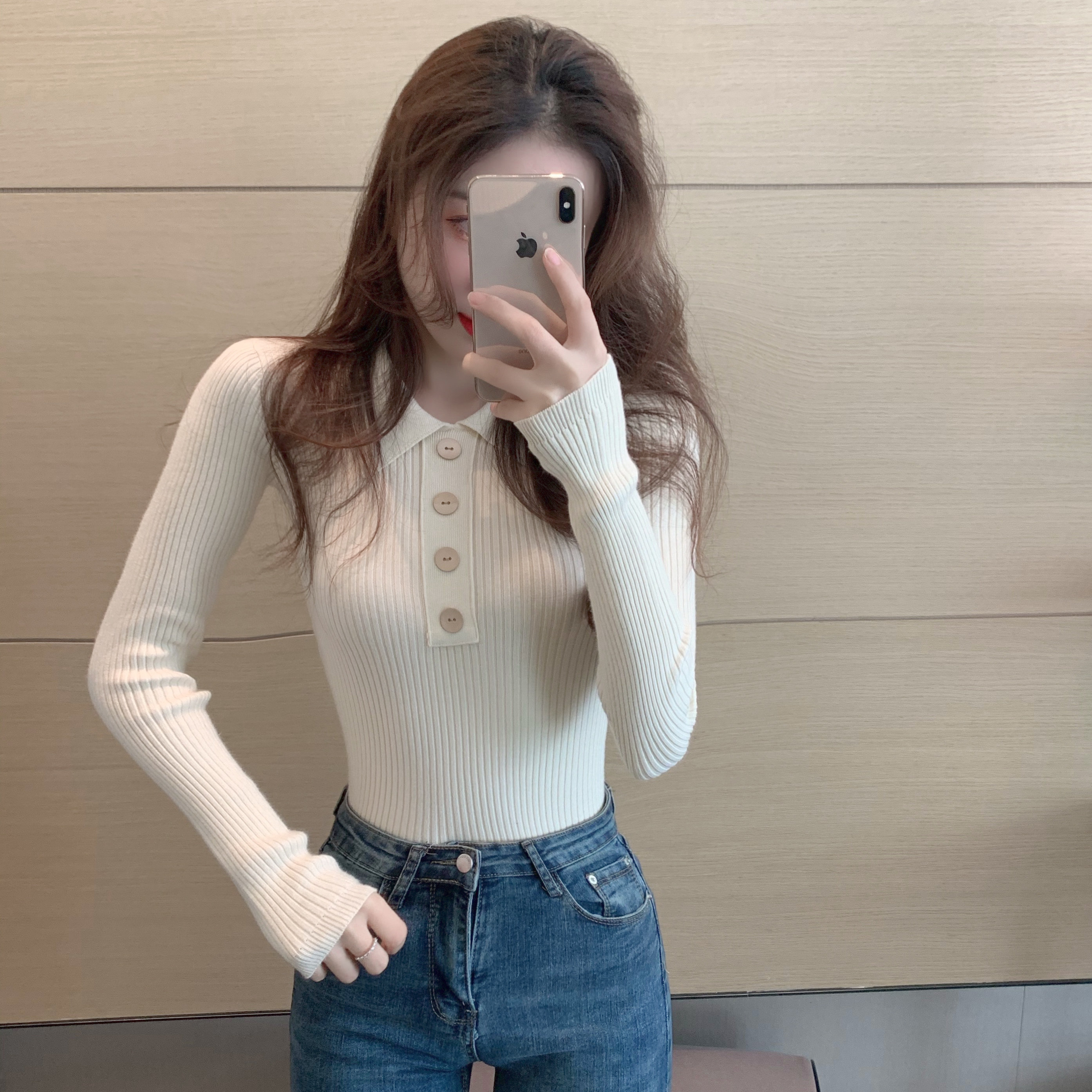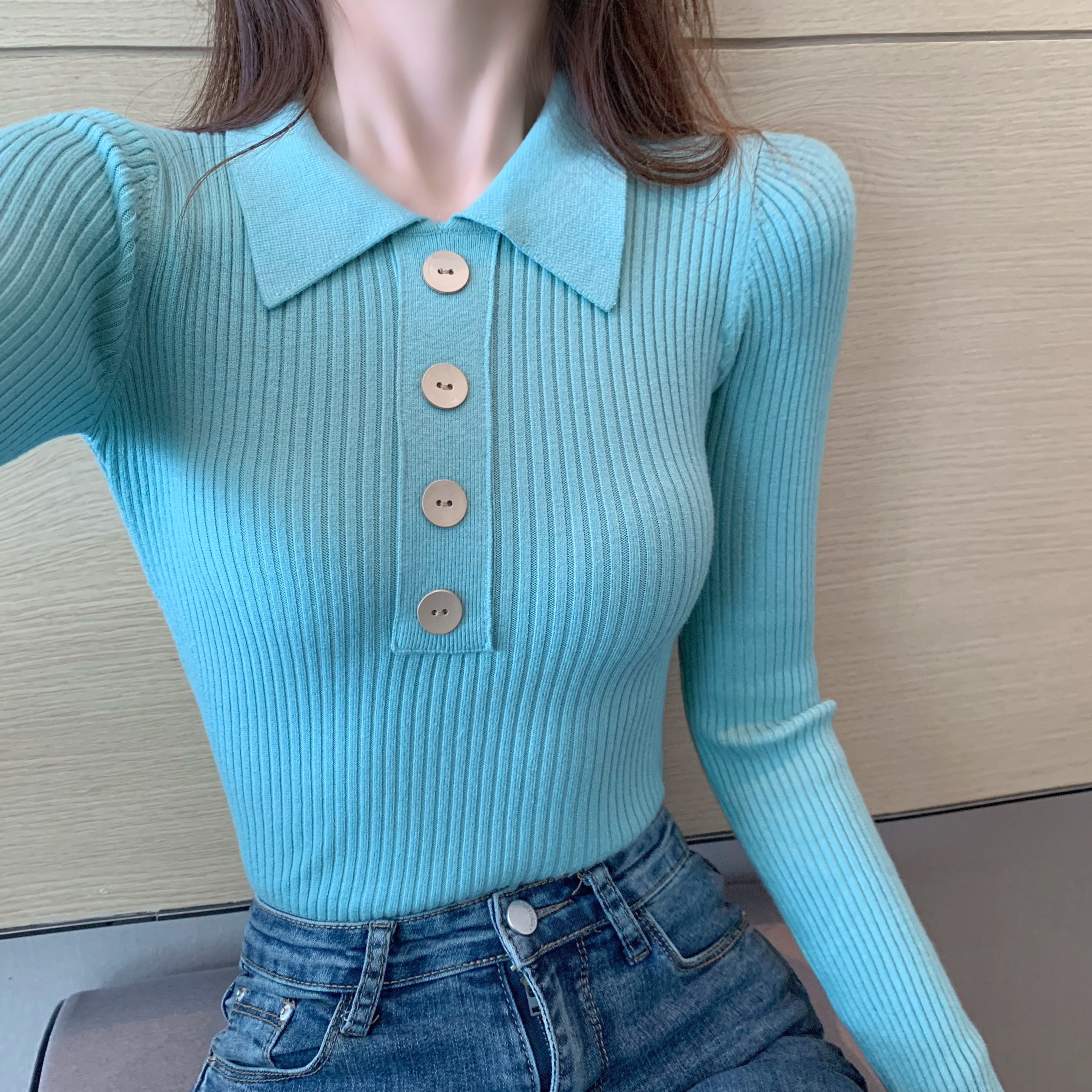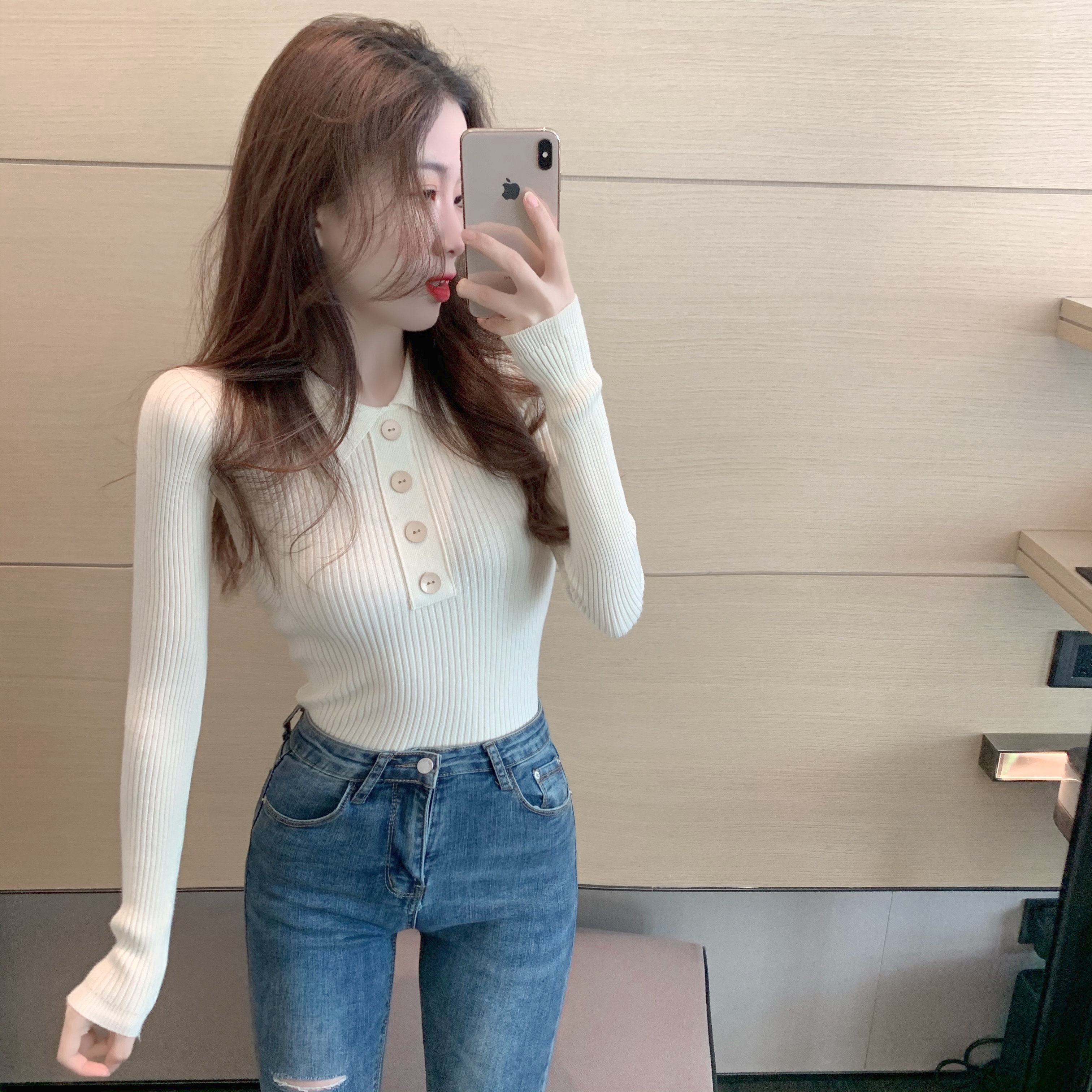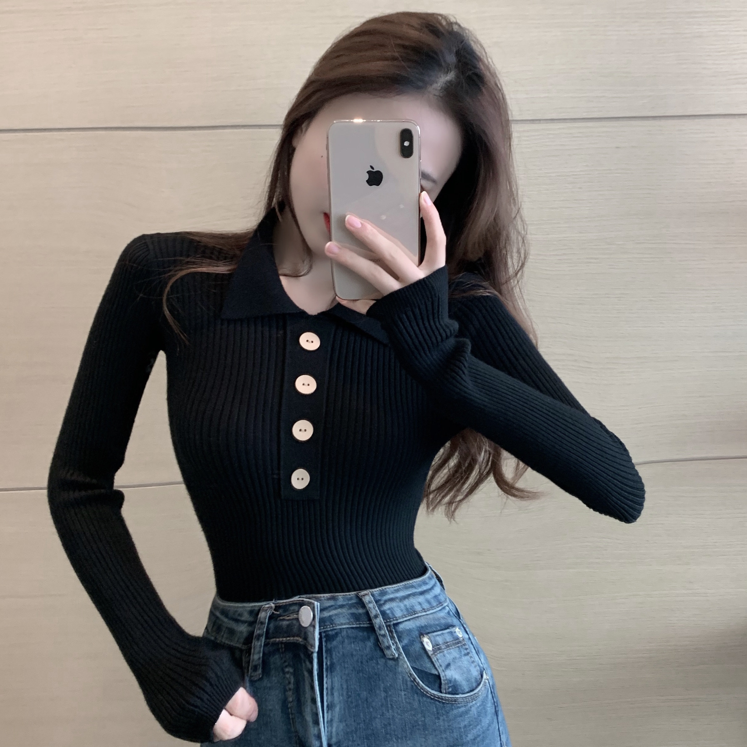 Демисезонный свитер, базовый приятный телу приталенный трикотажный лонгслив, в обтяжку, в западном стиле, воротник поло, с рукавом