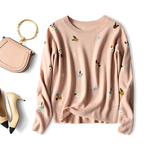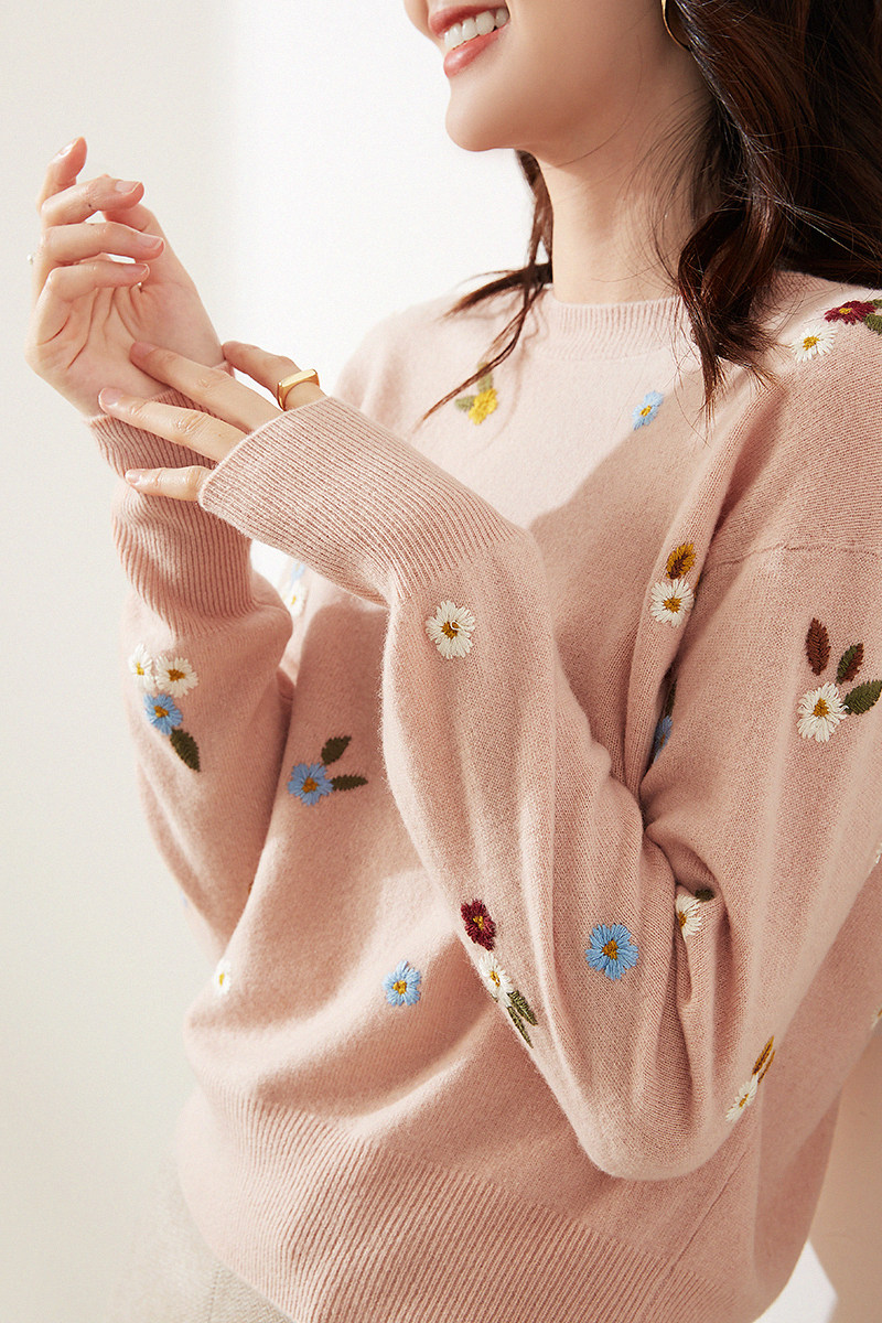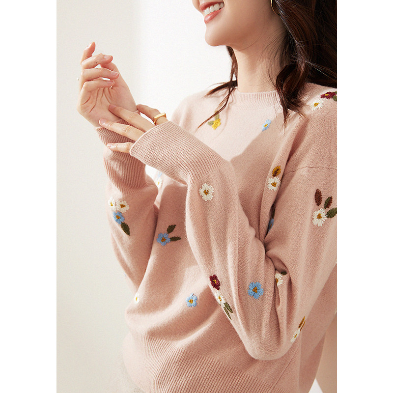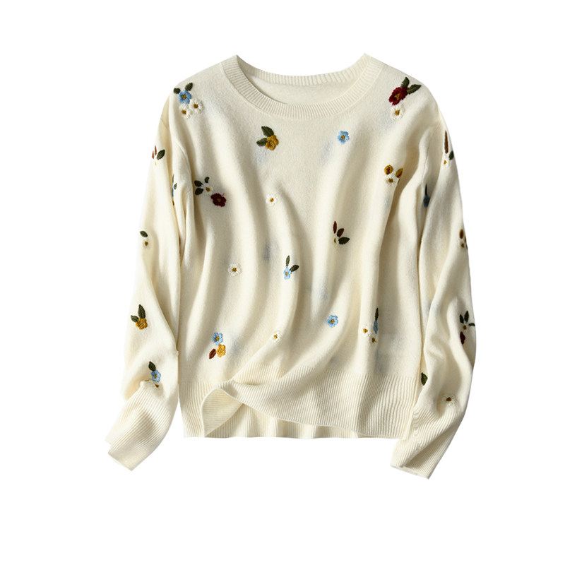 Качественный милый атмосферный свежий изысканный шерстяной трикотажный свитер с круглым воротником, с вышивкой