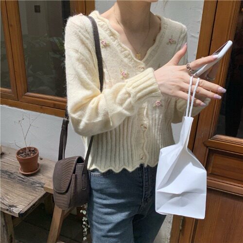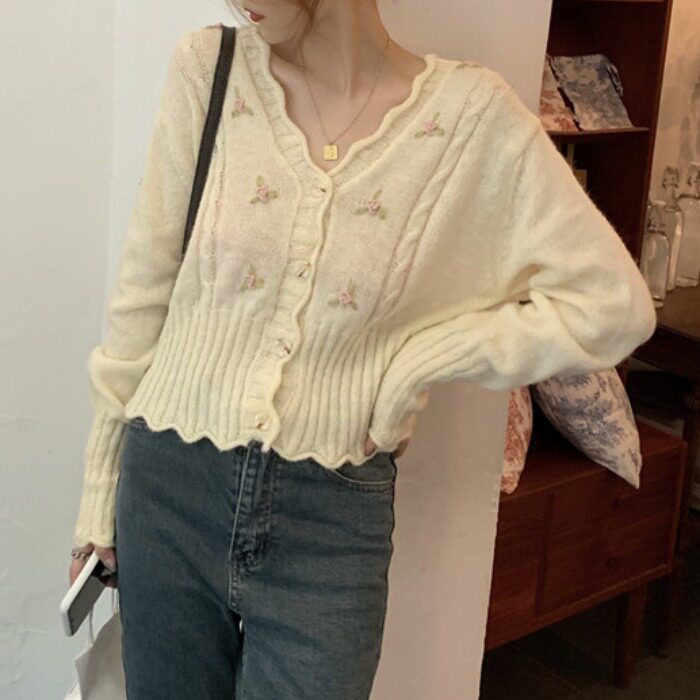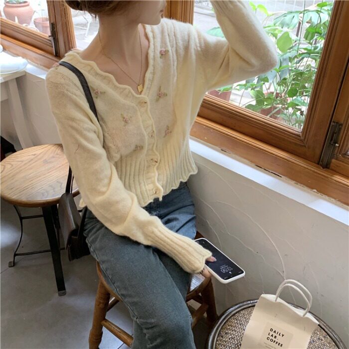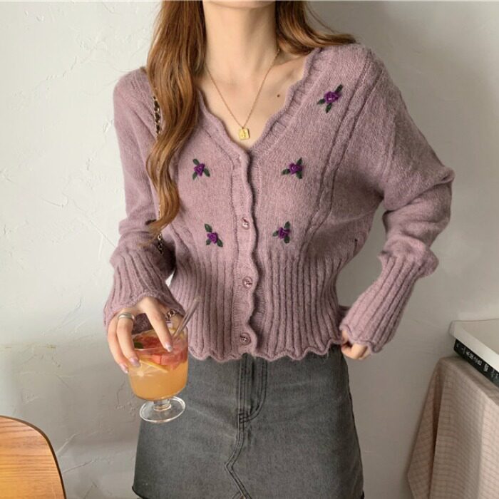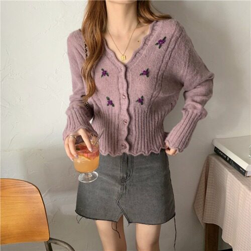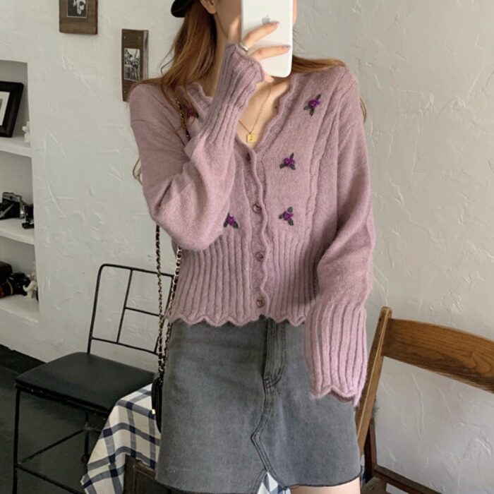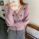 Осенний свитер, ретро короткий сиреневый трикотажный кардиган, V-образный вырез, в корейском стиле