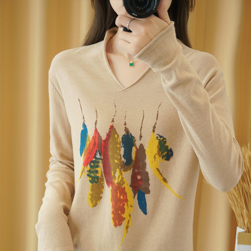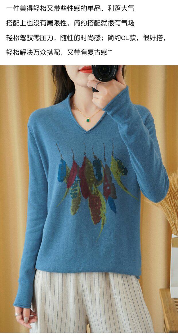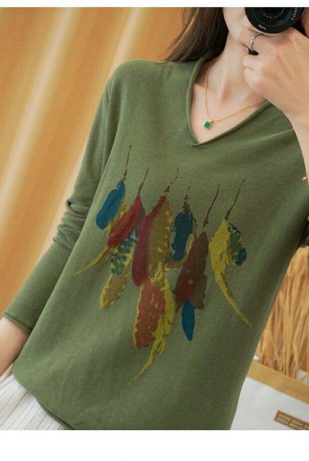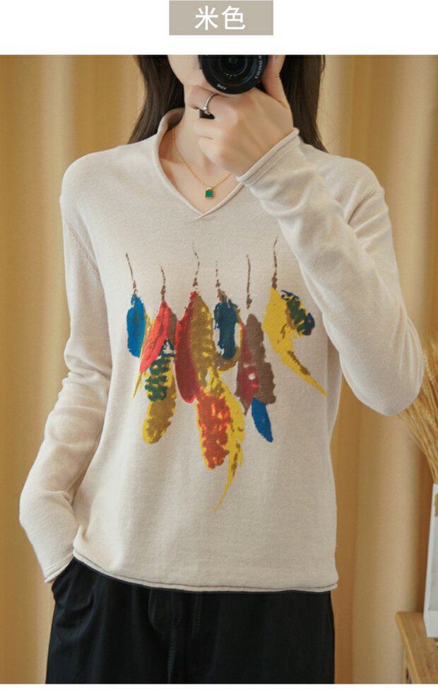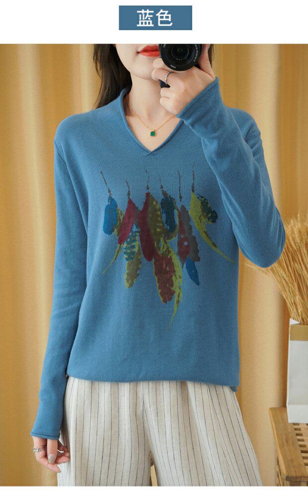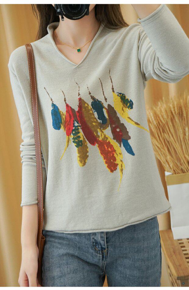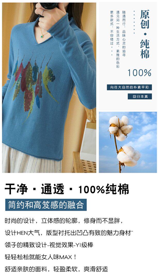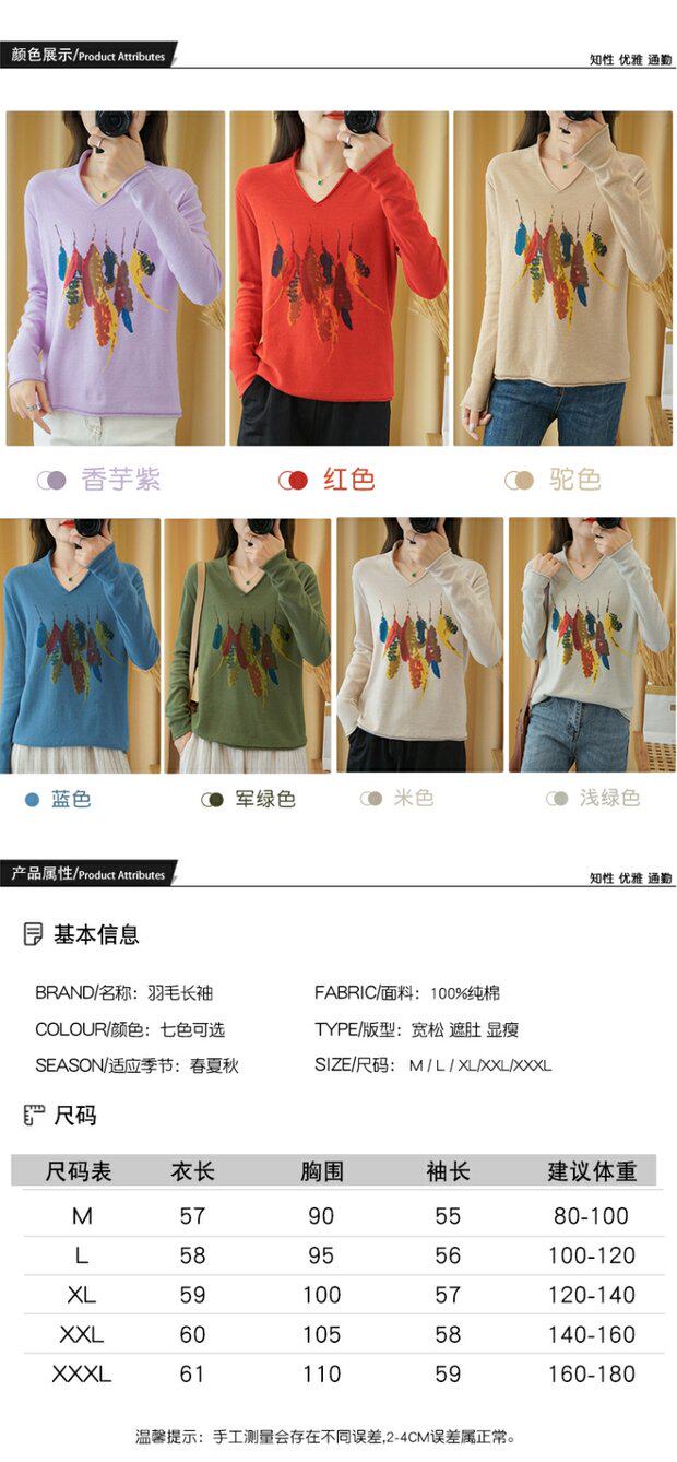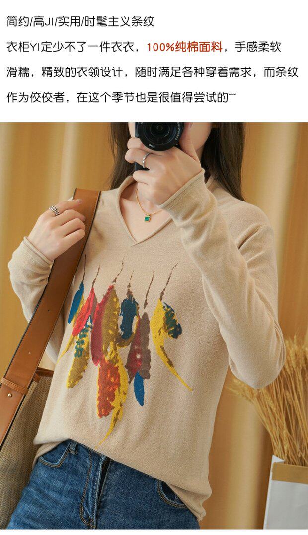 Демисезонный хлопковый трикотажный свитер, базовый лонгслив, 2020, V-образный вырез, набивка пером, свободный крой, из хлопка и льна