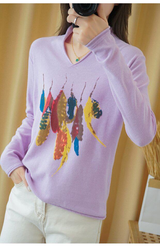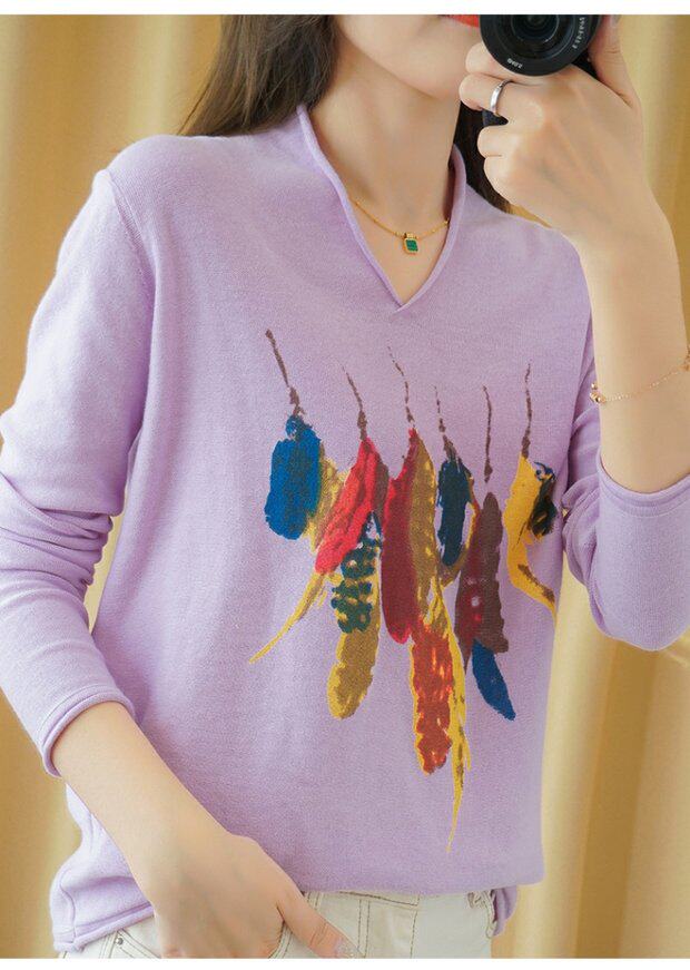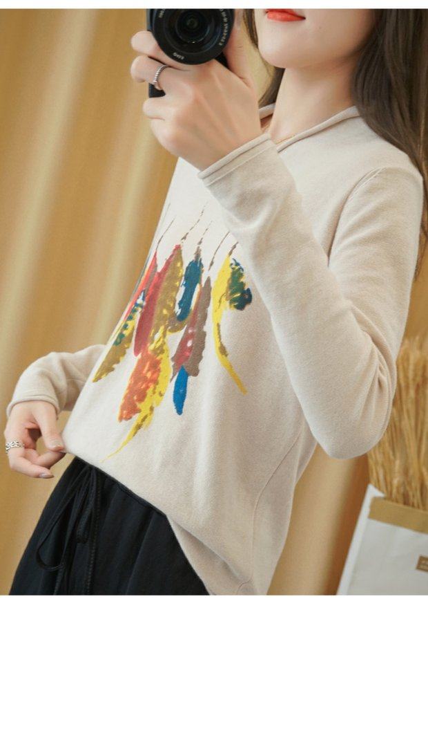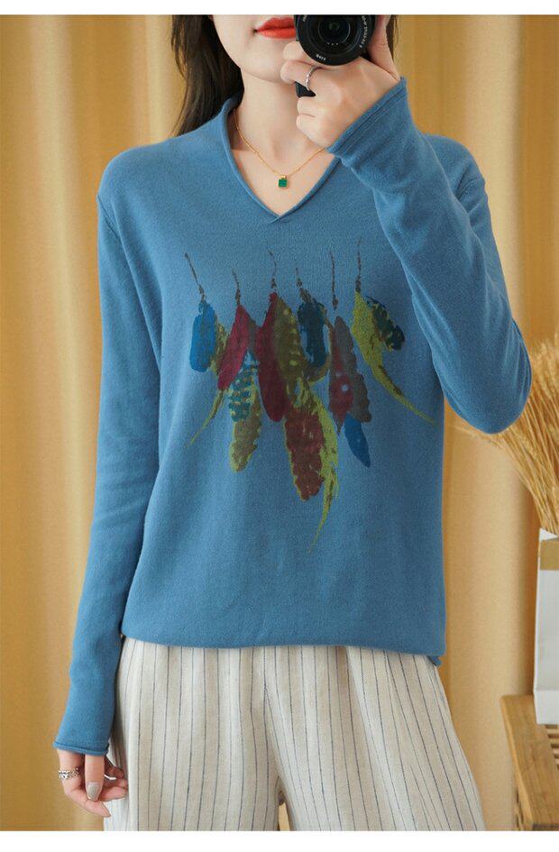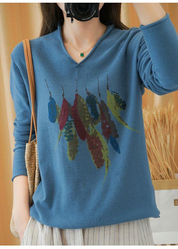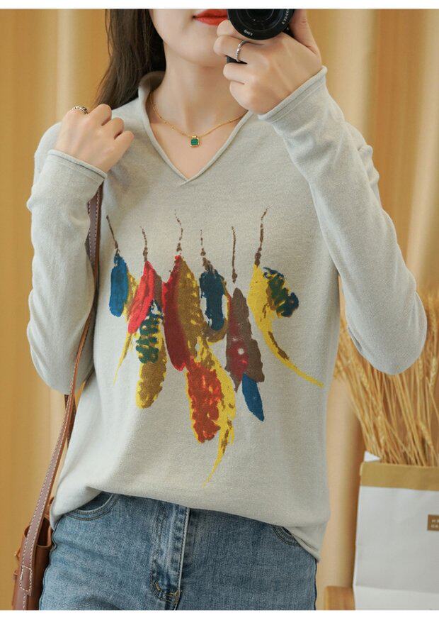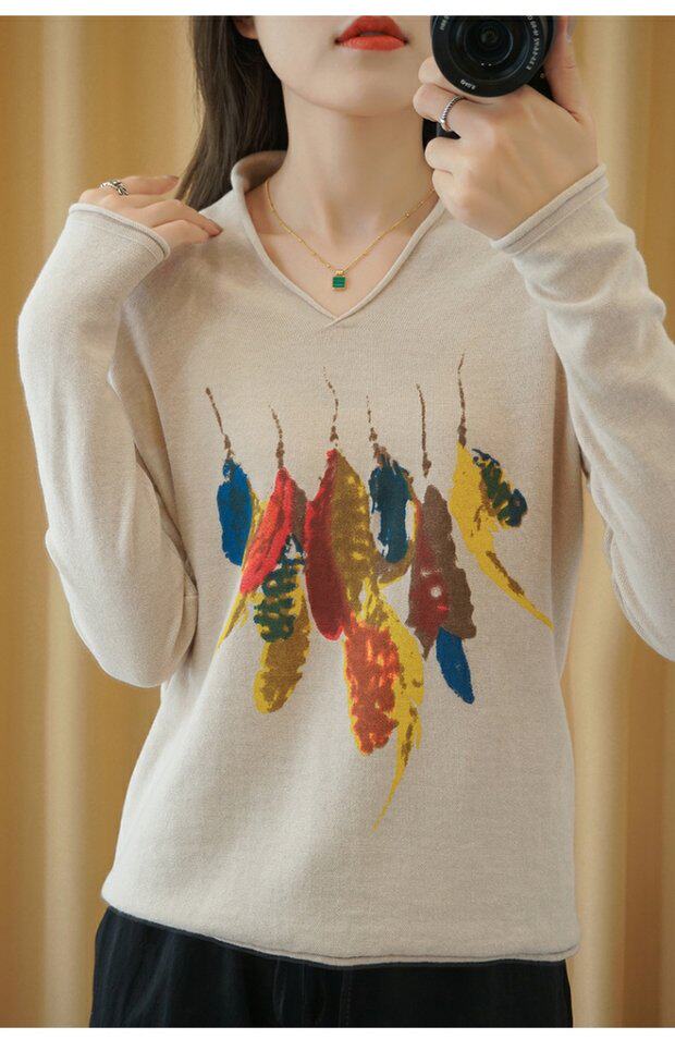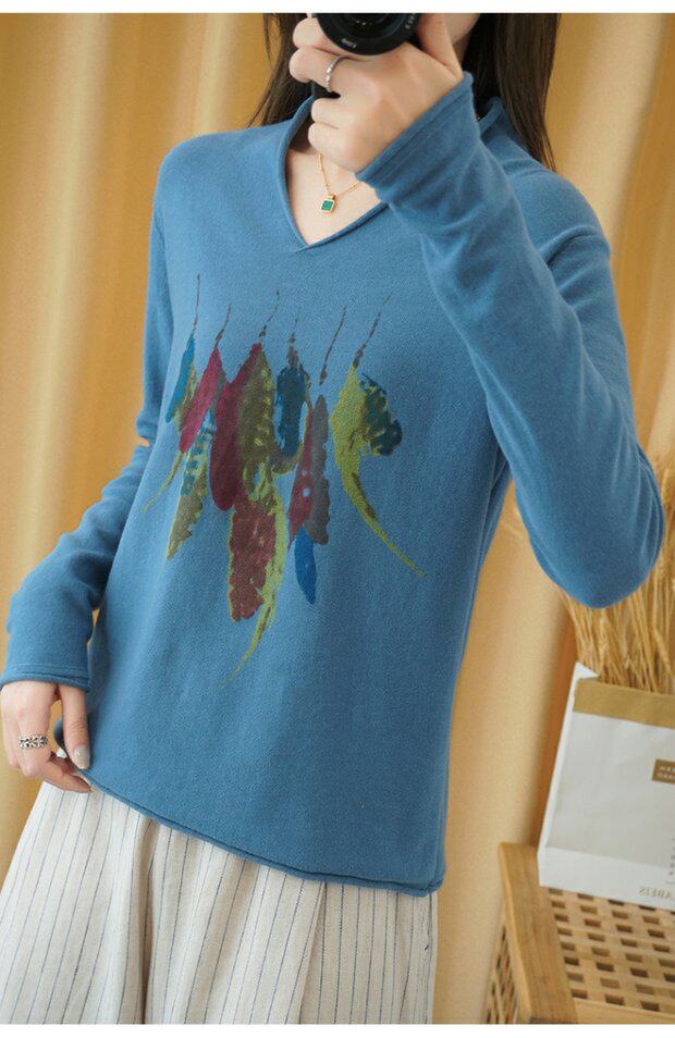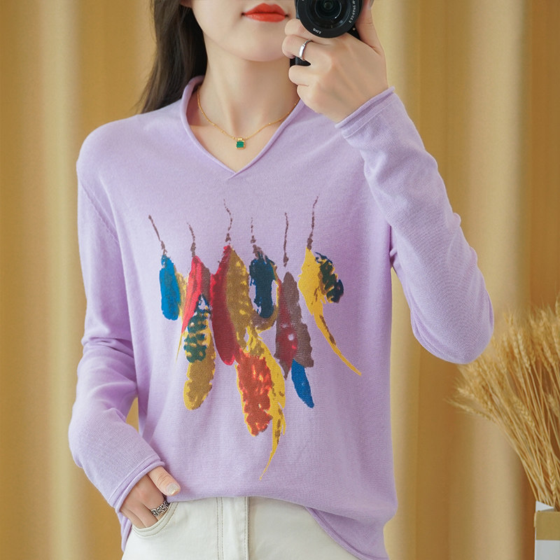Демисезонный хлопковый трикотажный свитер, базовый лонгслив, 2020, V-образный вырез, набивка пером, свободный крой, из хлопка и льна