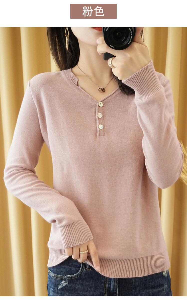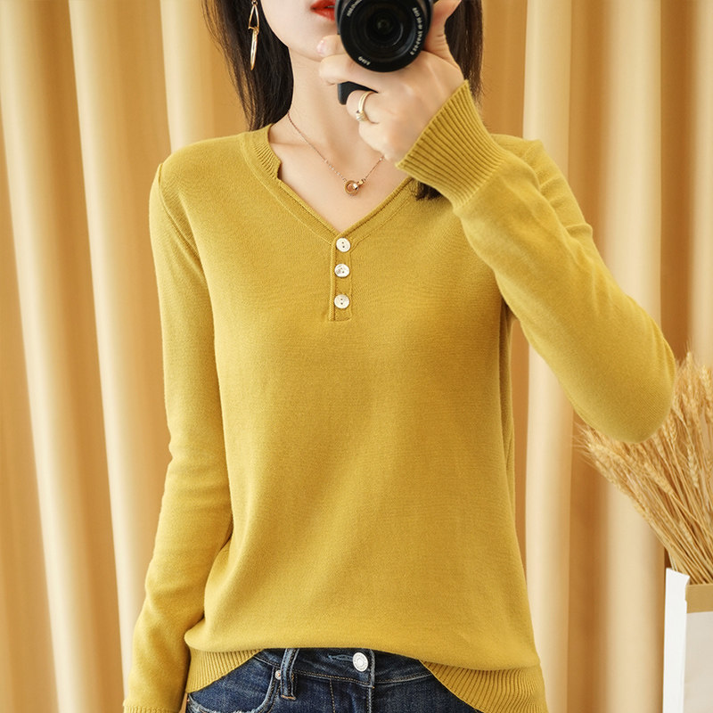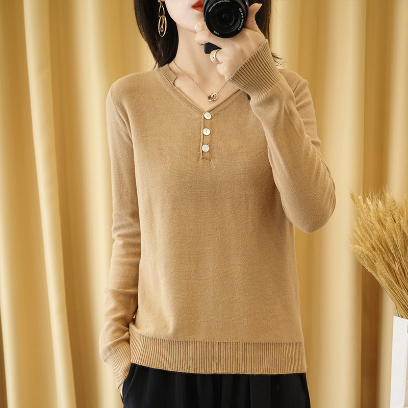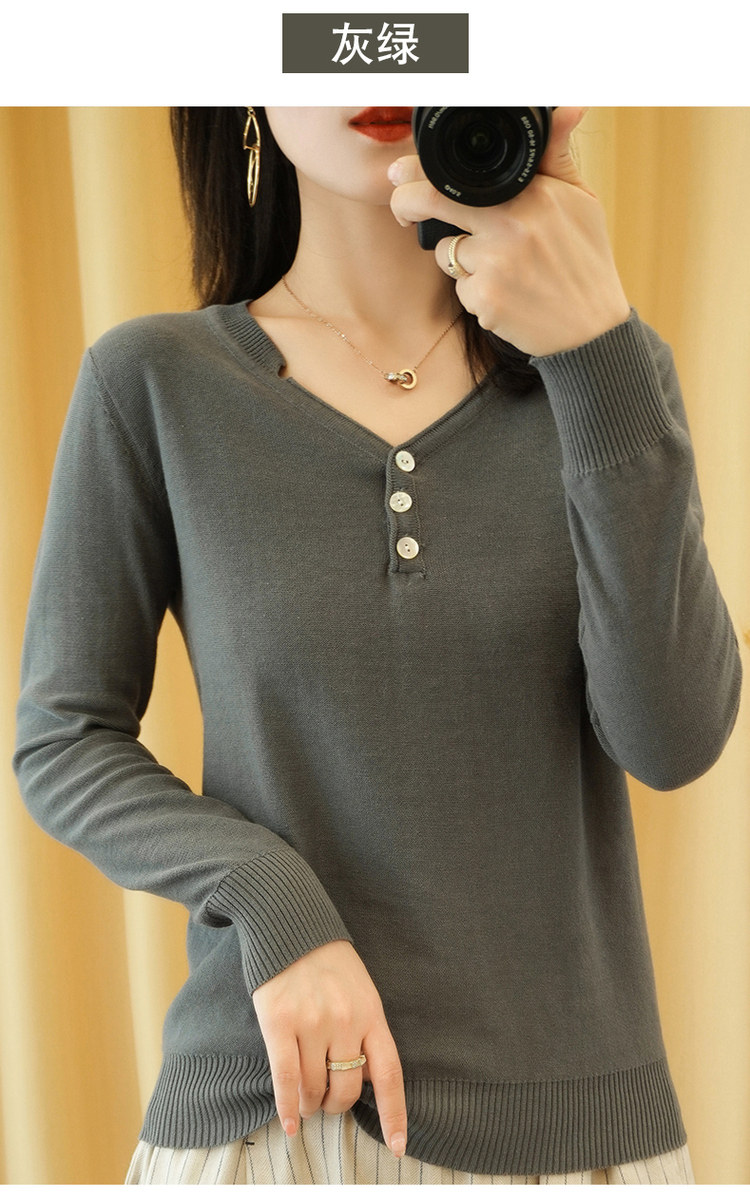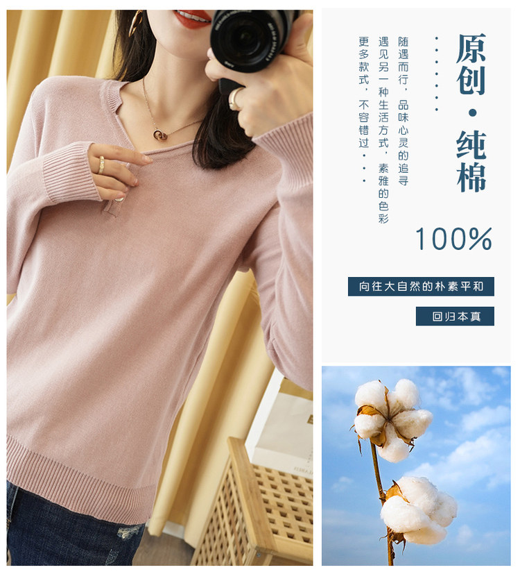 Осенний хлопковый лонгслив, трикотажный свитер, V-образный вырез, свободный крой, 100% хлопок, из хлопка и льна
