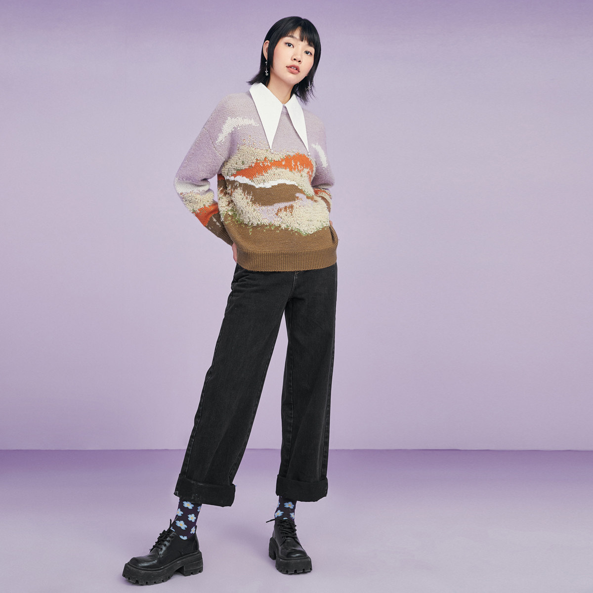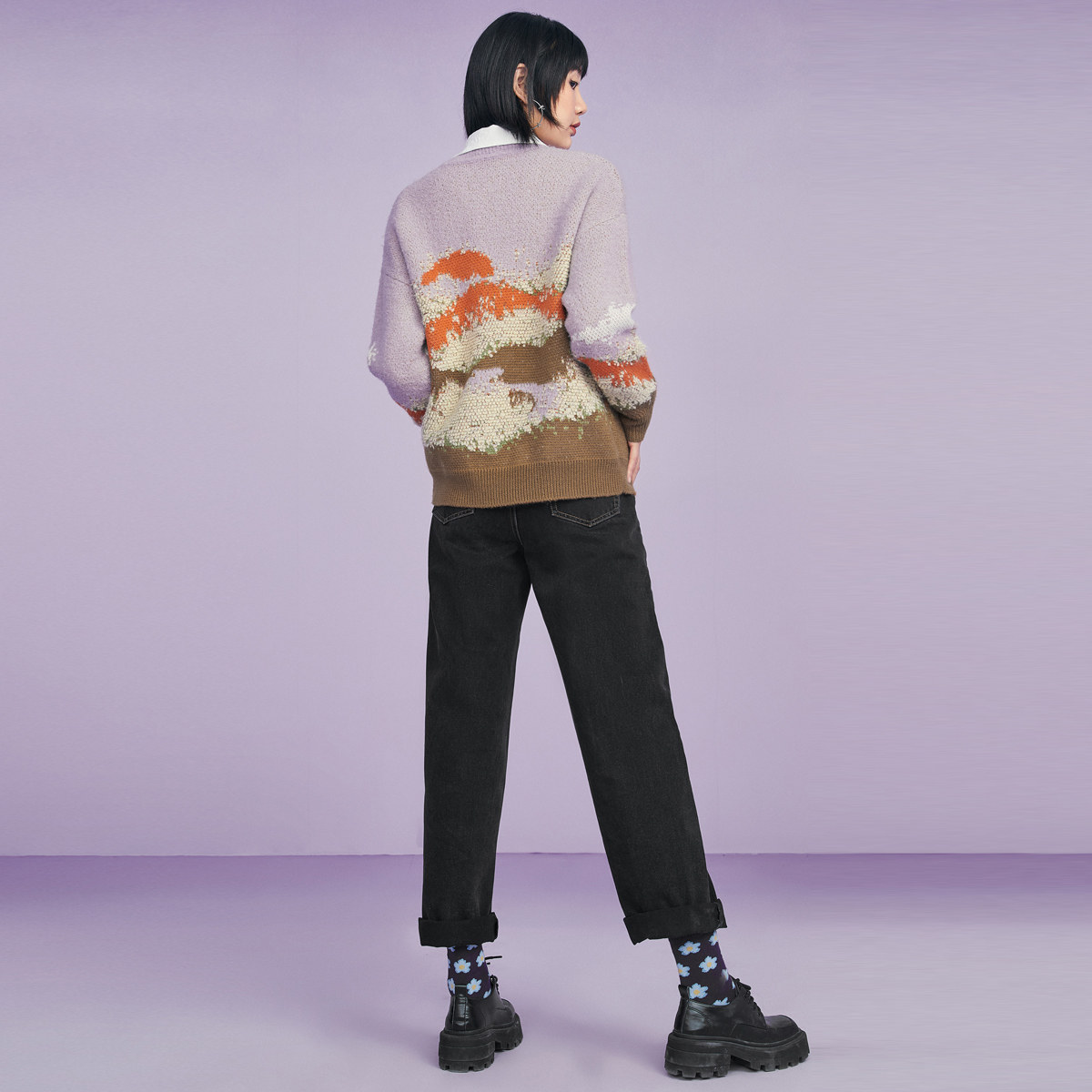 Зимний сиреневый трикотажный свитер с круглым воротником, оверсайз