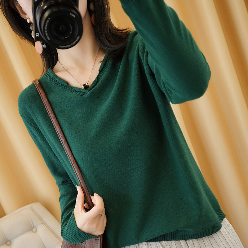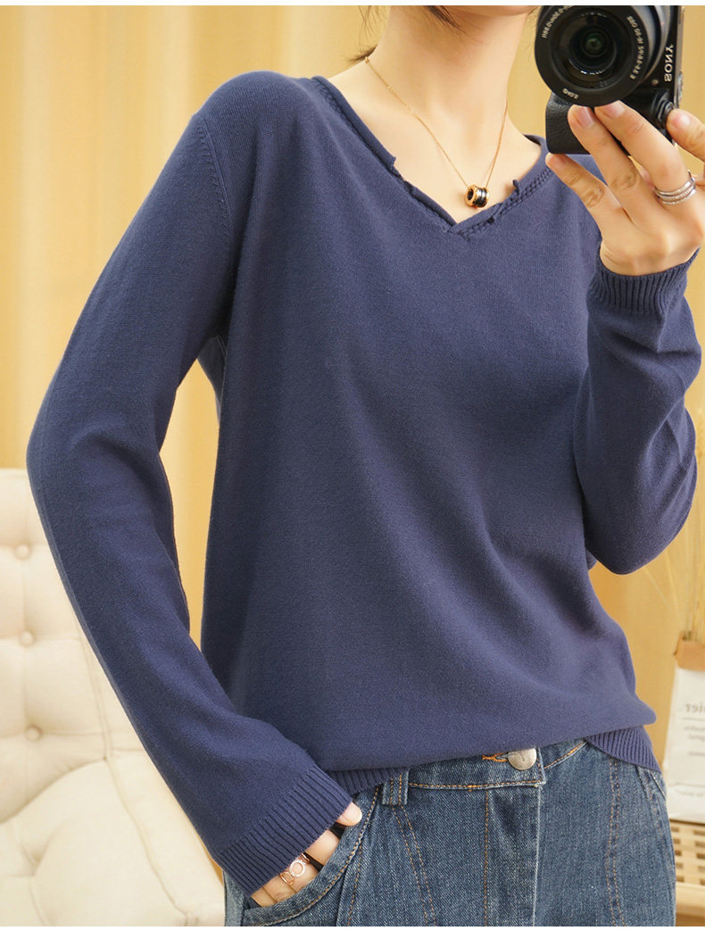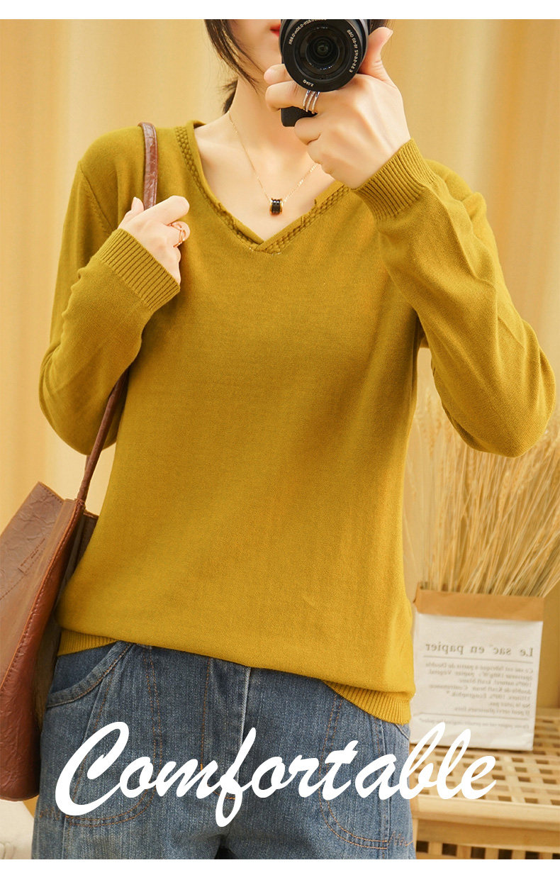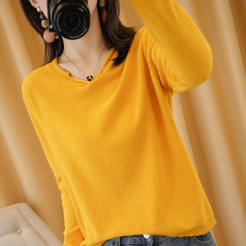 Хлопковый трикотажный свитер, базовый приятный телу лонгслив, 2020, V-образный вырез, из хлопка и льна, большой размер