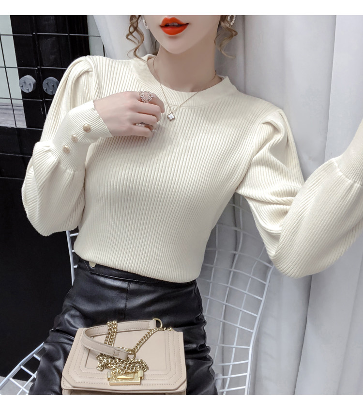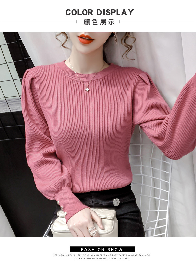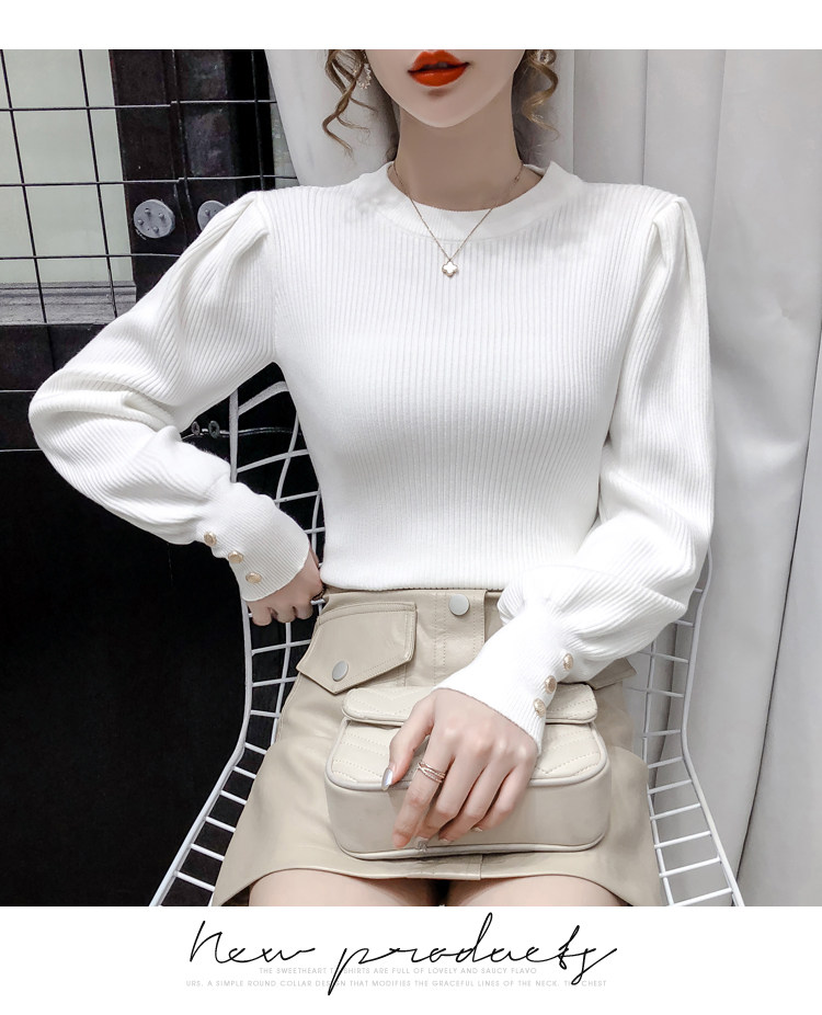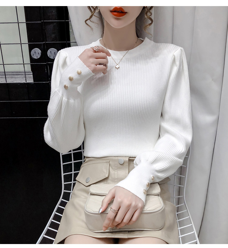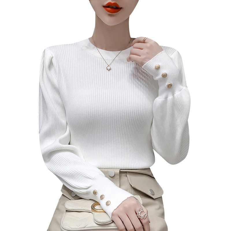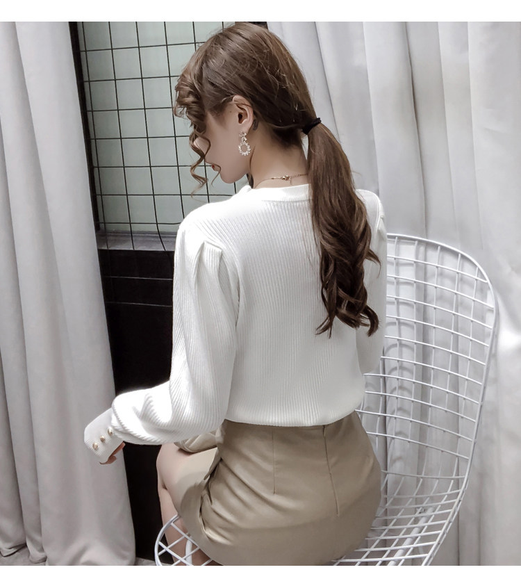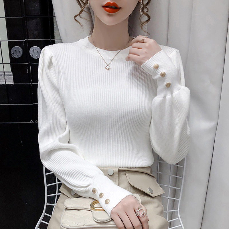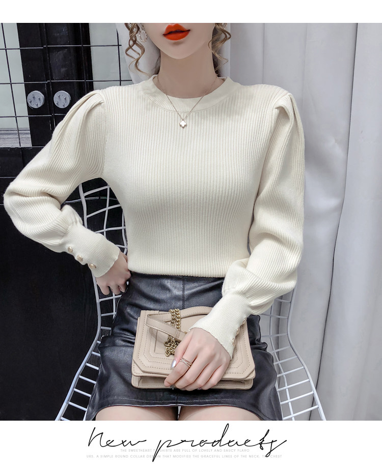 Трикотажный демисезонный свитер, приталенная базовая приятная телу футболка, 2020 года, в корейском стиле, в западном стиле, рукава фонарики
