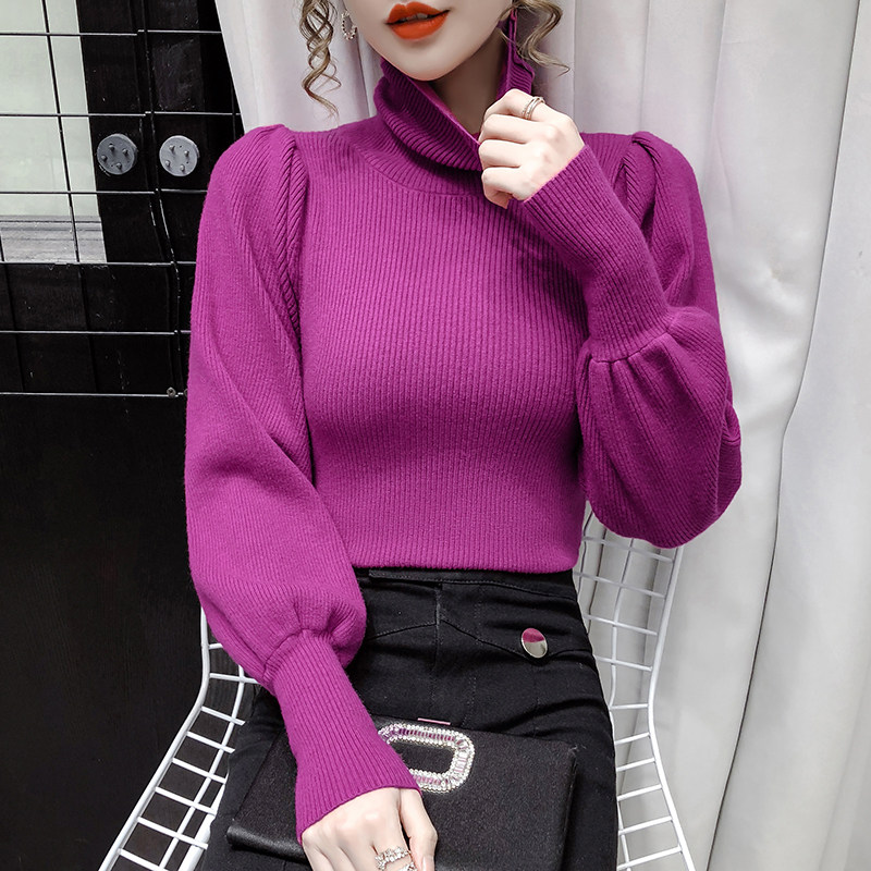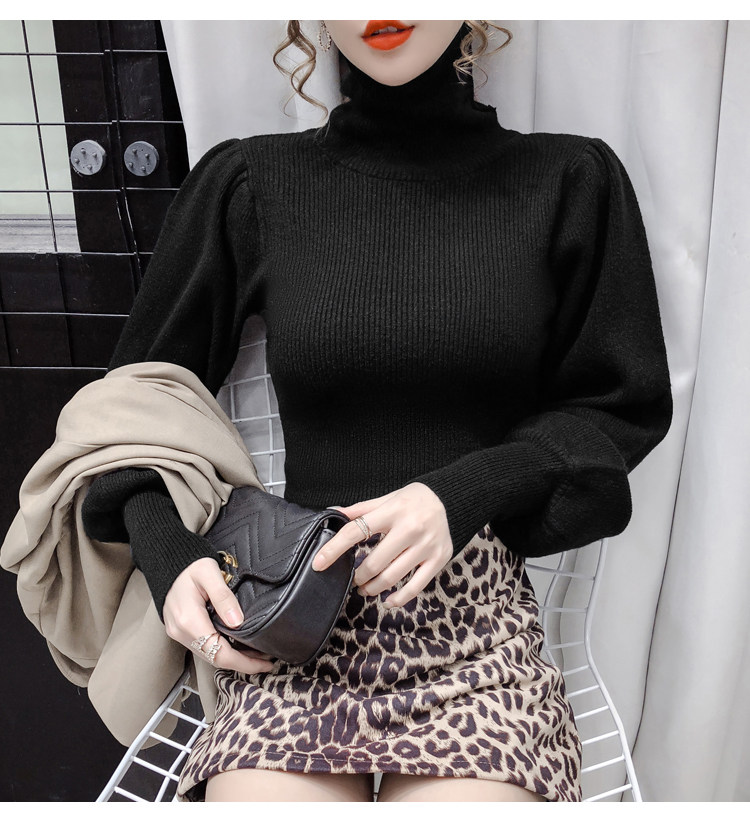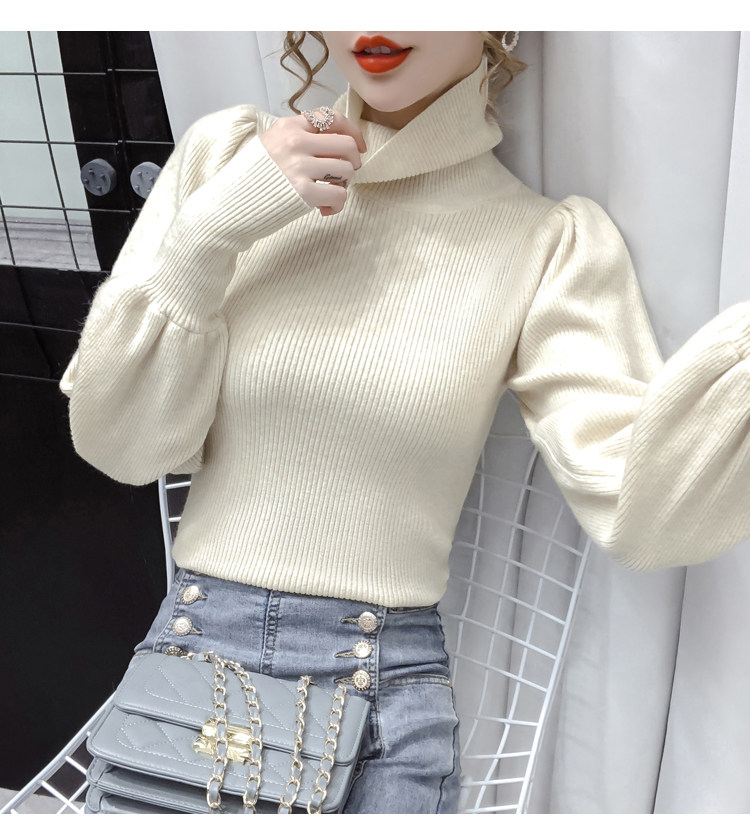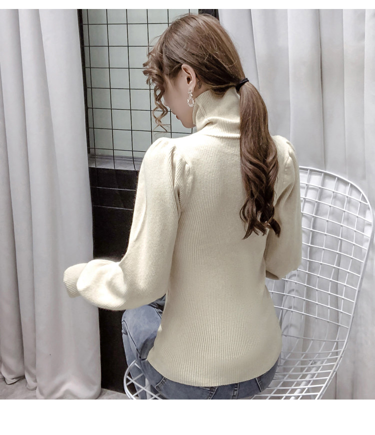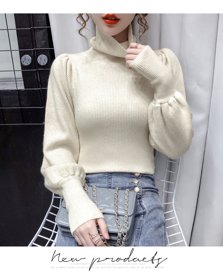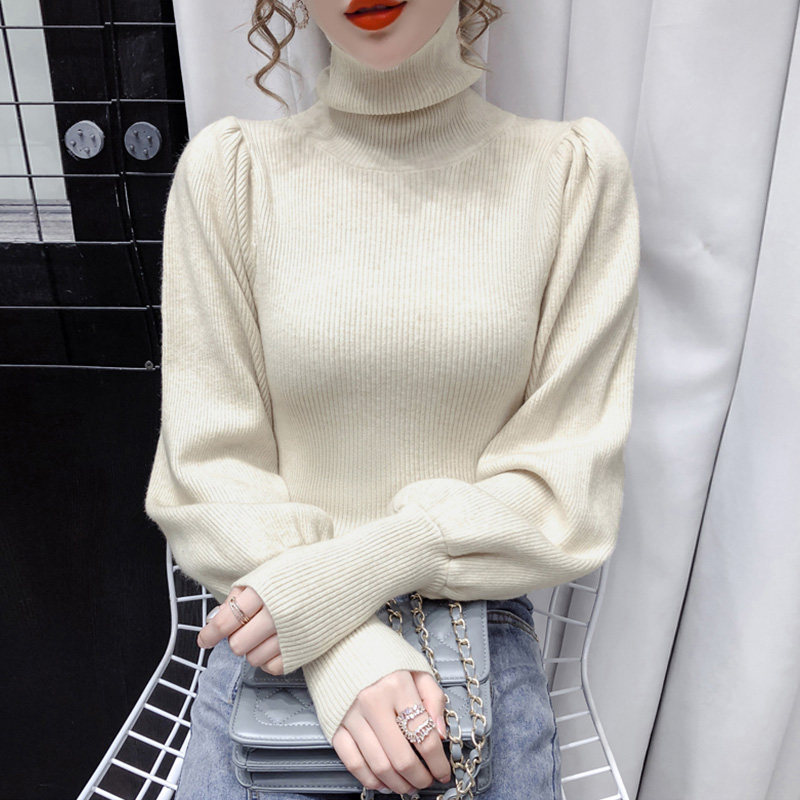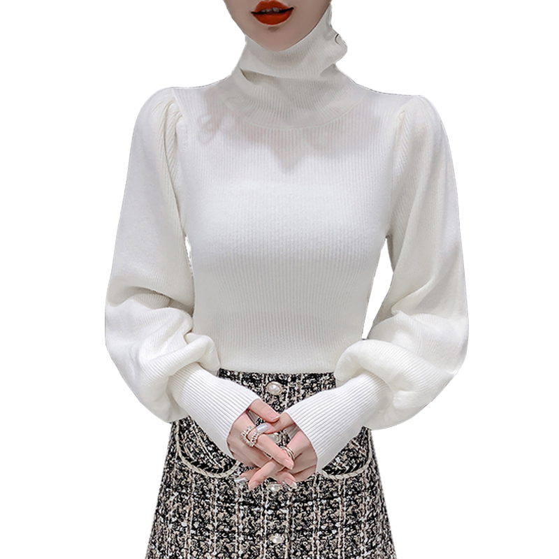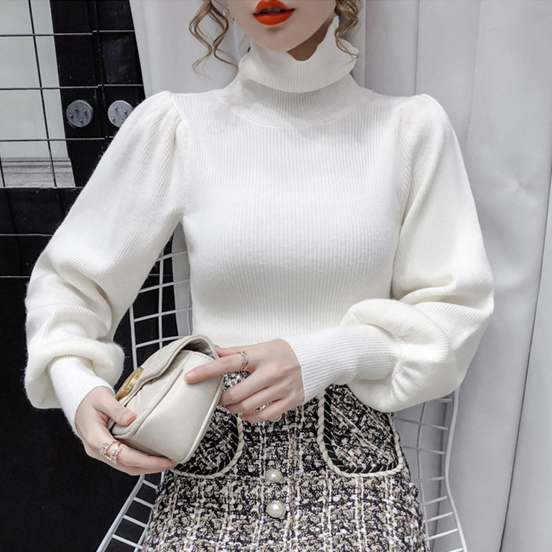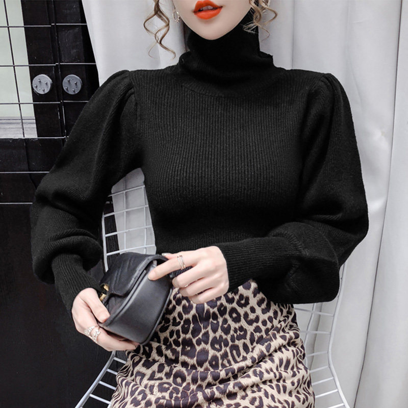 Демисезонный базовый трикотажный свитер, коллекция 2021, в корейском стиле, рукава фонарики, облегающий крой, в западном стиле