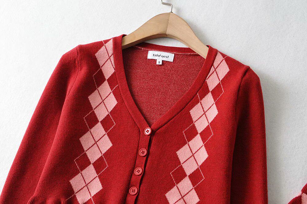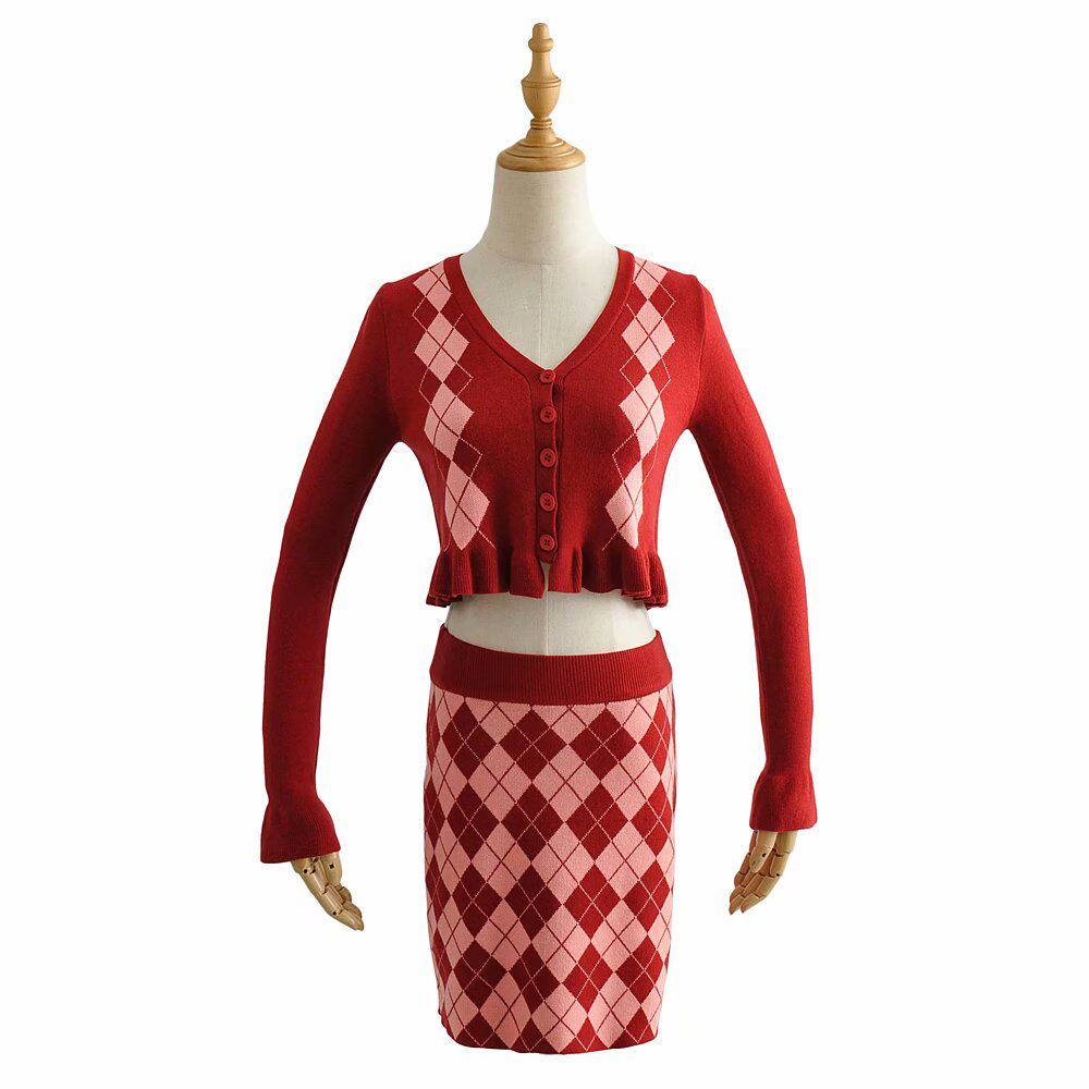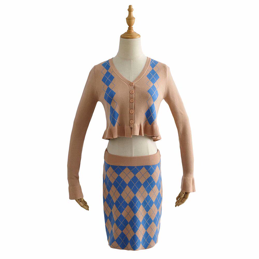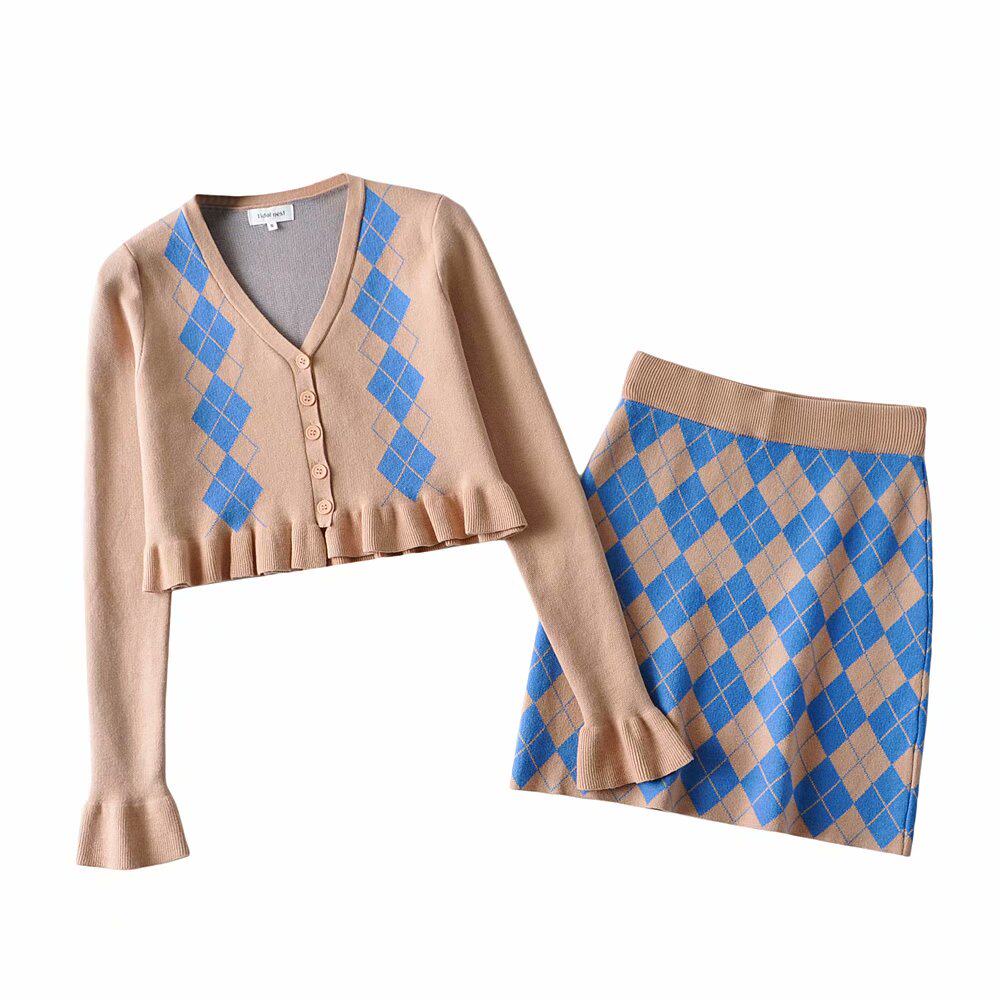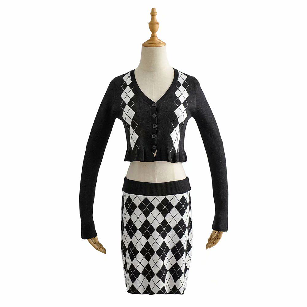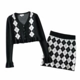 Демисезонный ретро трикотажный короткий кардиган с ромбовидным узором, юбка, европейский стиль