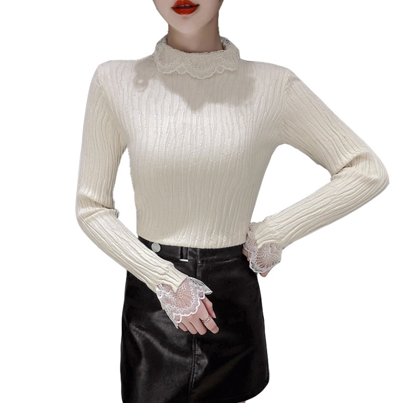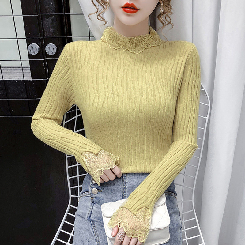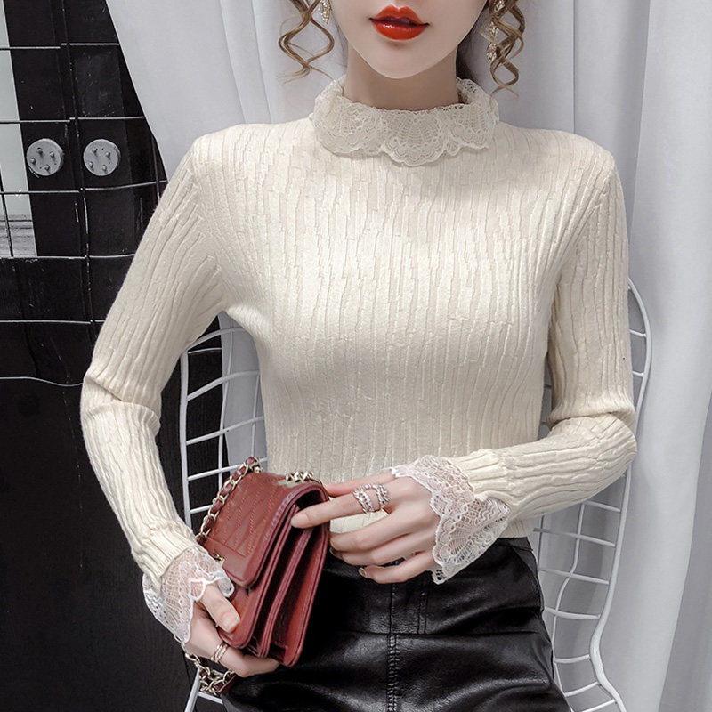 Демисезонный кружевной трикотажный лонгслив, базовый приятный телу свитер, 2020, облегающий крой, в корейском стиле