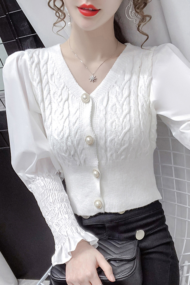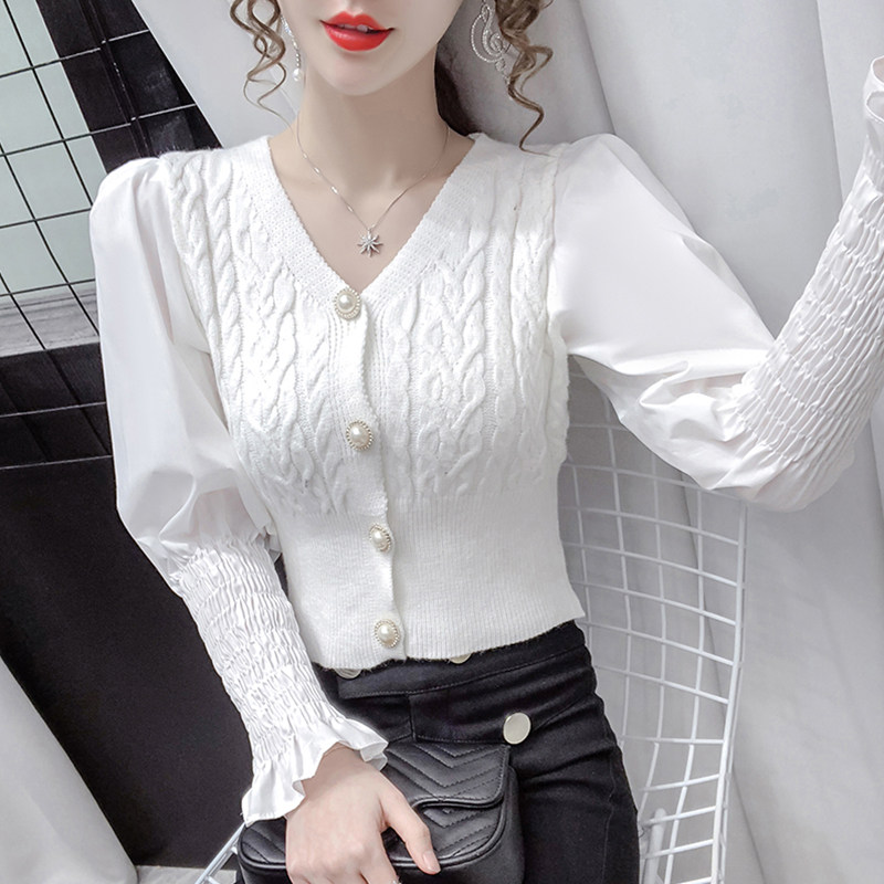 Короткий трикотажный базовый кардиган, свитер, коллекция 2021, в западном стиле, рукава фонарики, облегающий крой