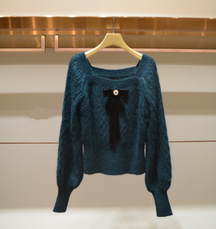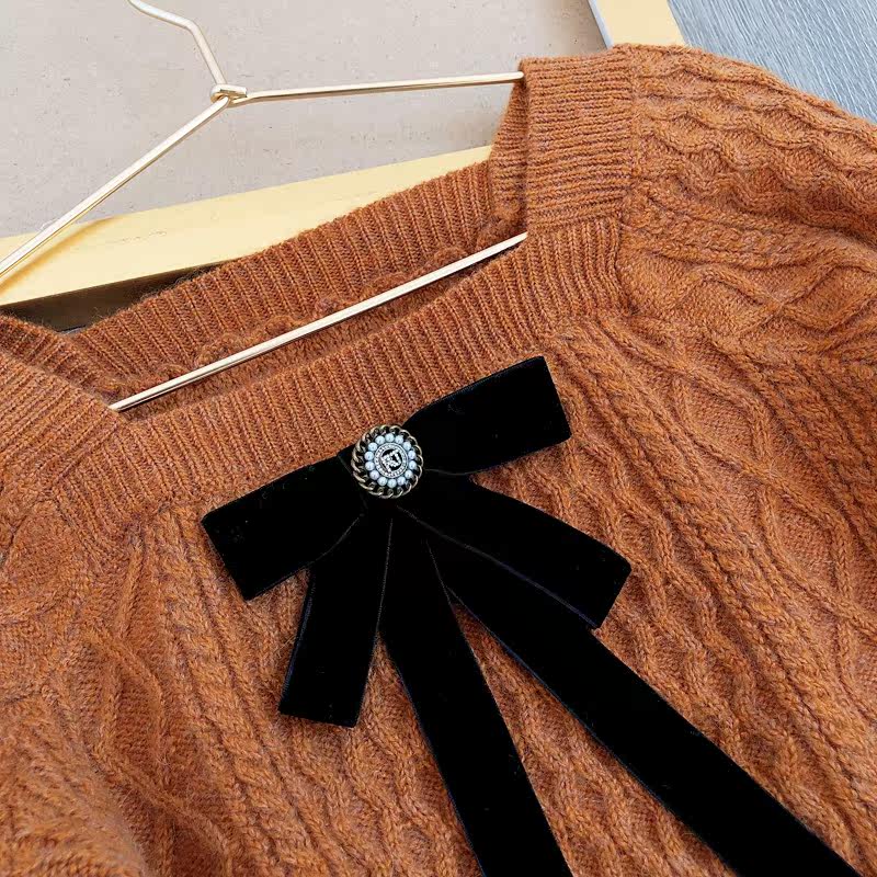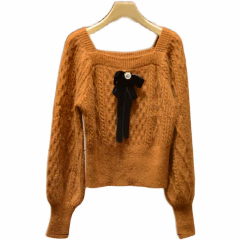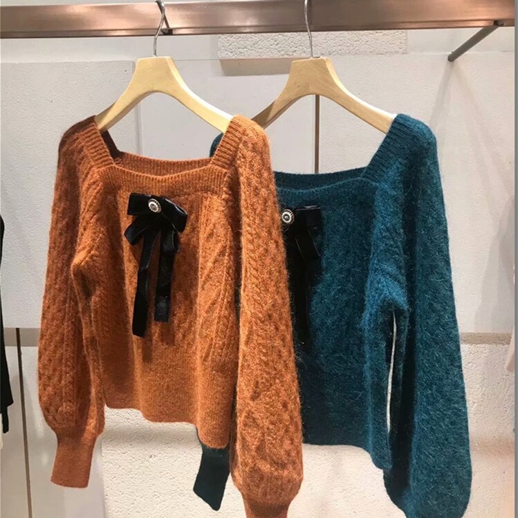 Ретро лонгслив с ромбовидным узором, бархатный трикотажный свитер с бантиком, французский стиль, квадратный вырез