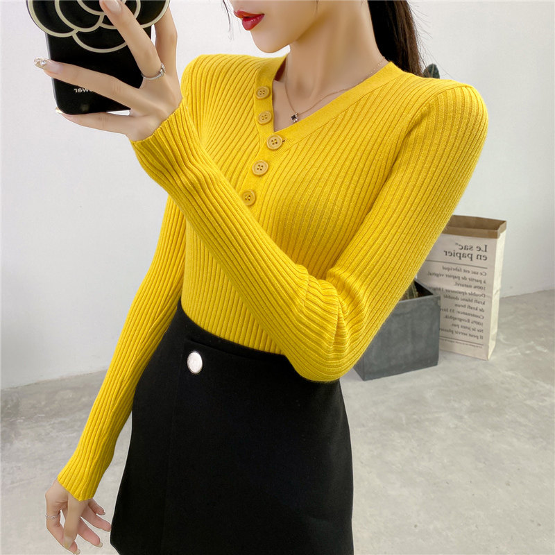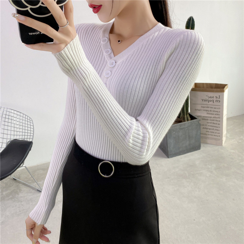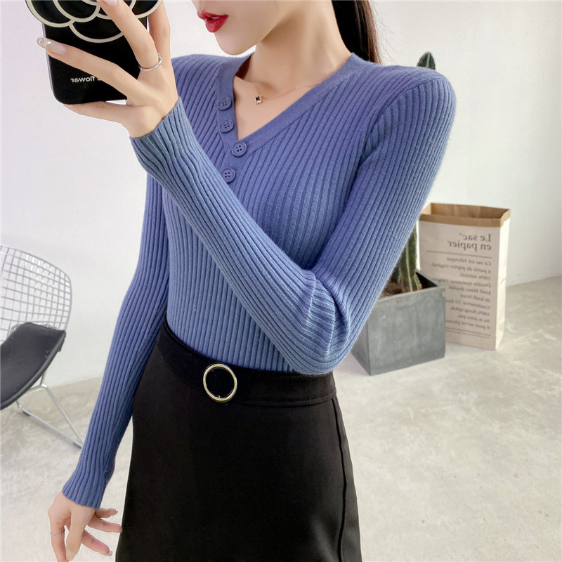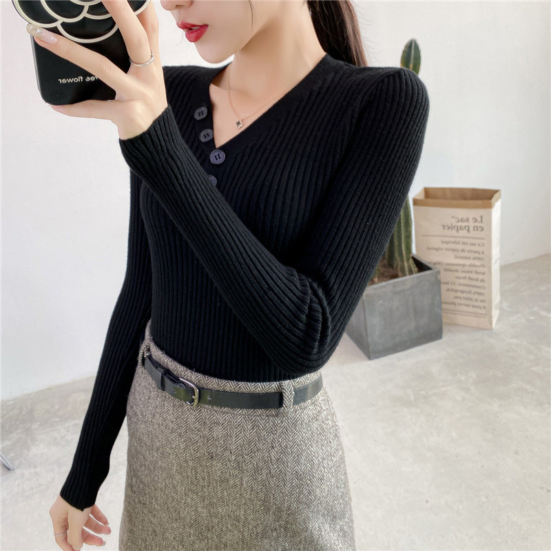 Демисезонный трикотажный лонгслив, тонкий свитер, облегающий крой, в обтяжку, V-образный вырез