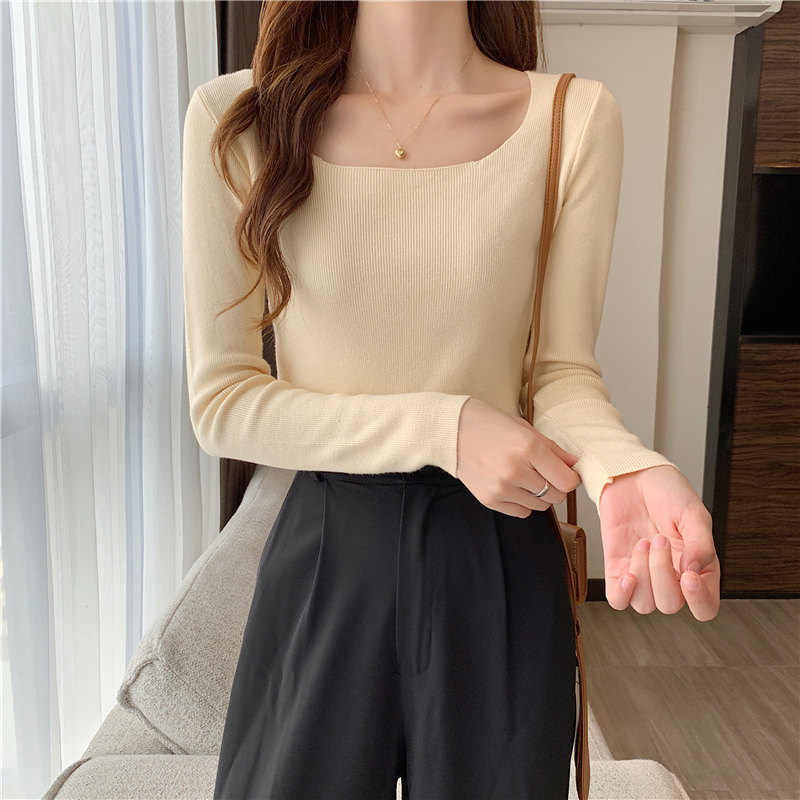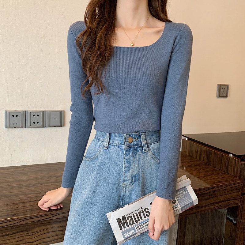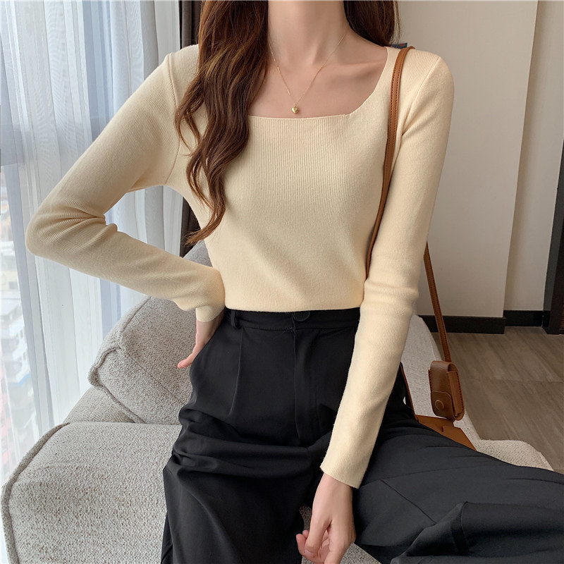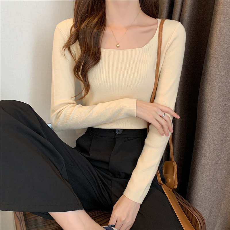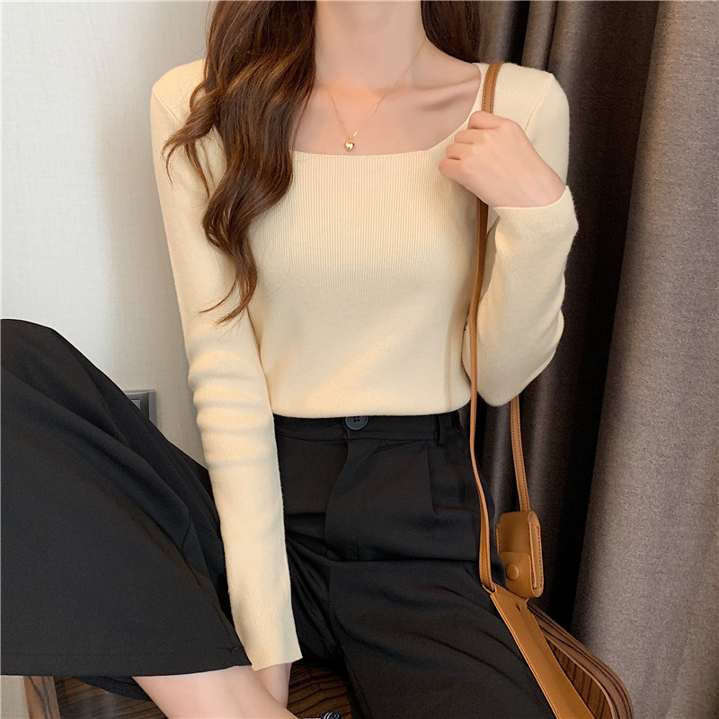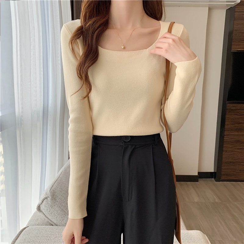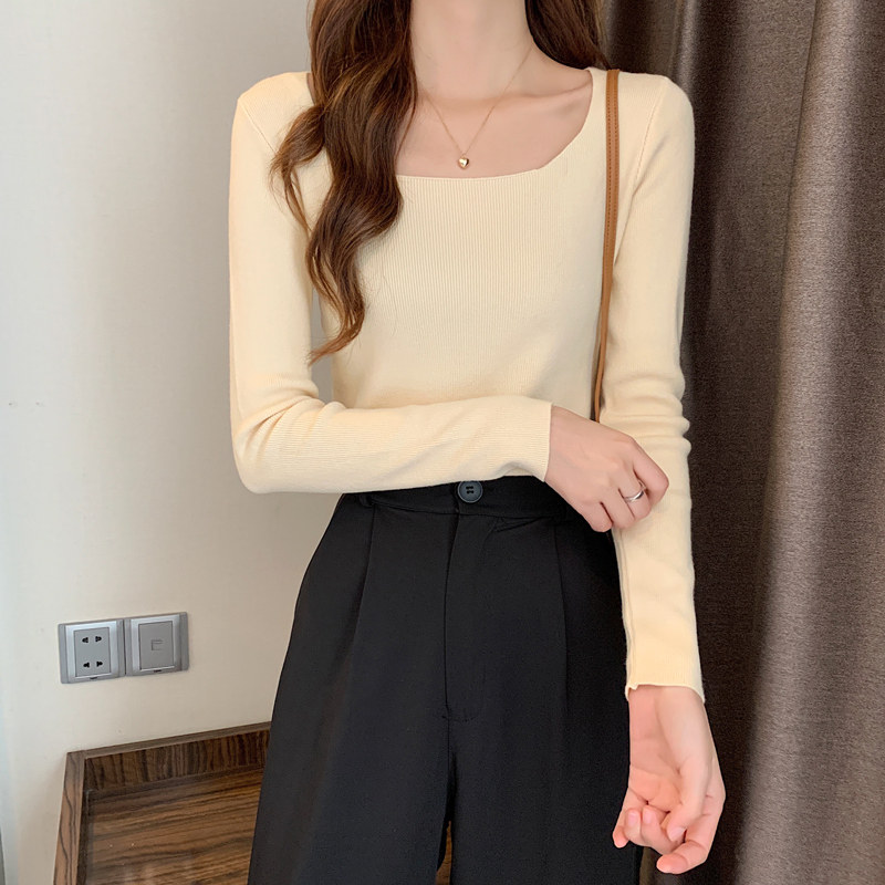 Демисезонный приталенный лонгслив, трикотажный свитер, квадратный вырез, в западном стиле, французский стиль