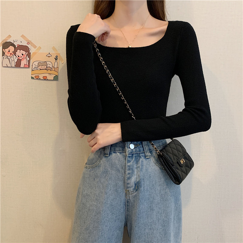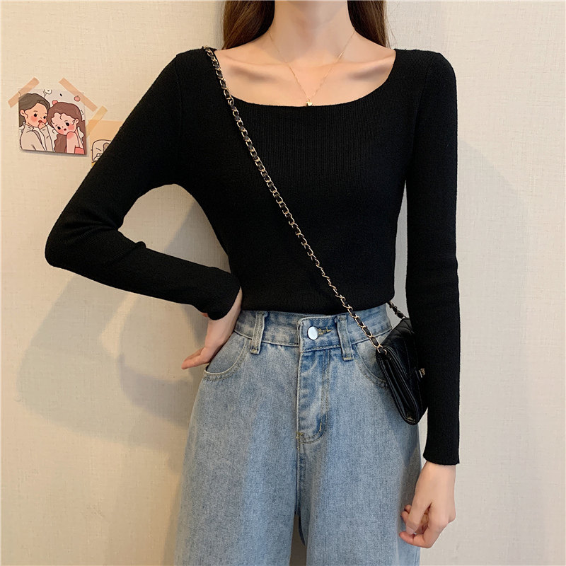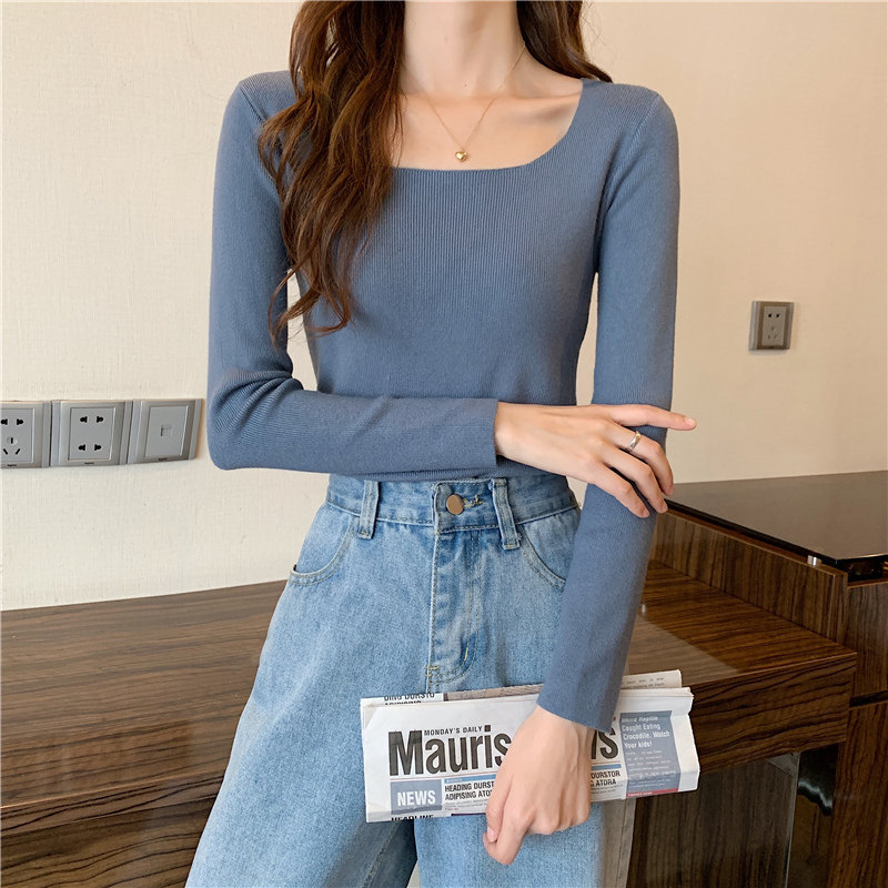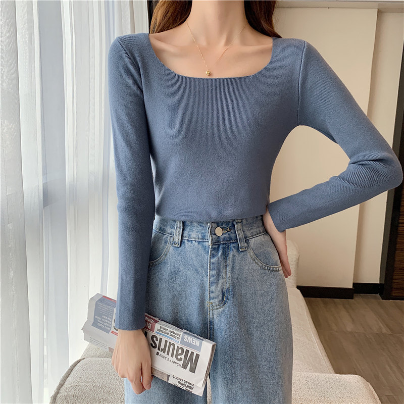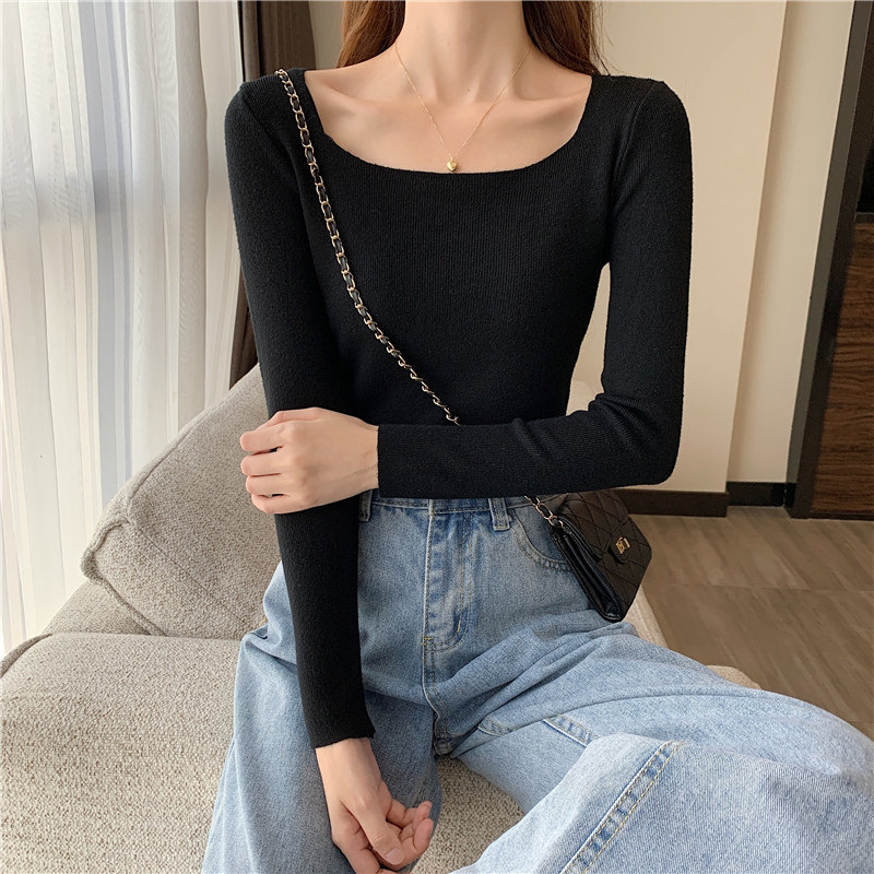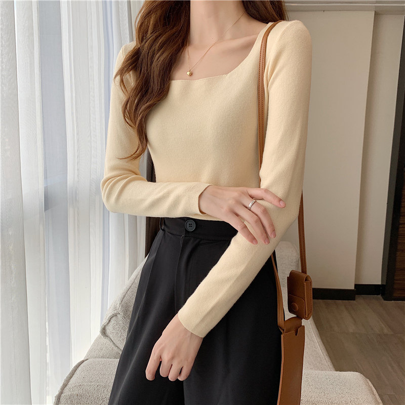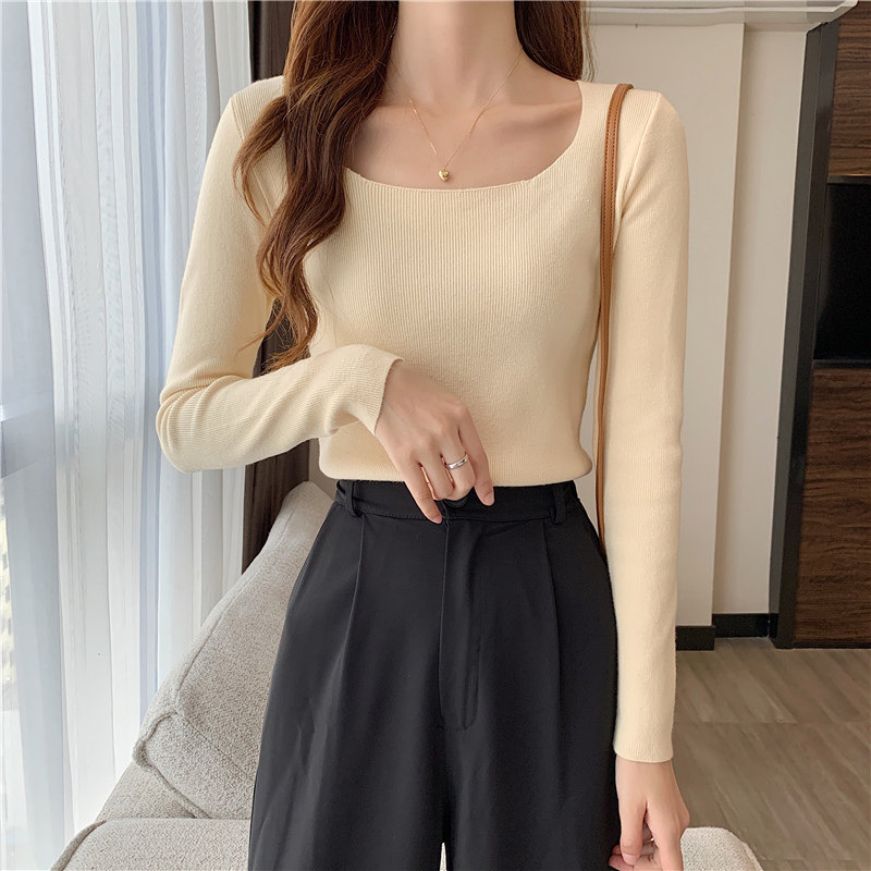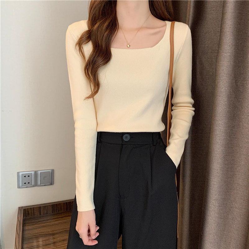 Демисезонный приталенный лонгслив, трикотажный свитер, квадратный вырез, в западном стиле, французский стиль